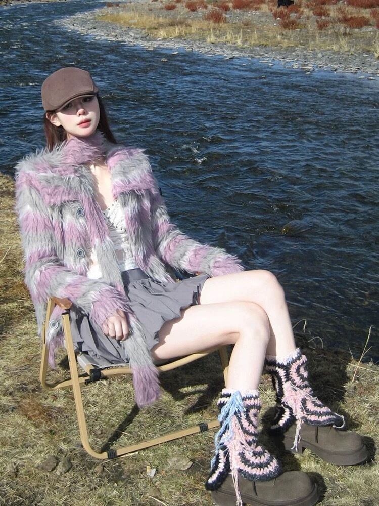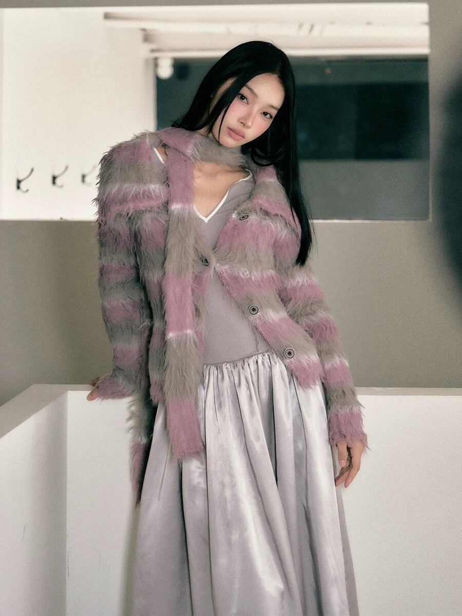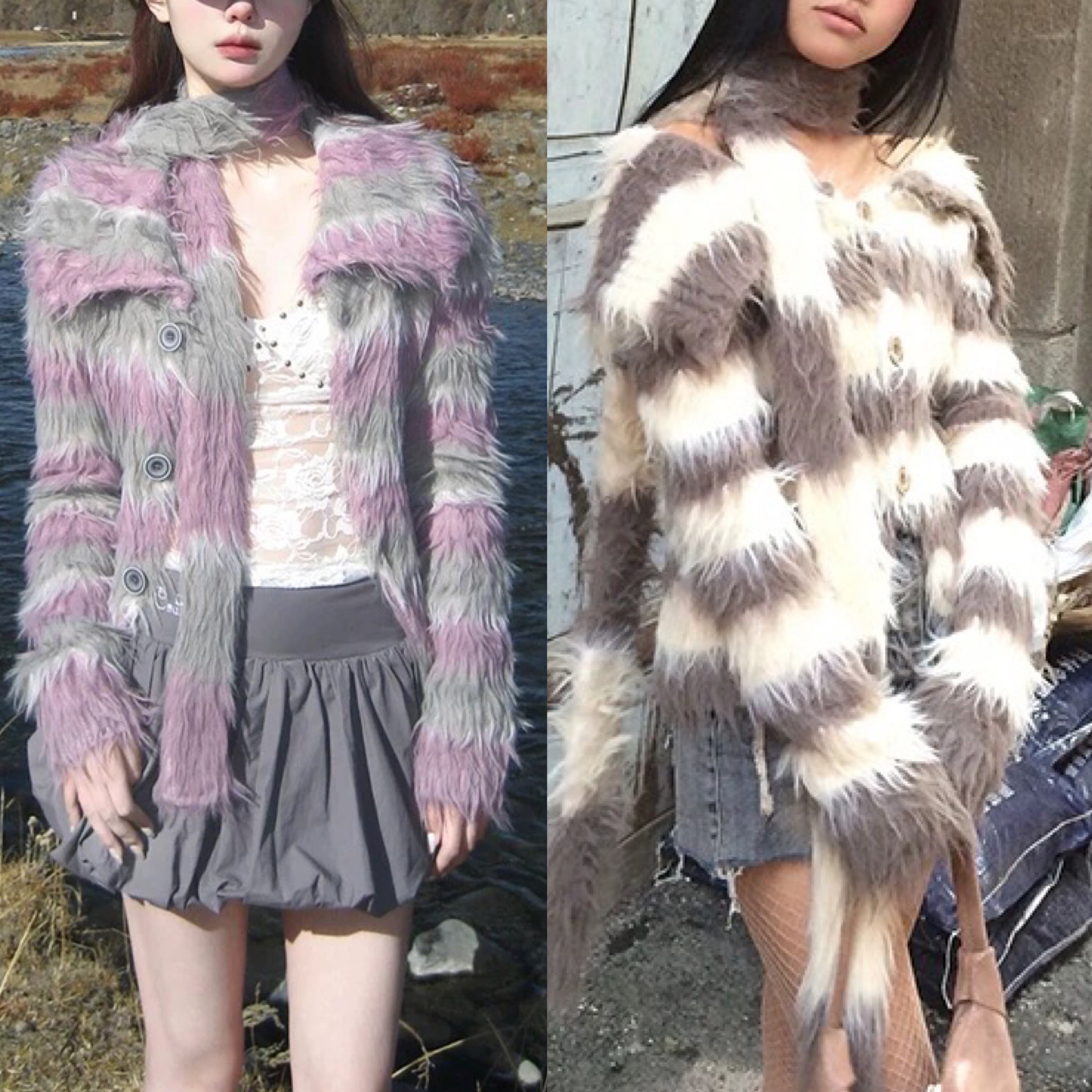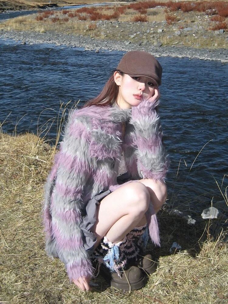 カーディガン ボーダー モヘア 紫 ベージュ チェック ニット セーター