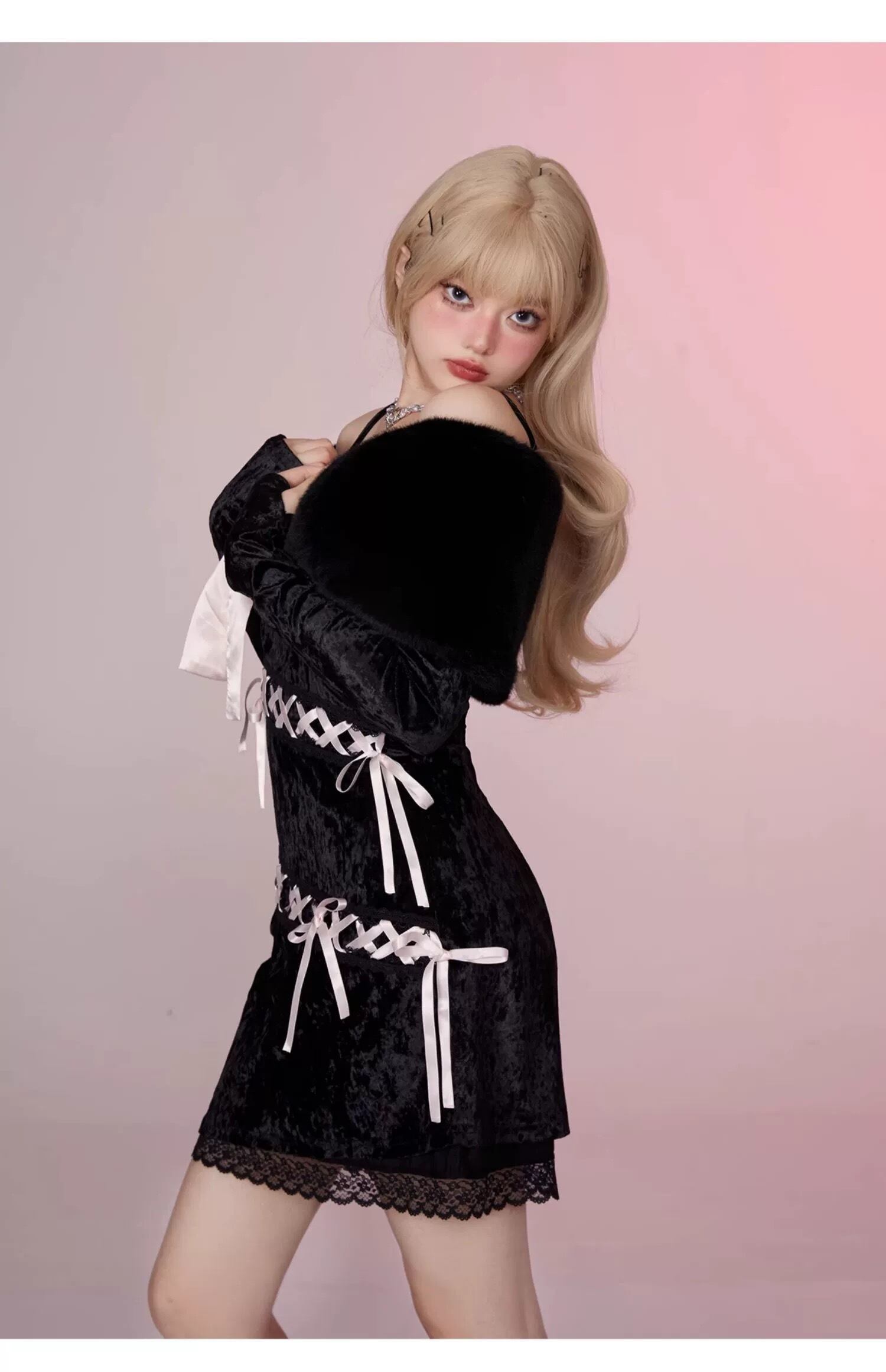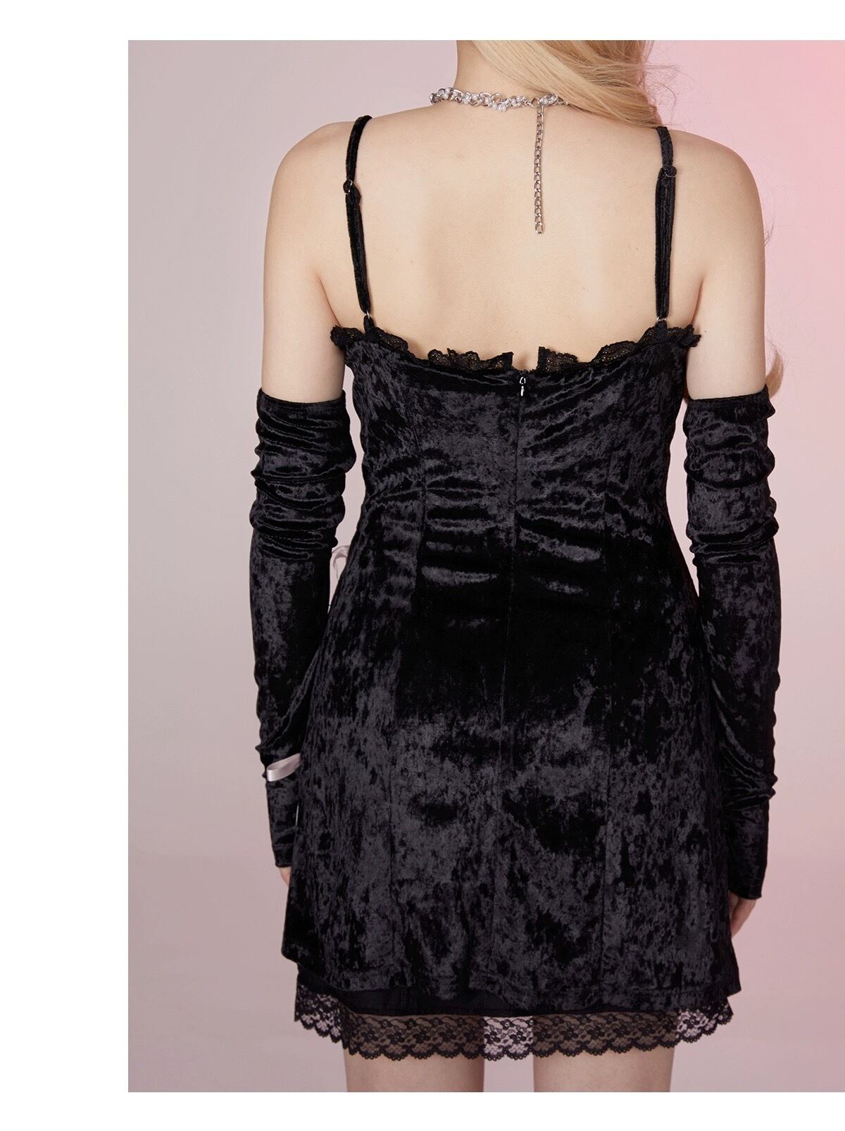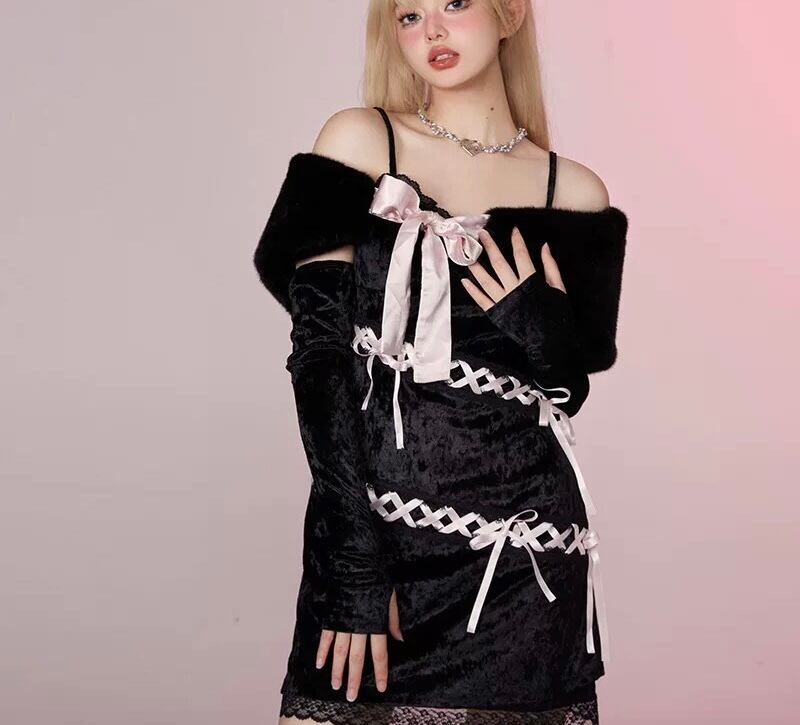 【手袋セット】黒 キャミソール リボン ピンク ガーリー セクシー ワンピース