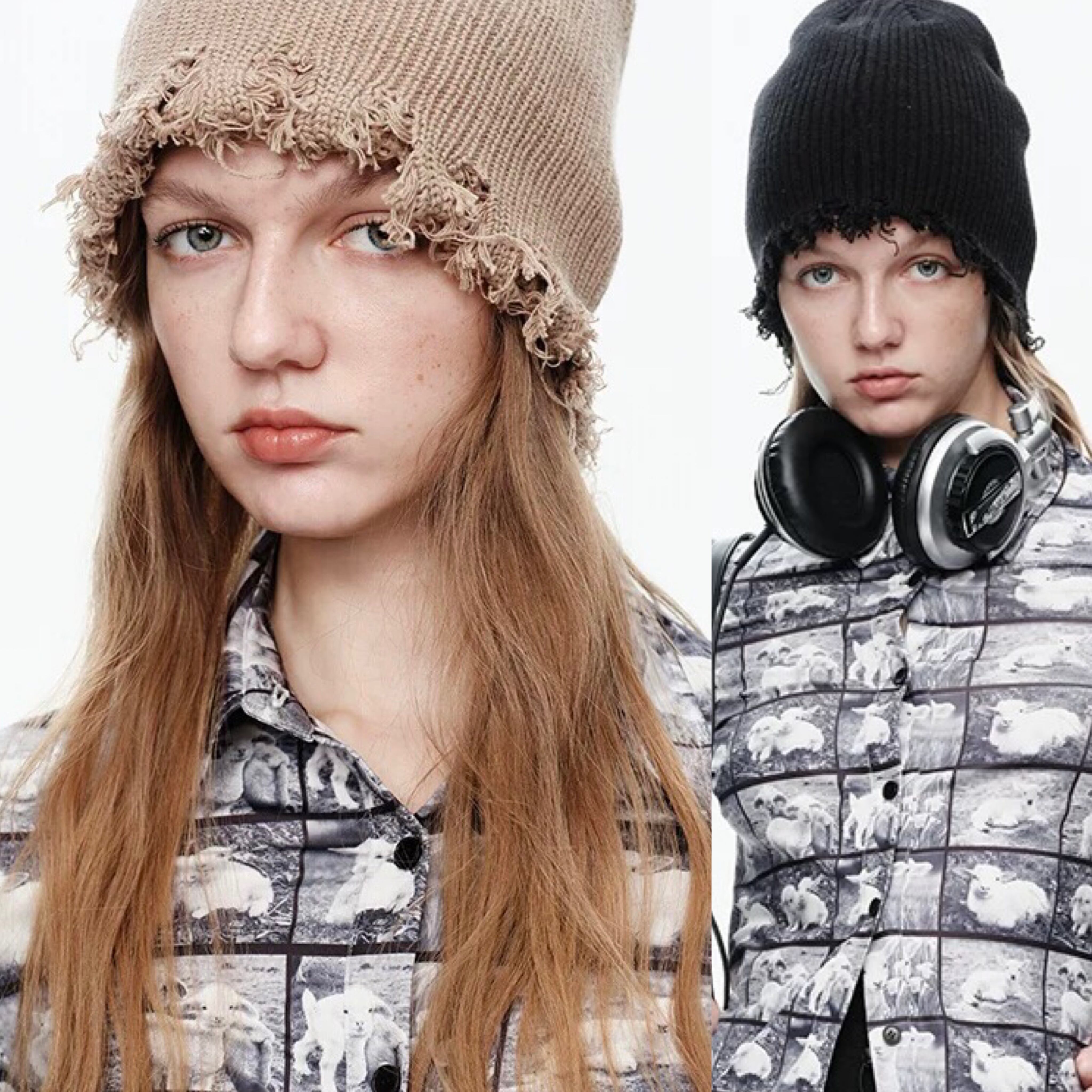 【帽子❣️】ニット帽 ベージュ 黒 ダメージ クラッシュ