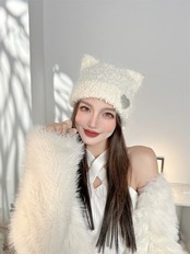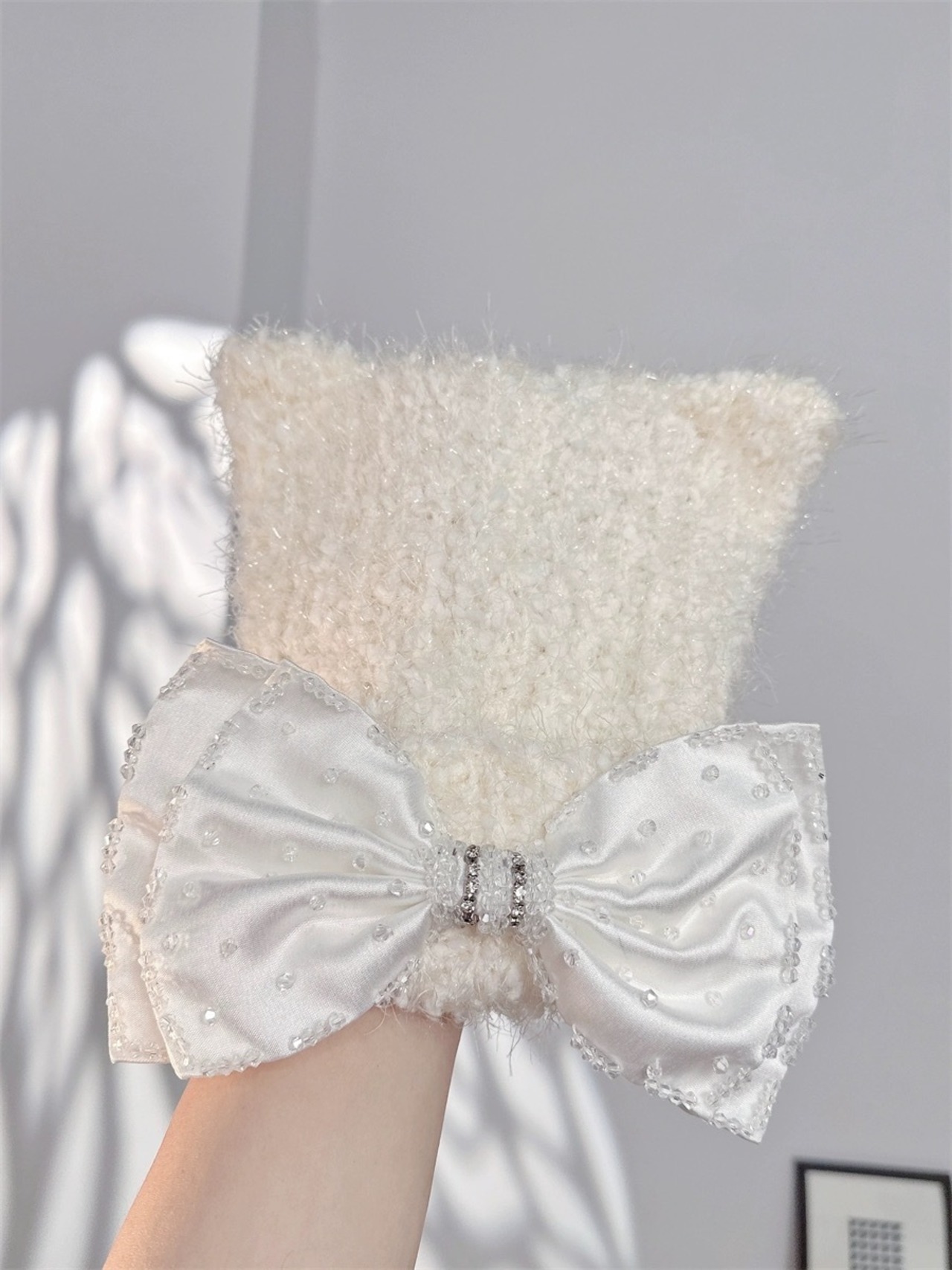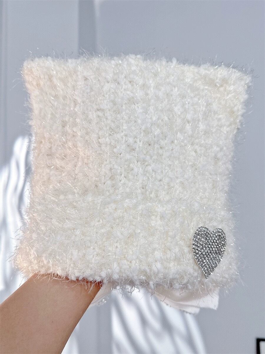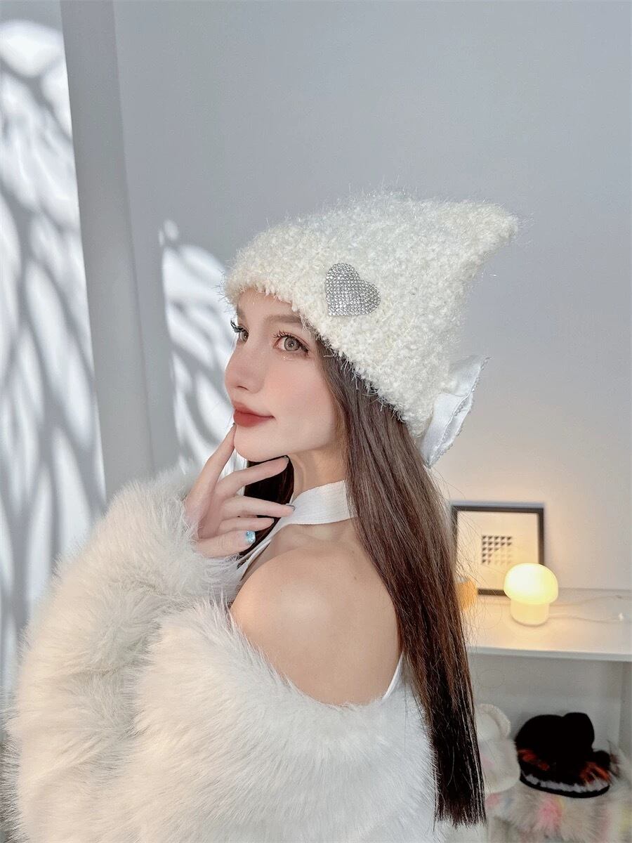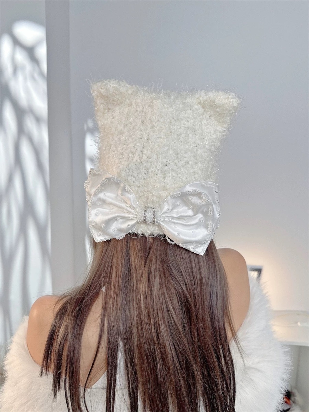 白 ニット 帽子 リボン 猫耳 パール ホワイト ハート