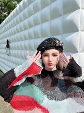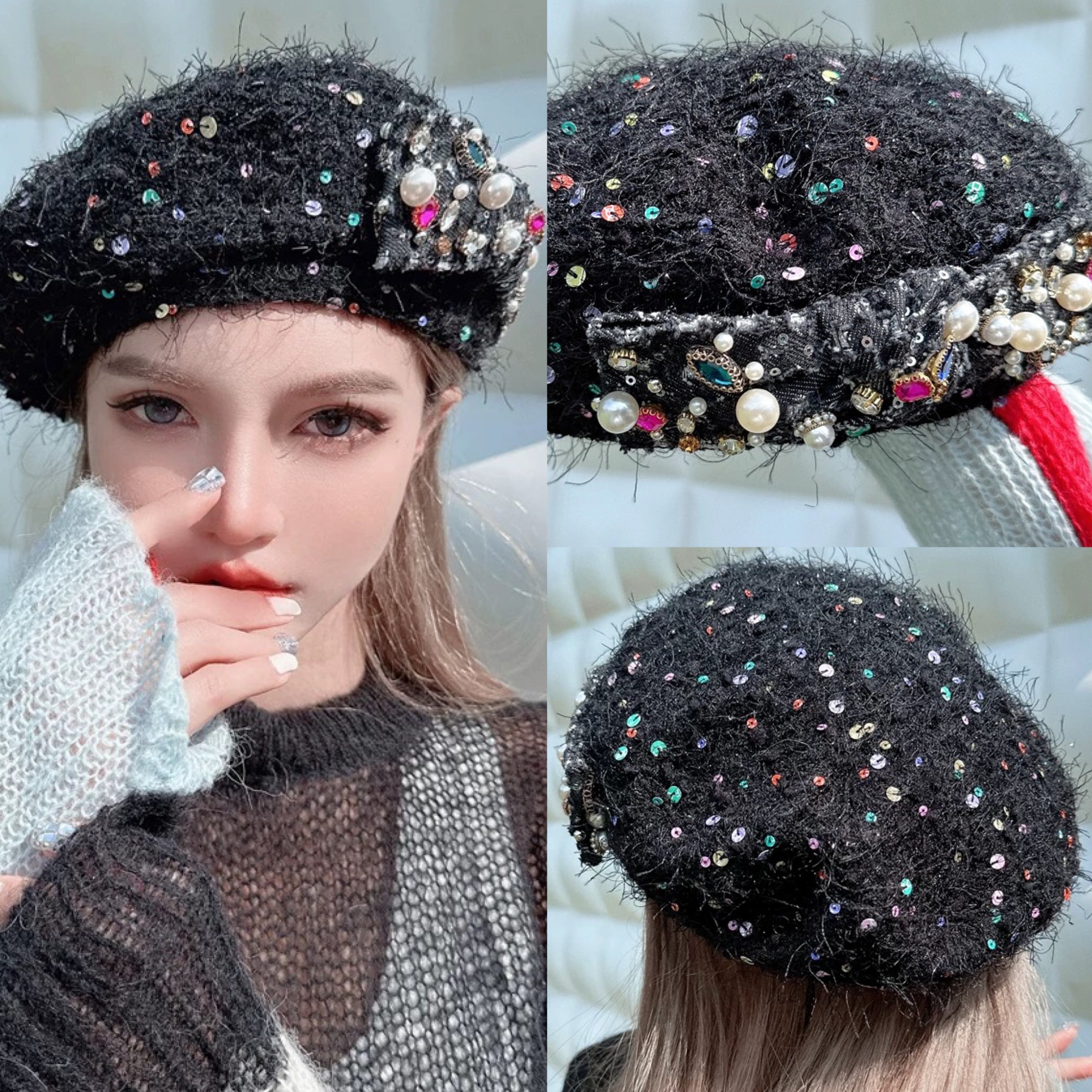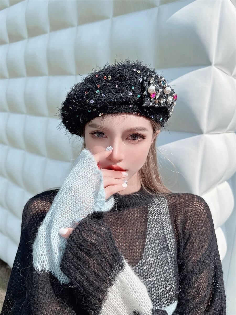黒 スパンコール ベレー帽 帽子 ガーリー キラキラ