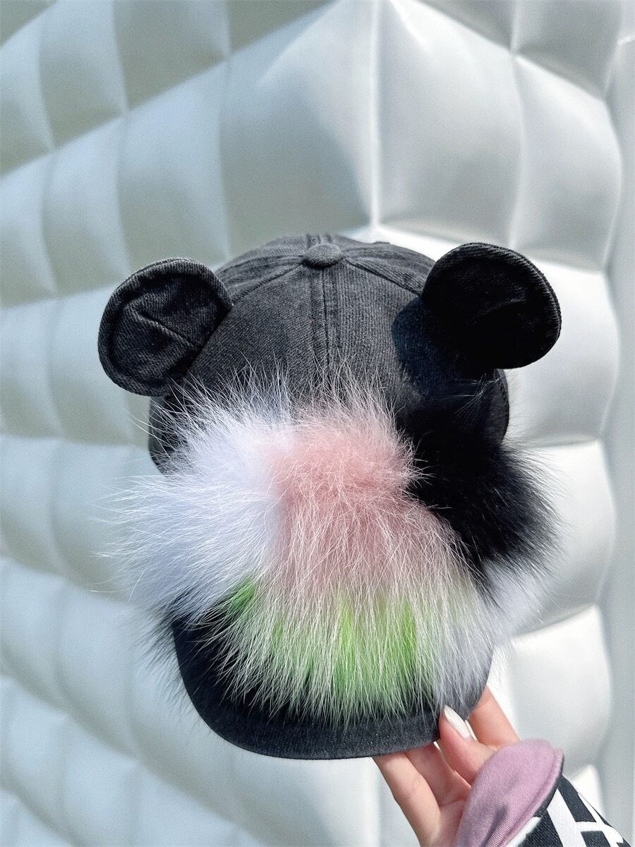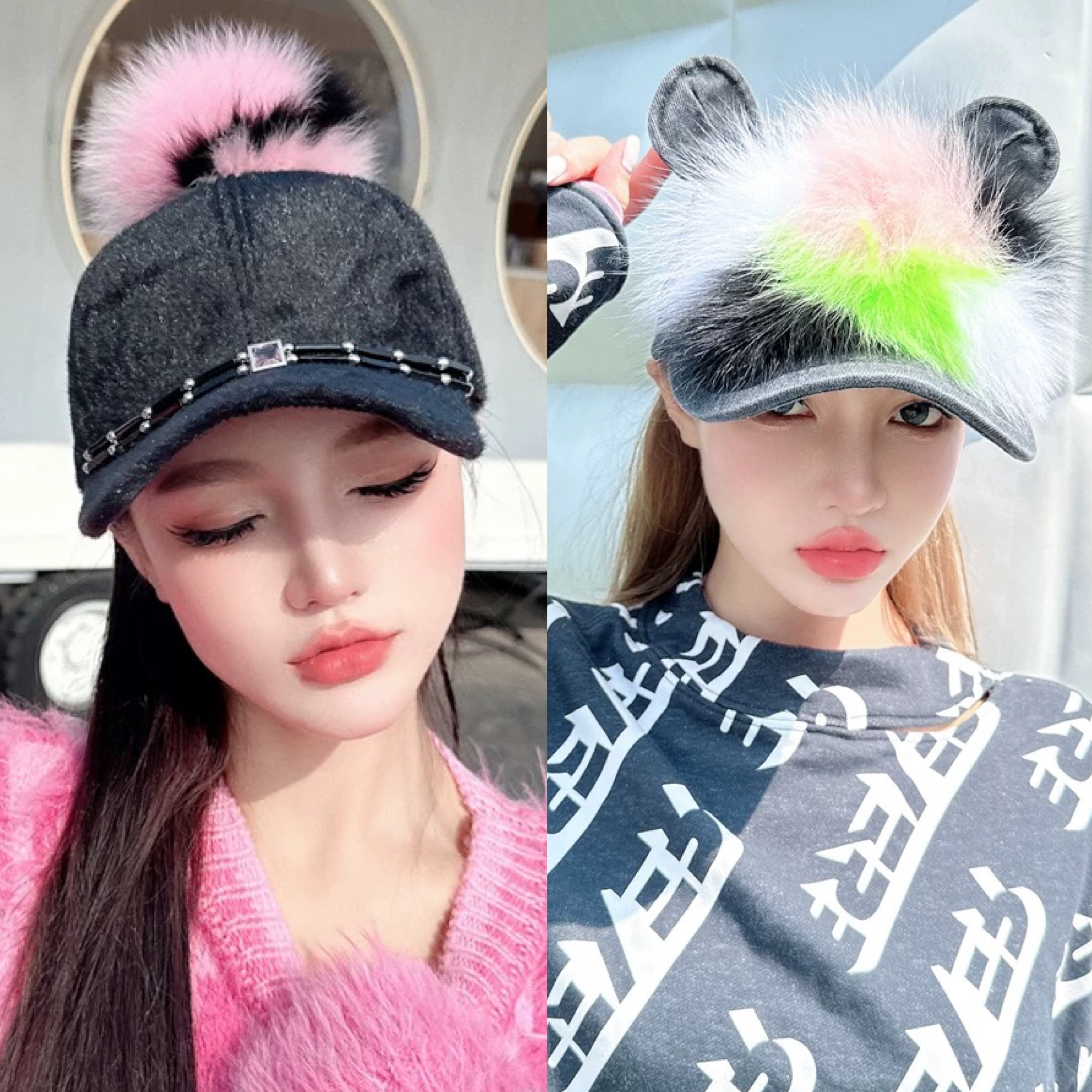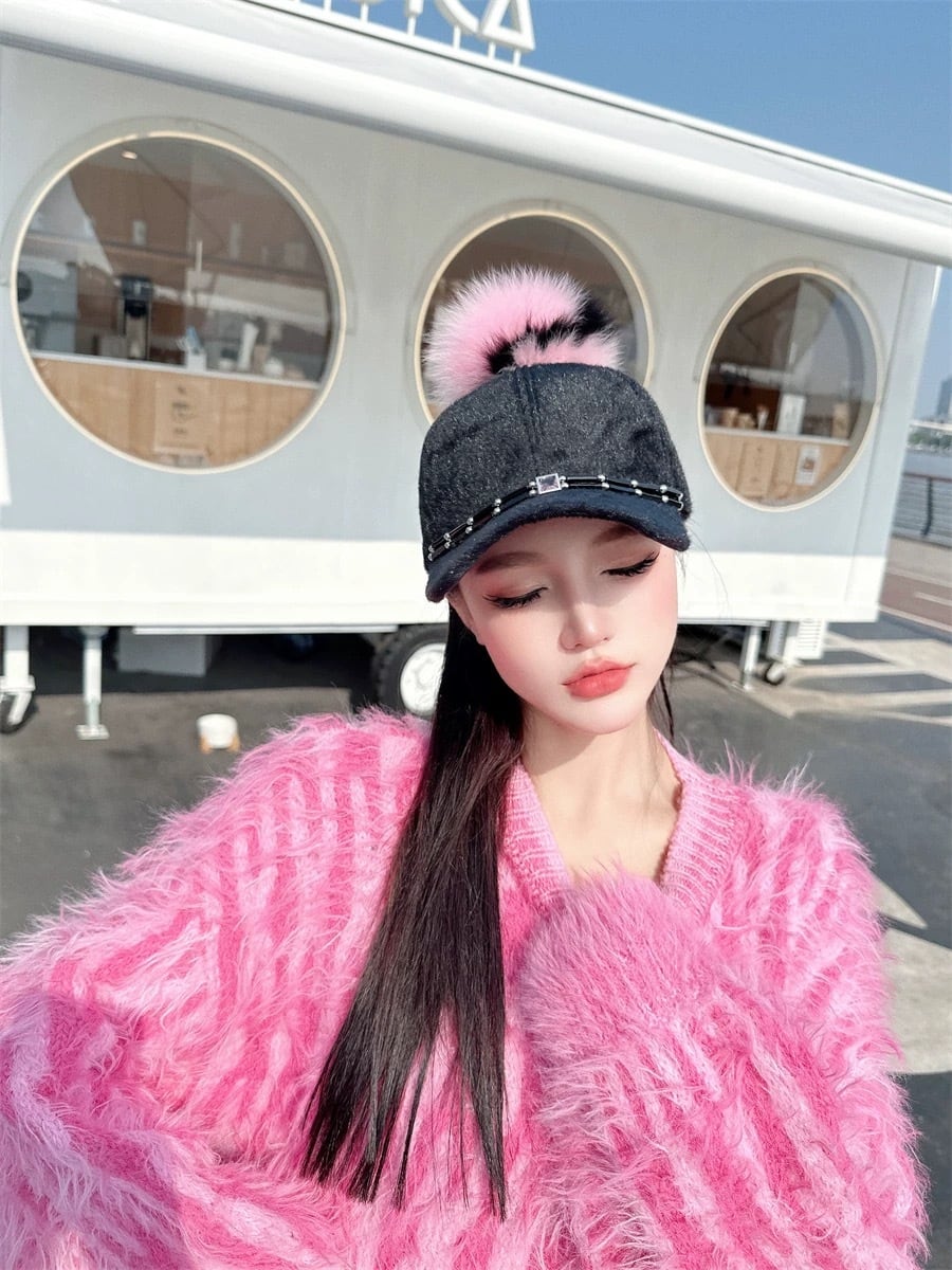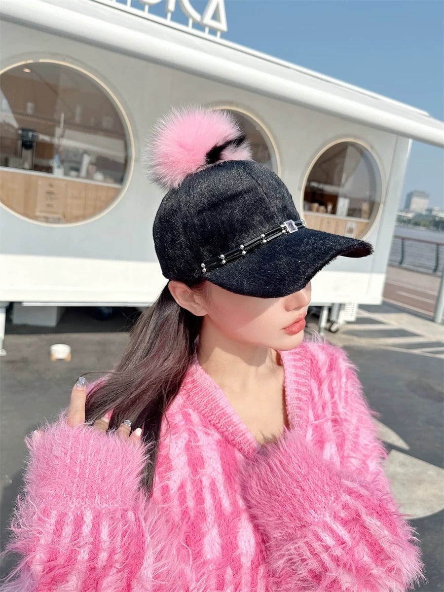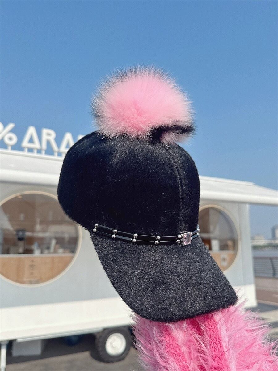 キャップ 黒 ピンク ファー 帽子 カジュアル ポンポン
