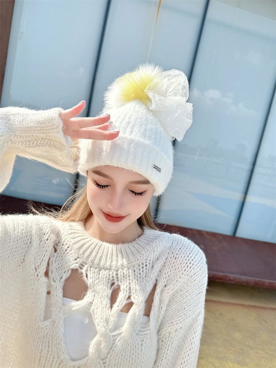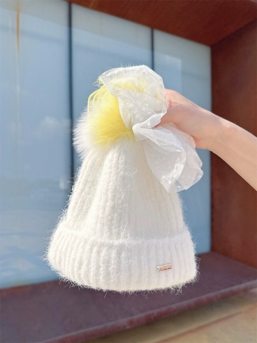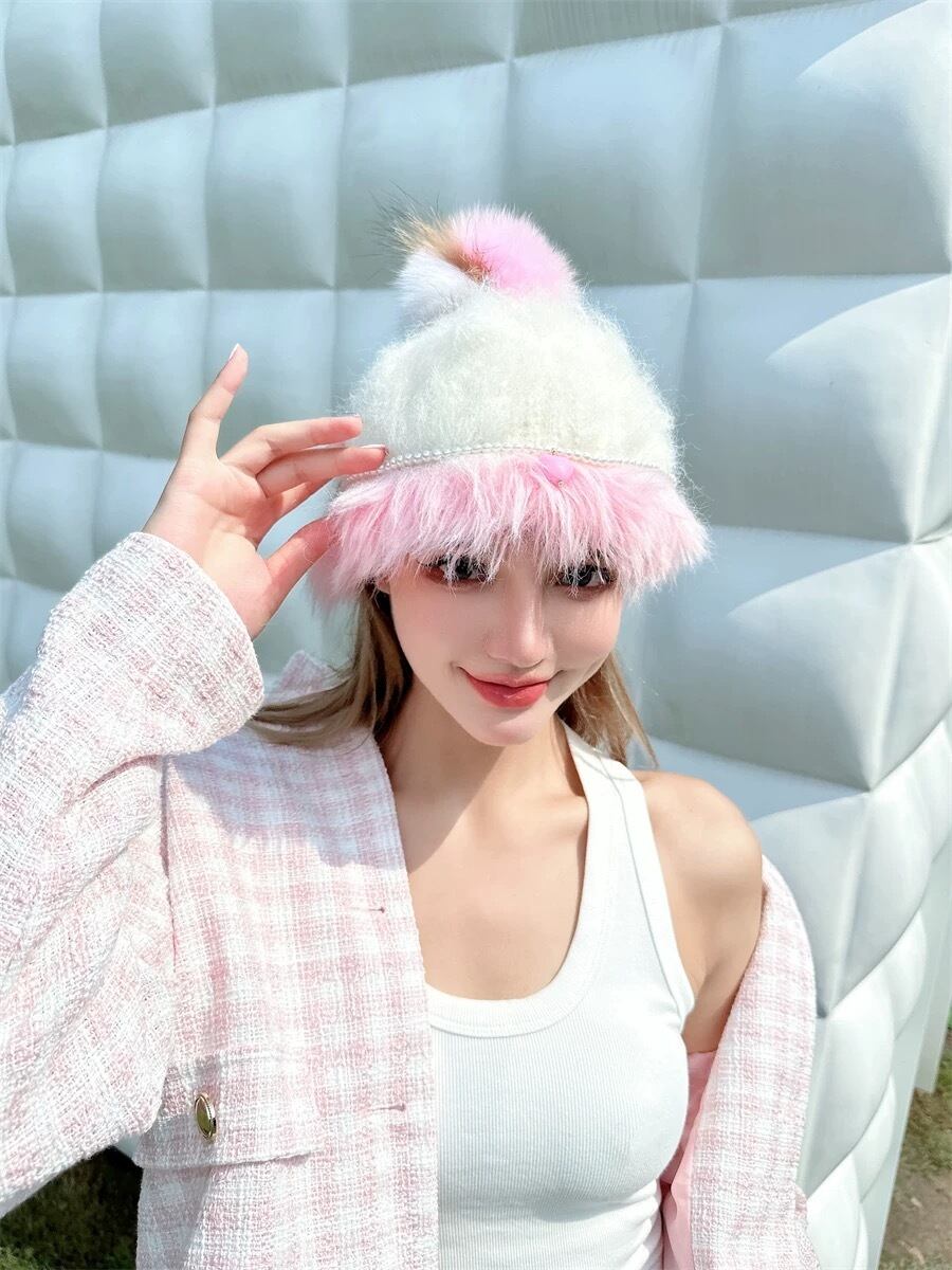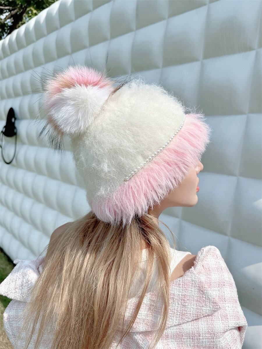 帽子 ニット帽 ピンク ファー 白 ピンク 黄色 リボン 白 黒