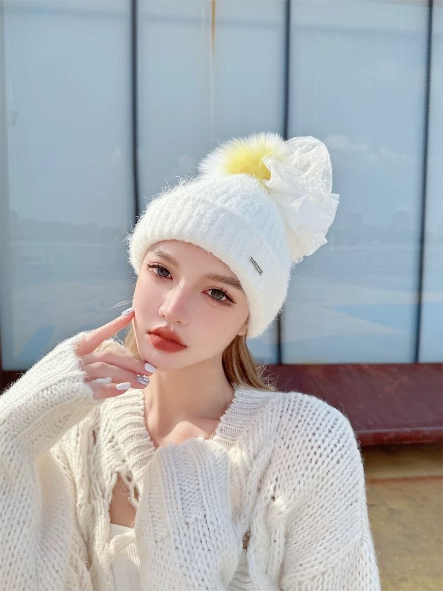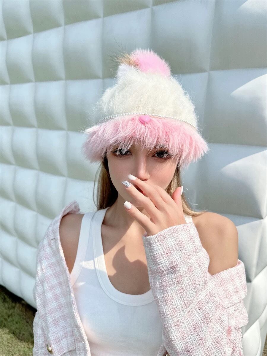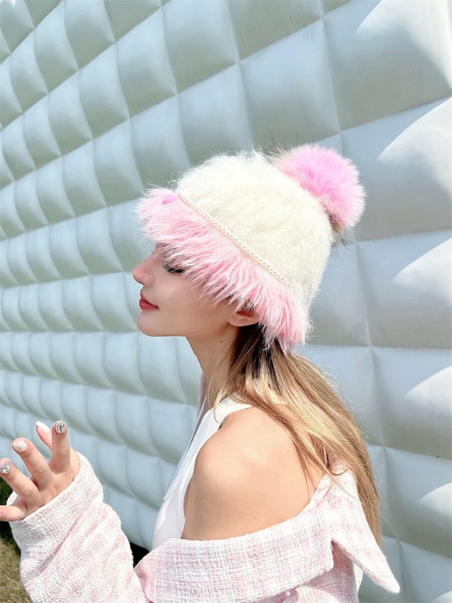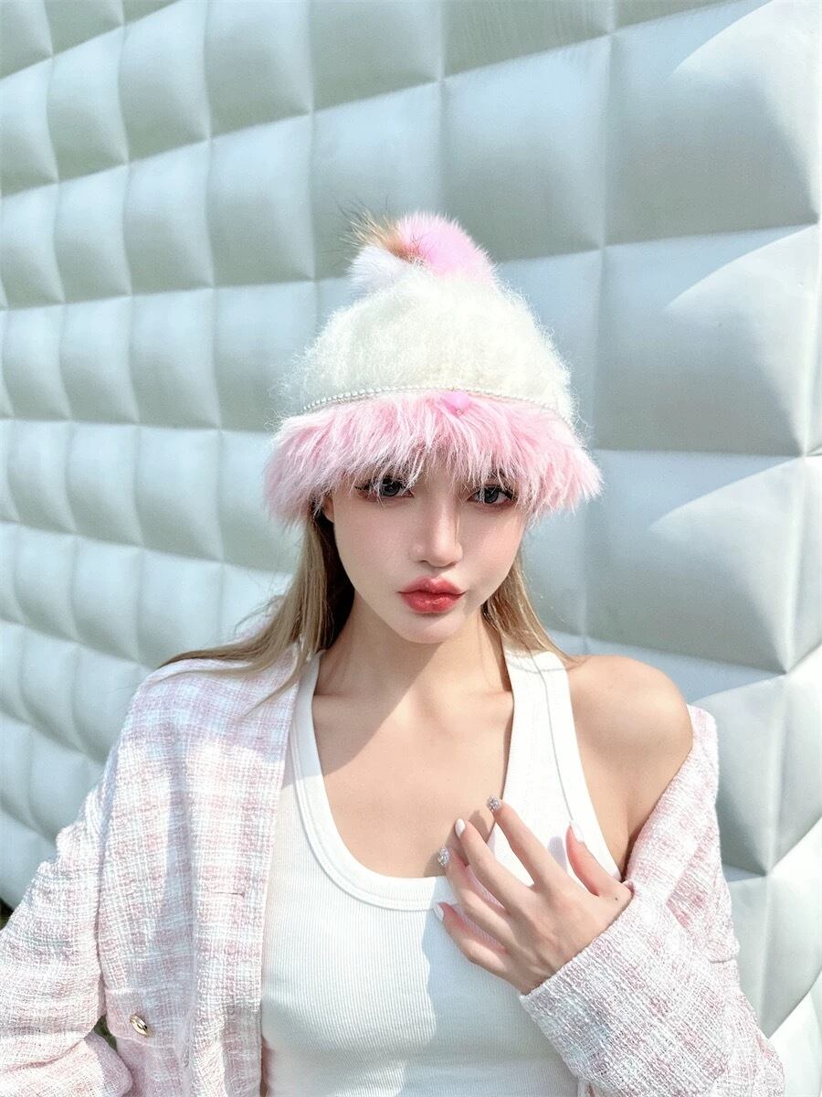 帽子 ニット帽 ピンク ファー 白 ピンク 黄色 リボン 白 黒