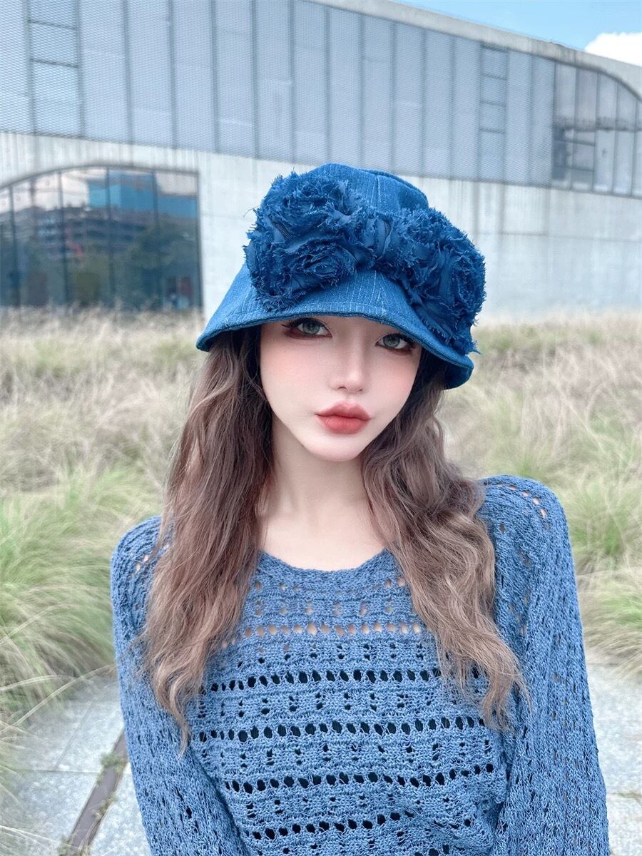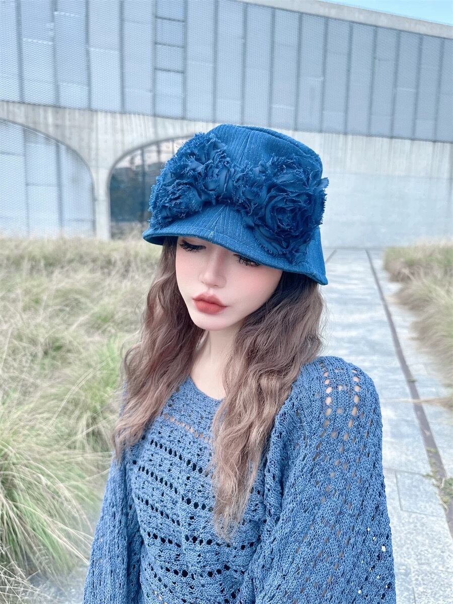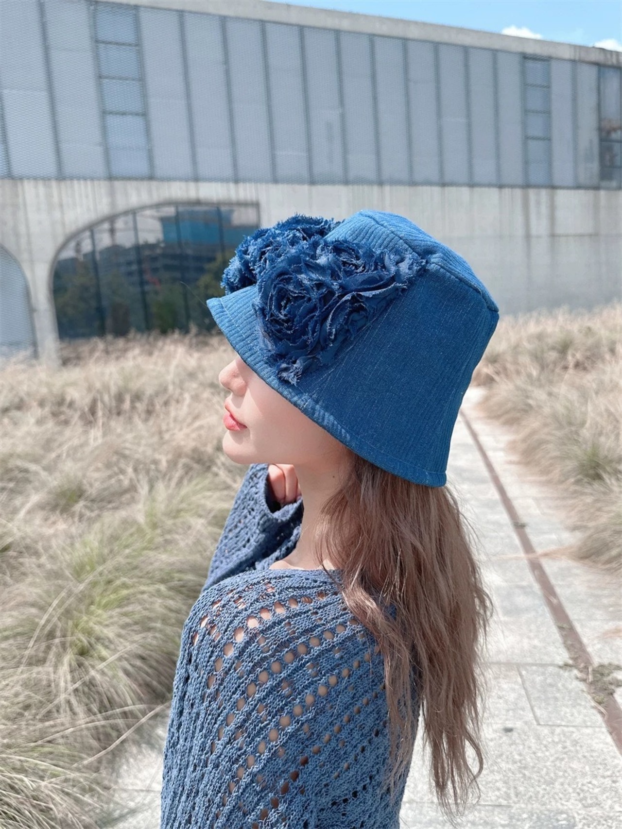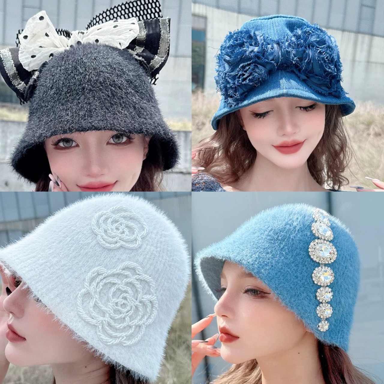 水色 ラインストーン 白 カメリア 帽子 リボン 黒 デニム リボン バケハ