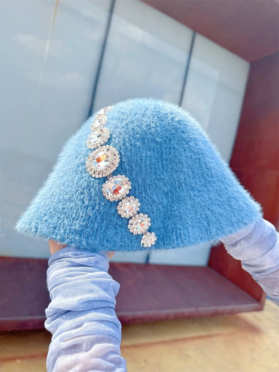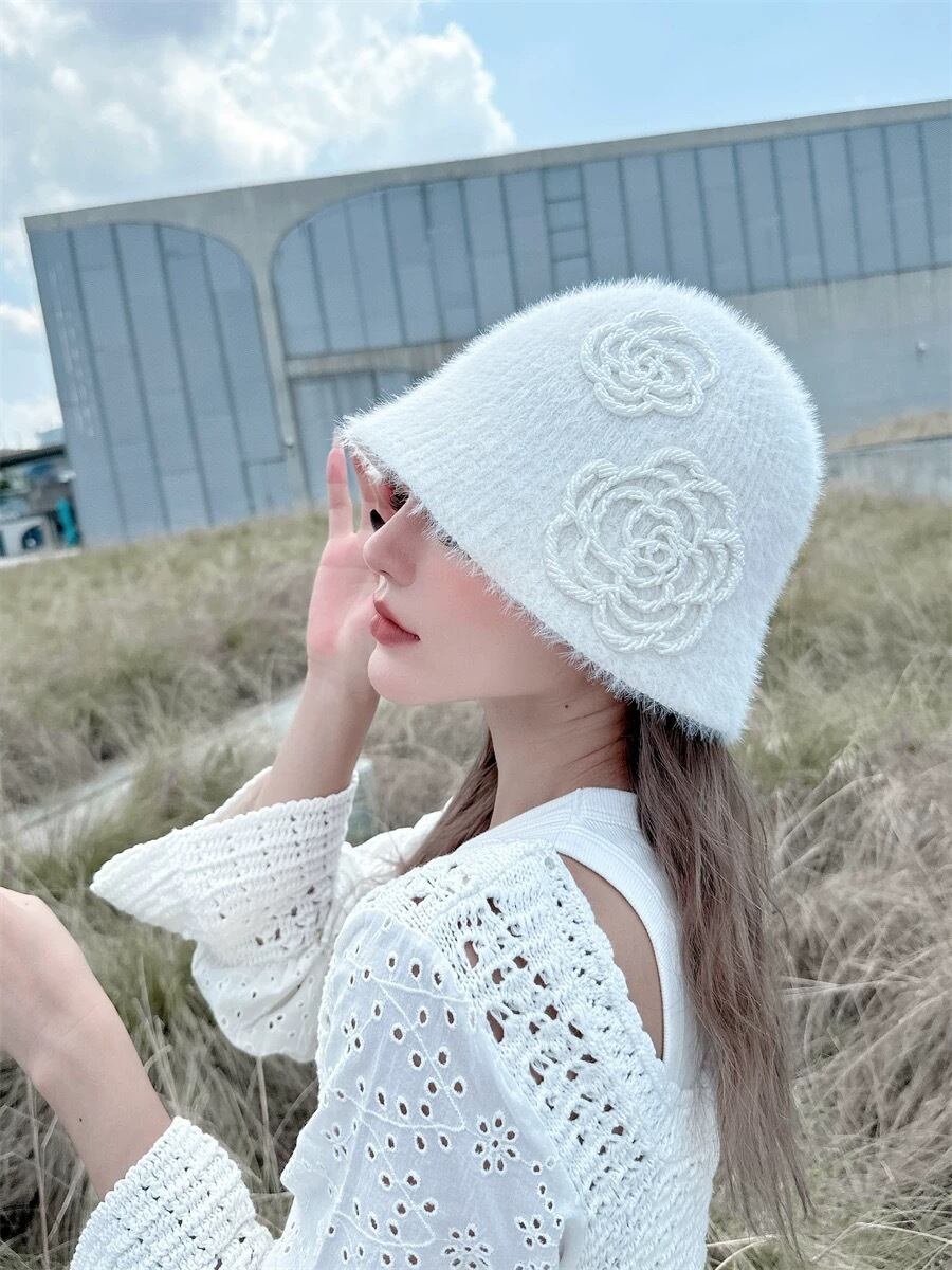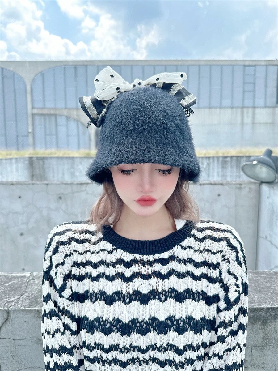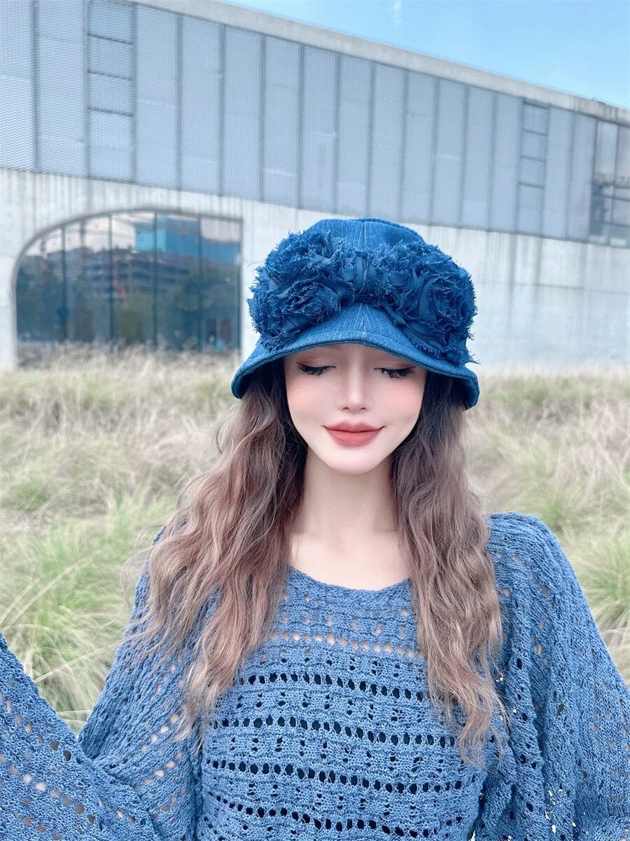 水色 ラインストーン 白 カメリア 帽子 リボン 黒 デニム リボン バケハ