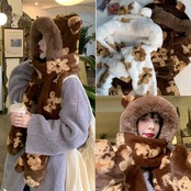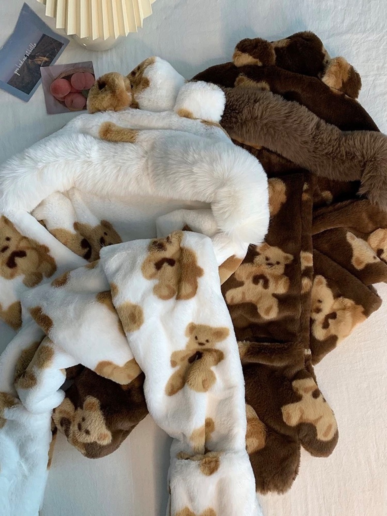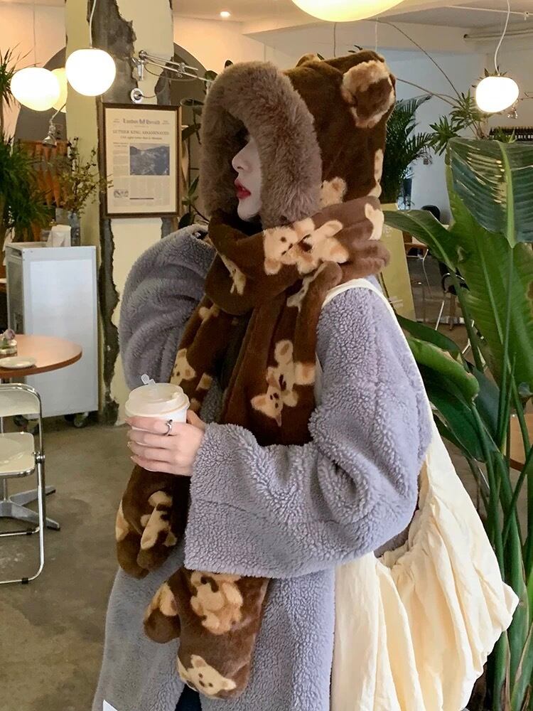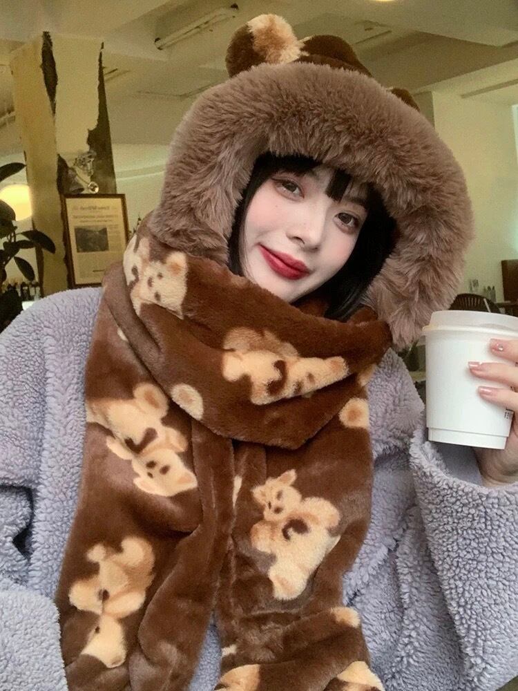 マフラー 手袋 帽子 くまさん くま みみ 茶色 白 フード ファー