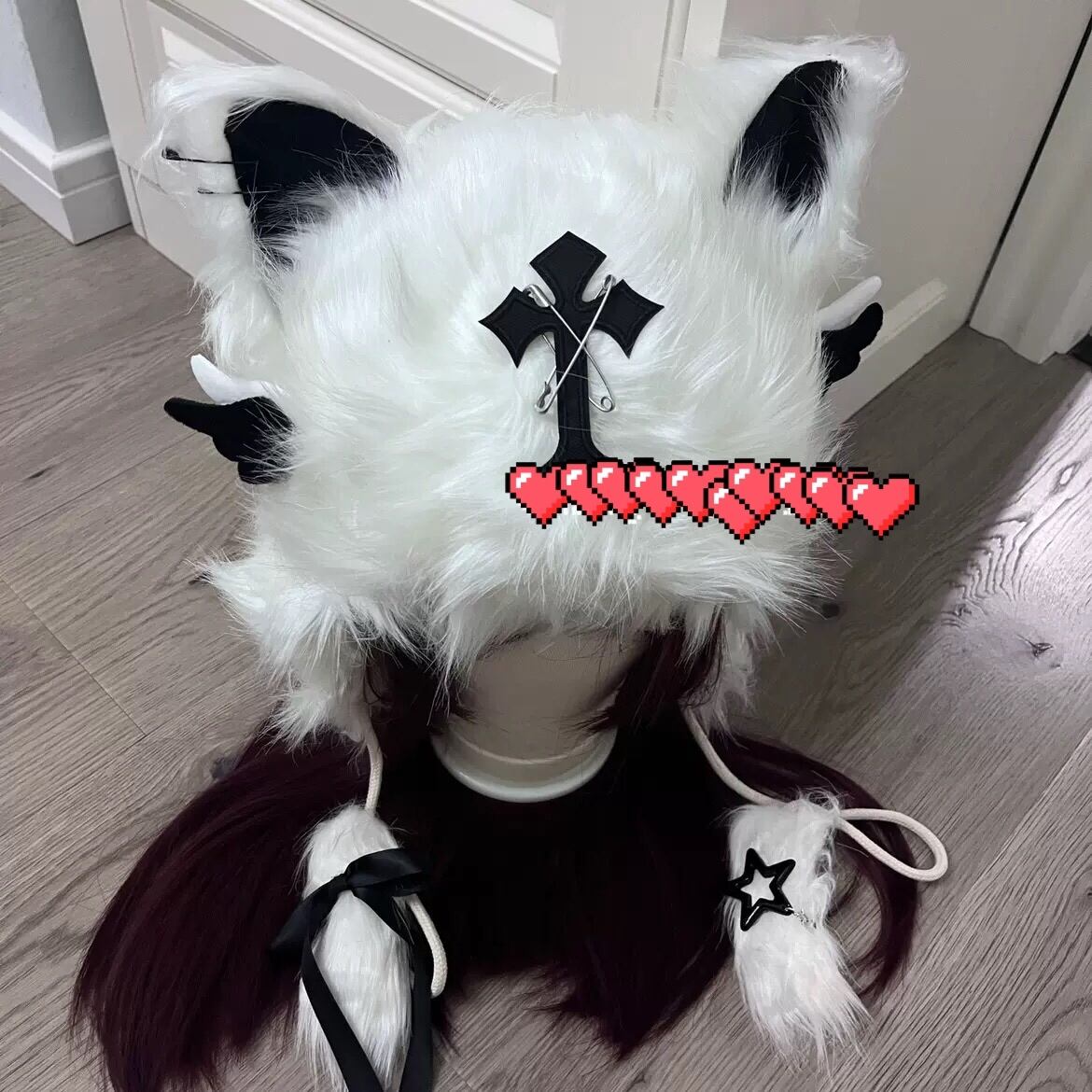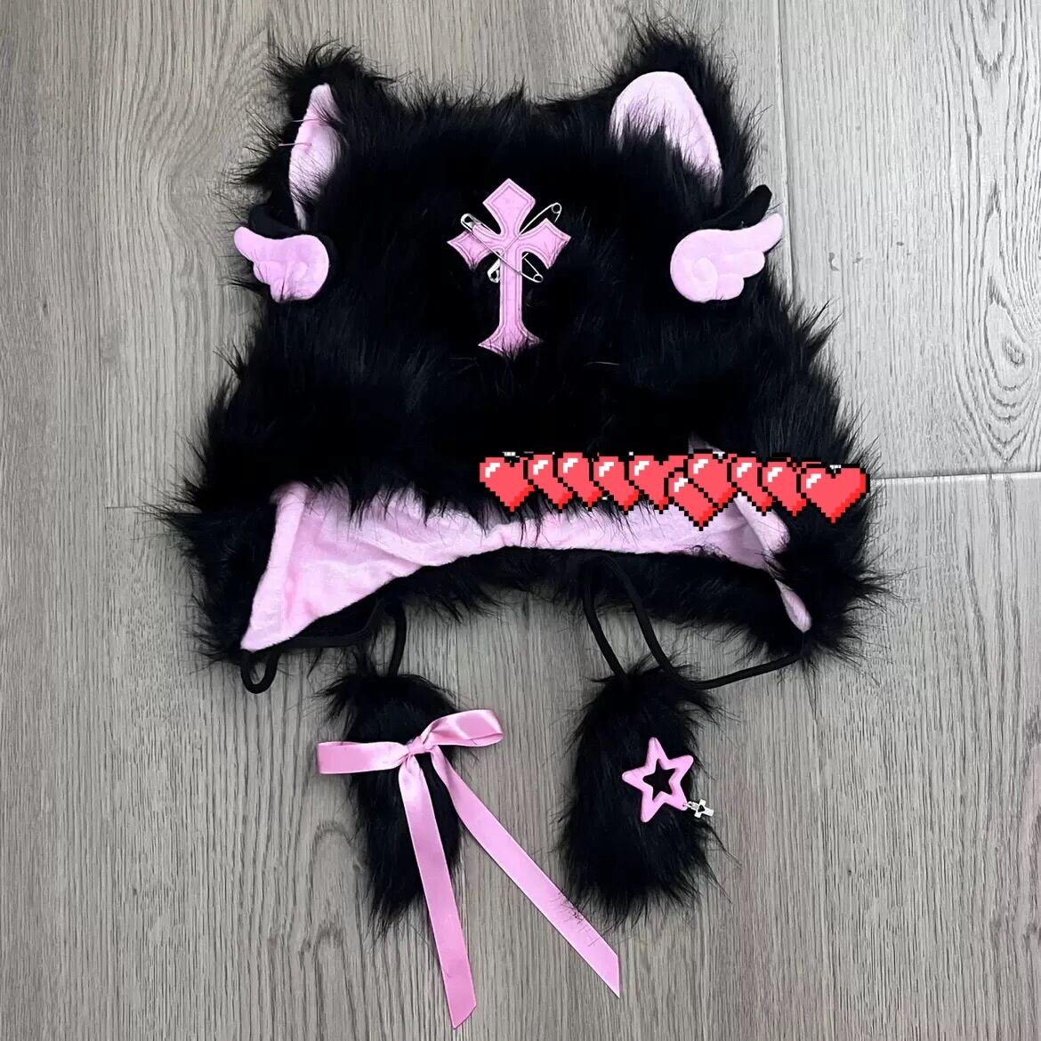 ファー 黒 白 ピンク クロス 帽子 ねこ 猫耳 みみ