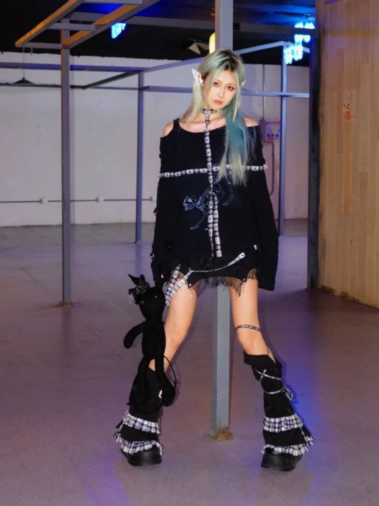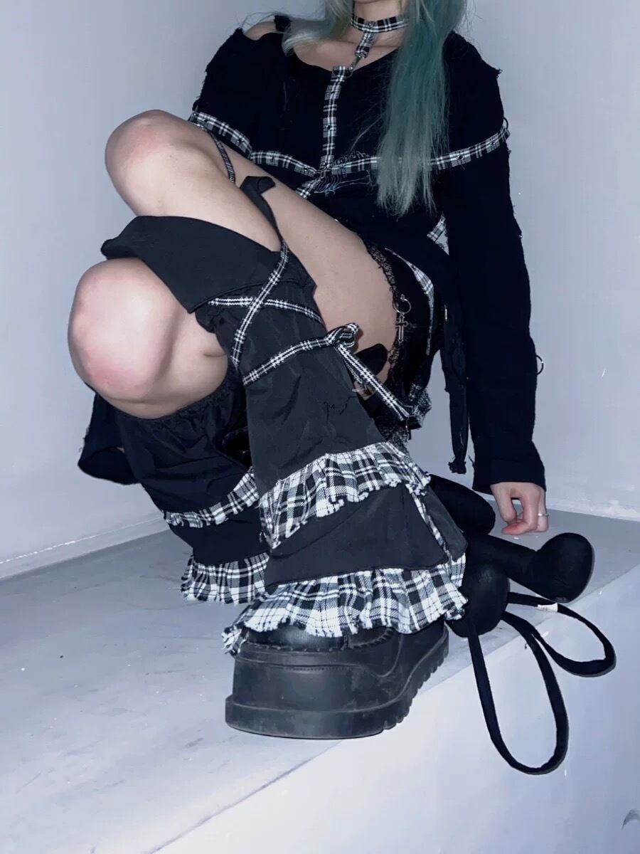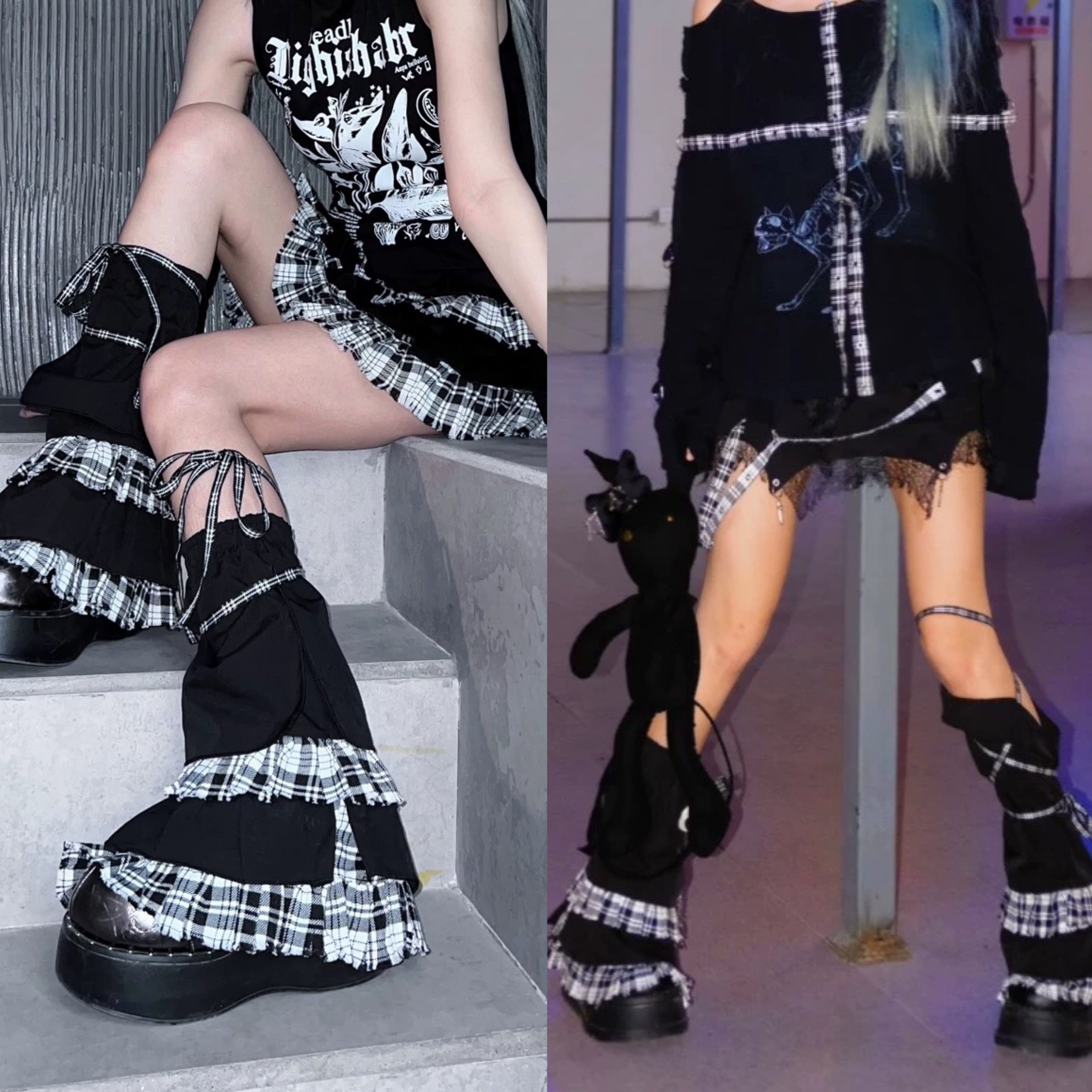 レッグウォーマー 黒 靴下 チェック タイツ リボン