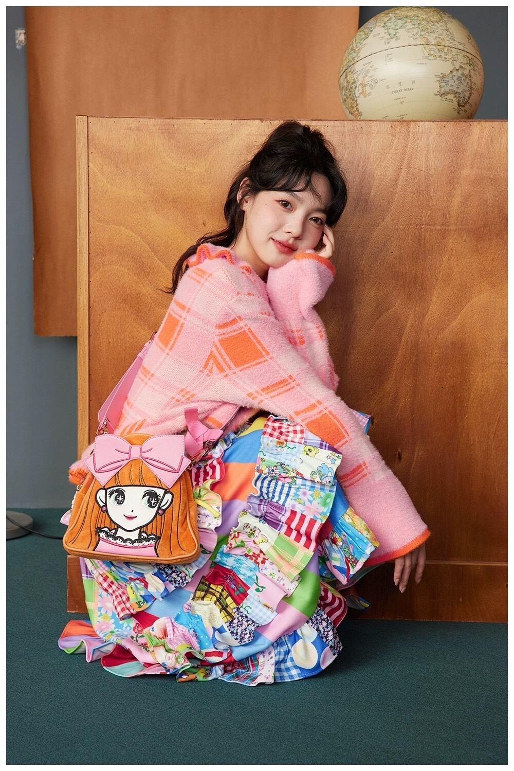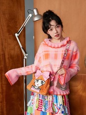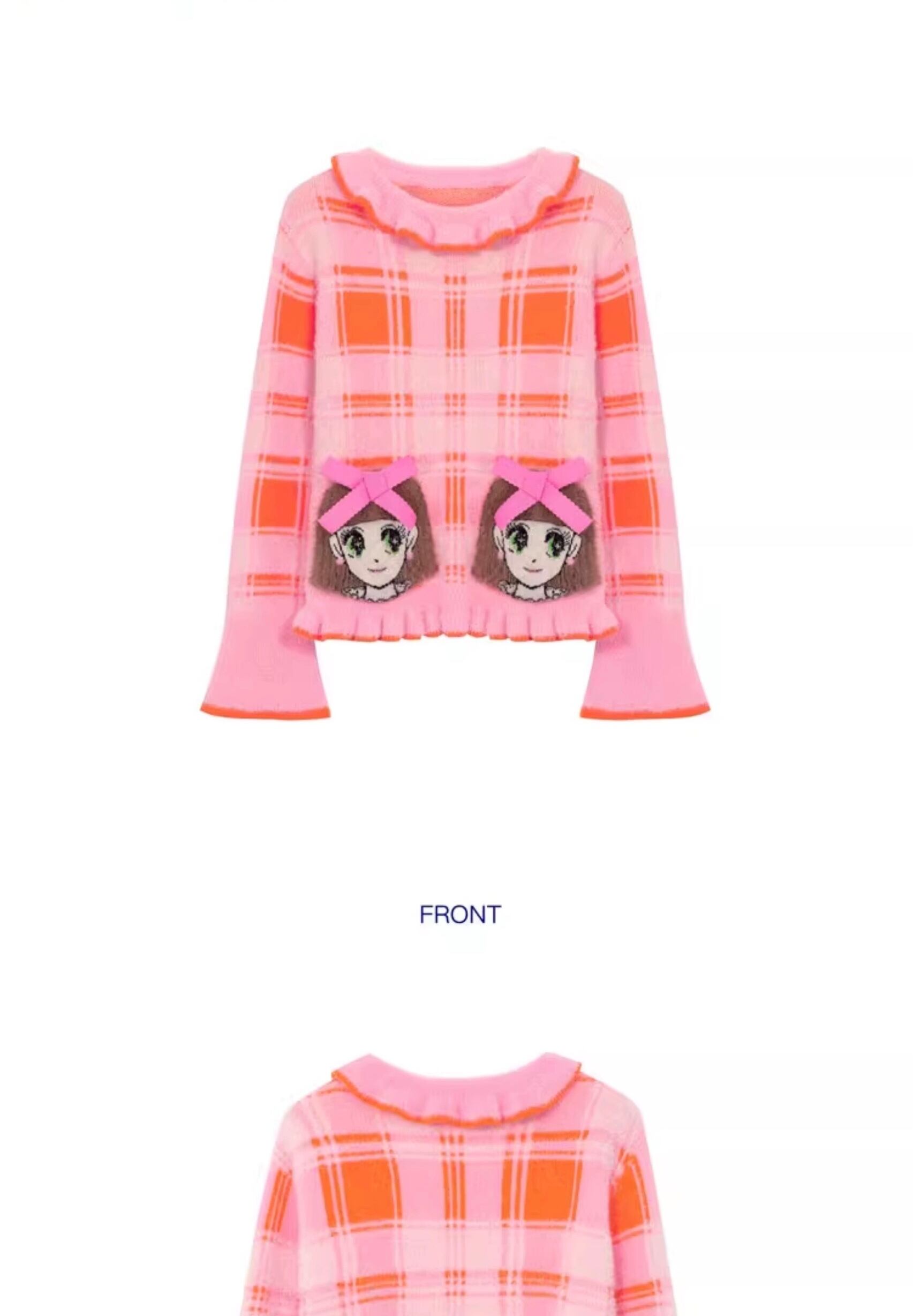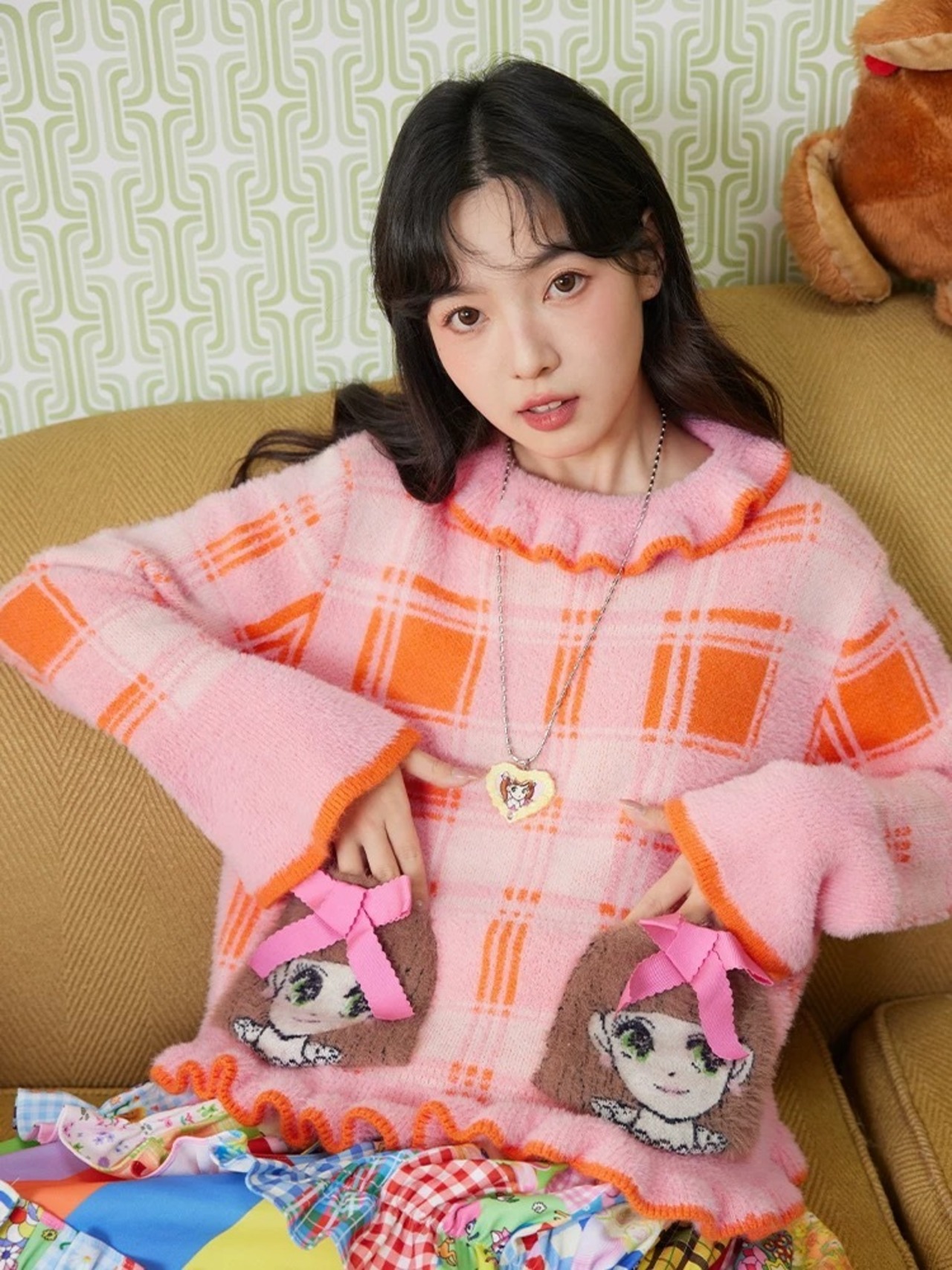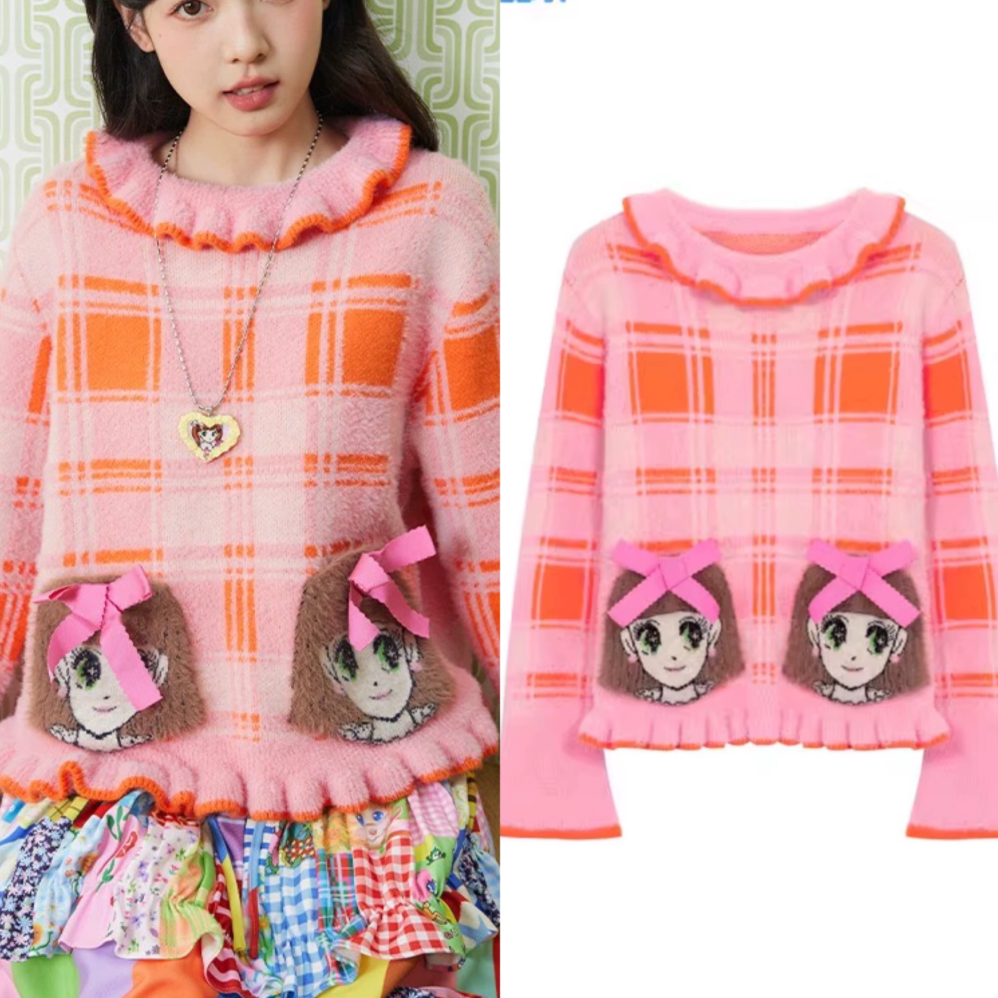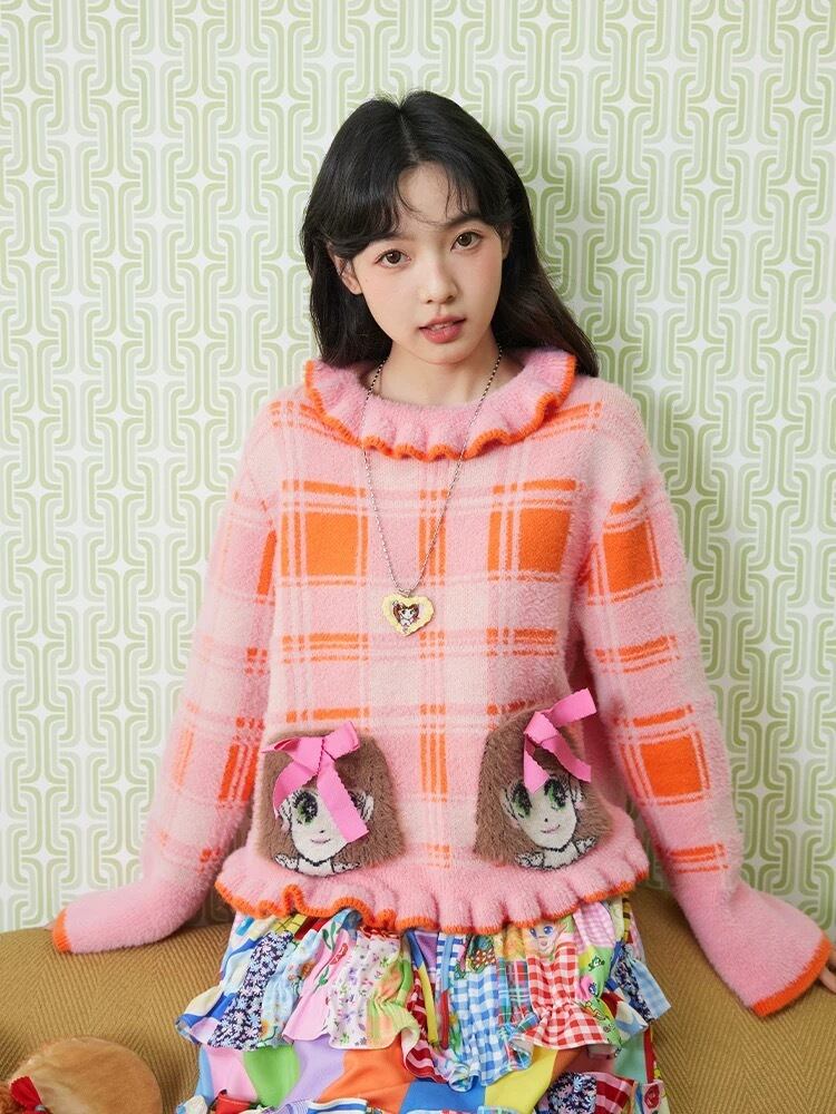 セーター ピンク トップス チェック オレンジ 可愛い リボン