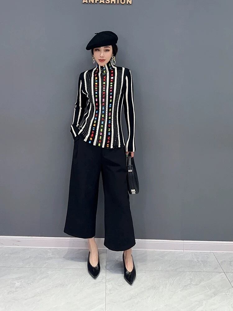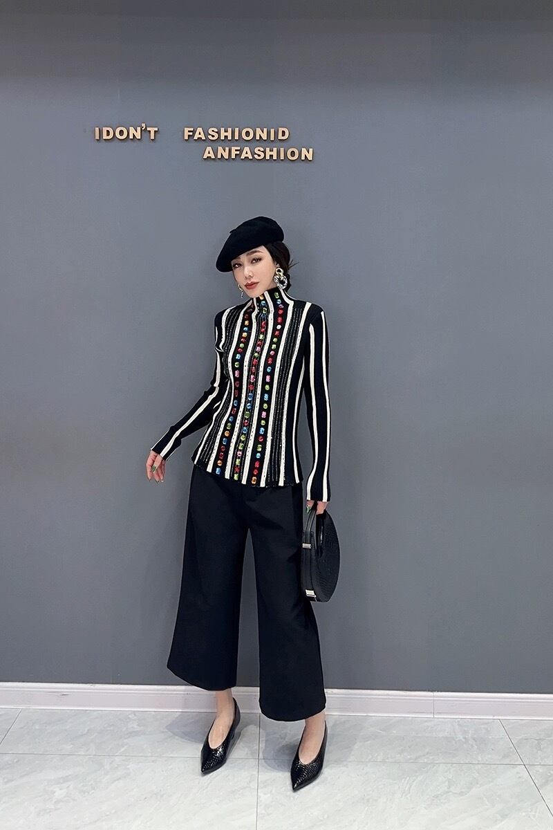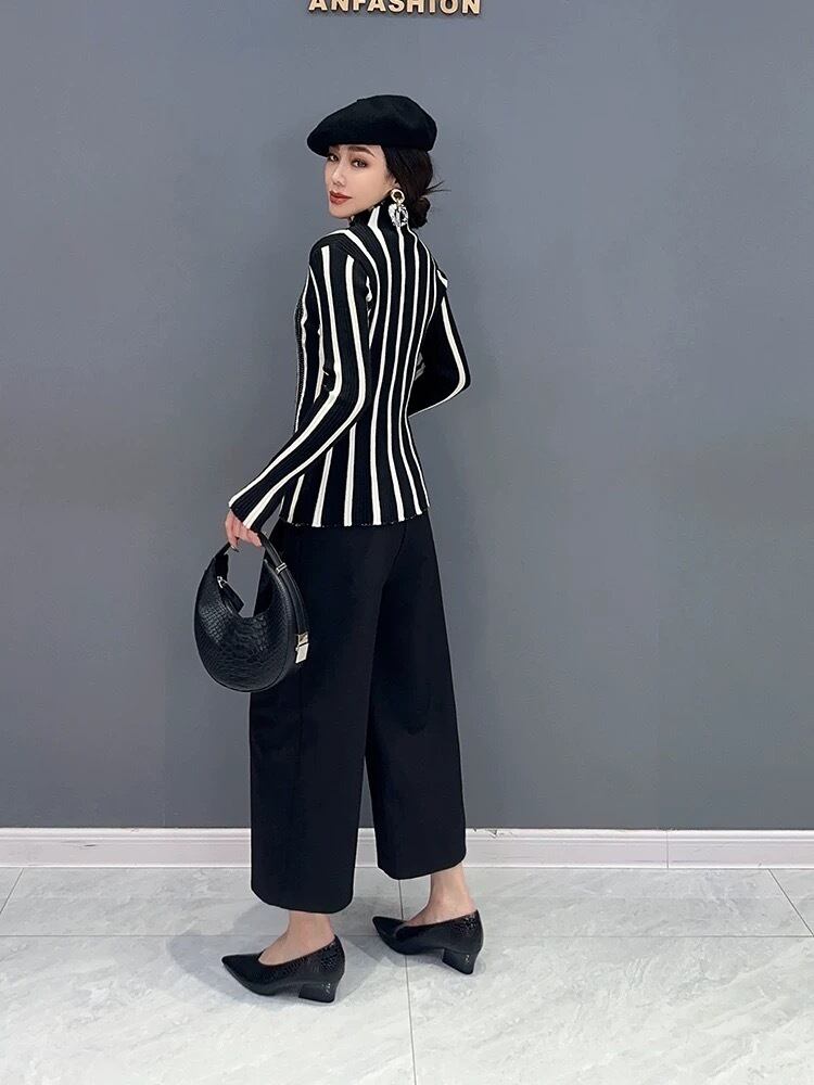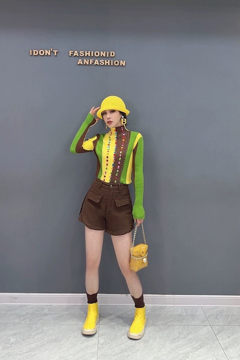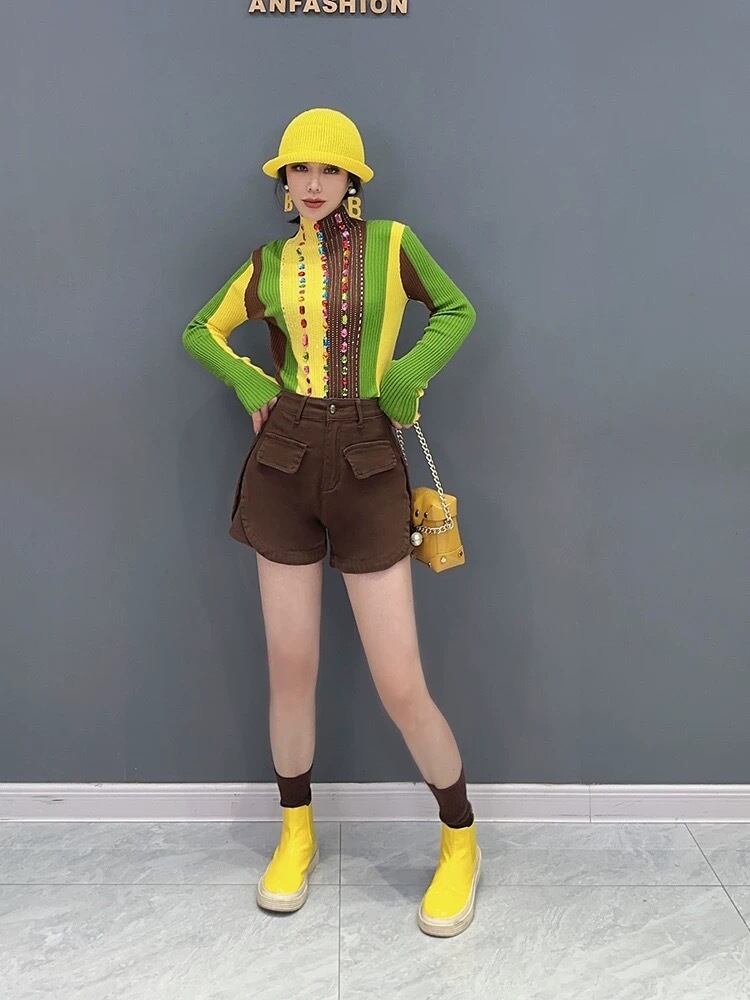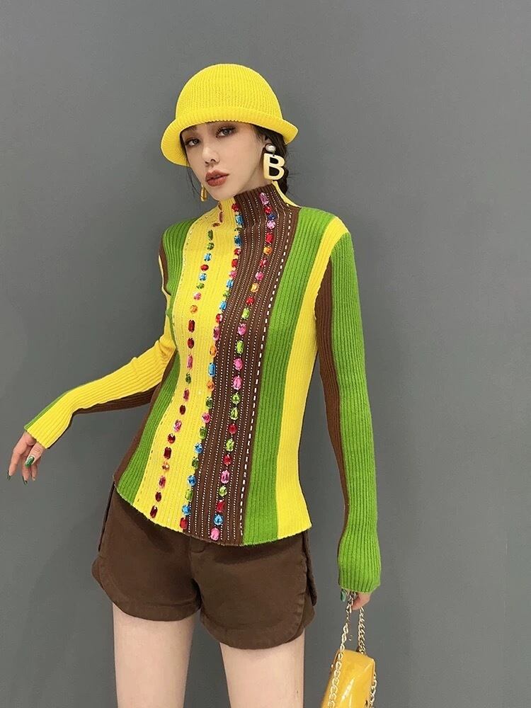 黄色 緑 チェック ボーダー 黒 ストライプ ハイネック ブラウス セーター