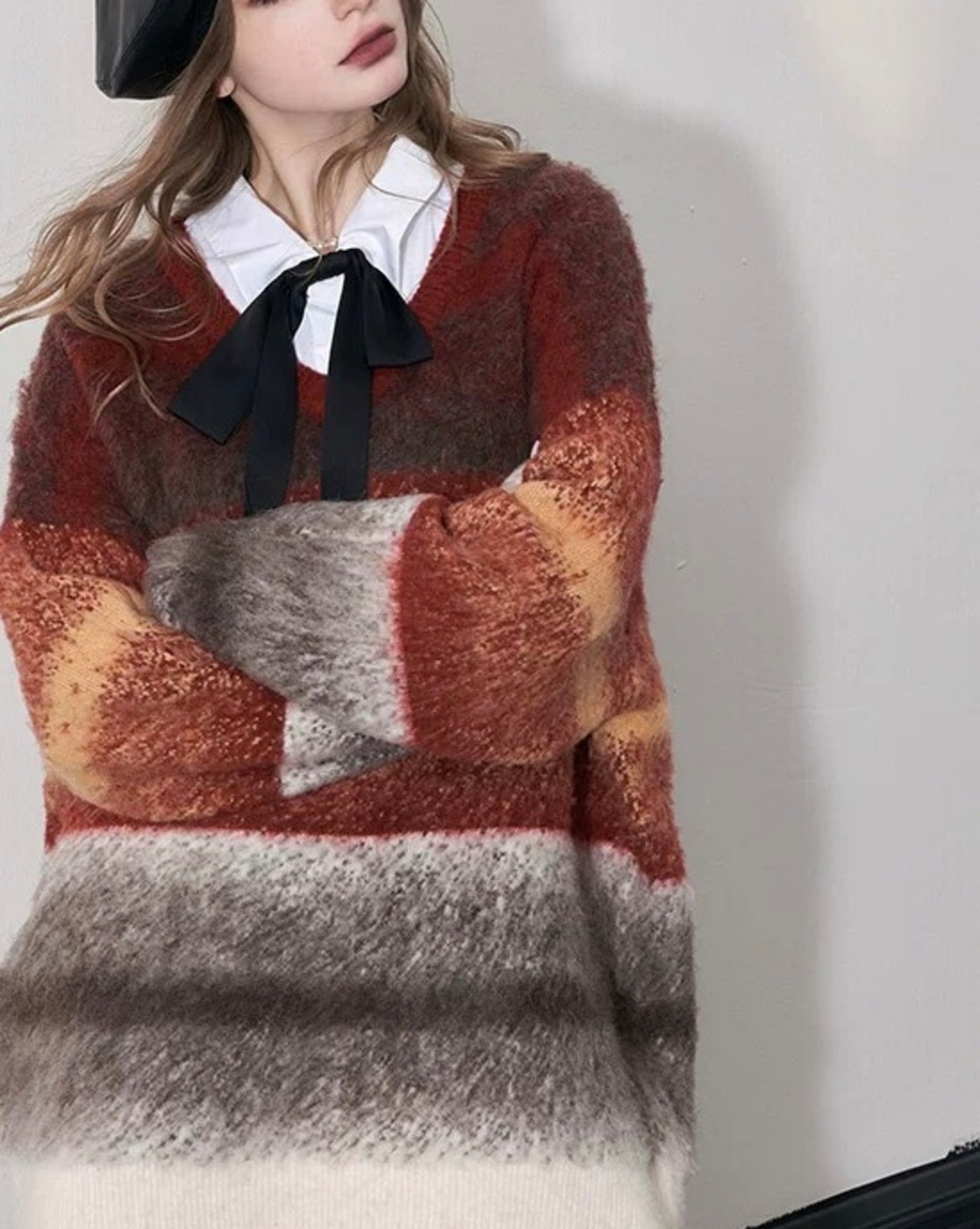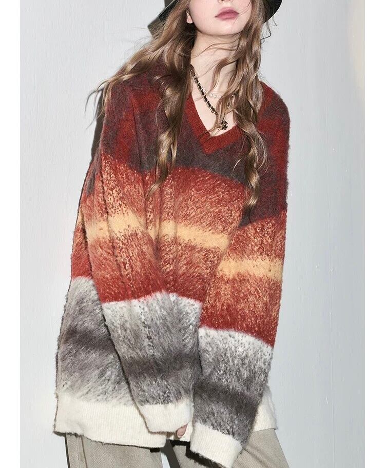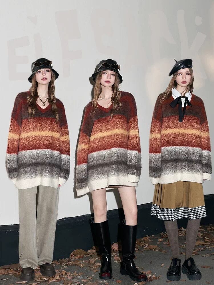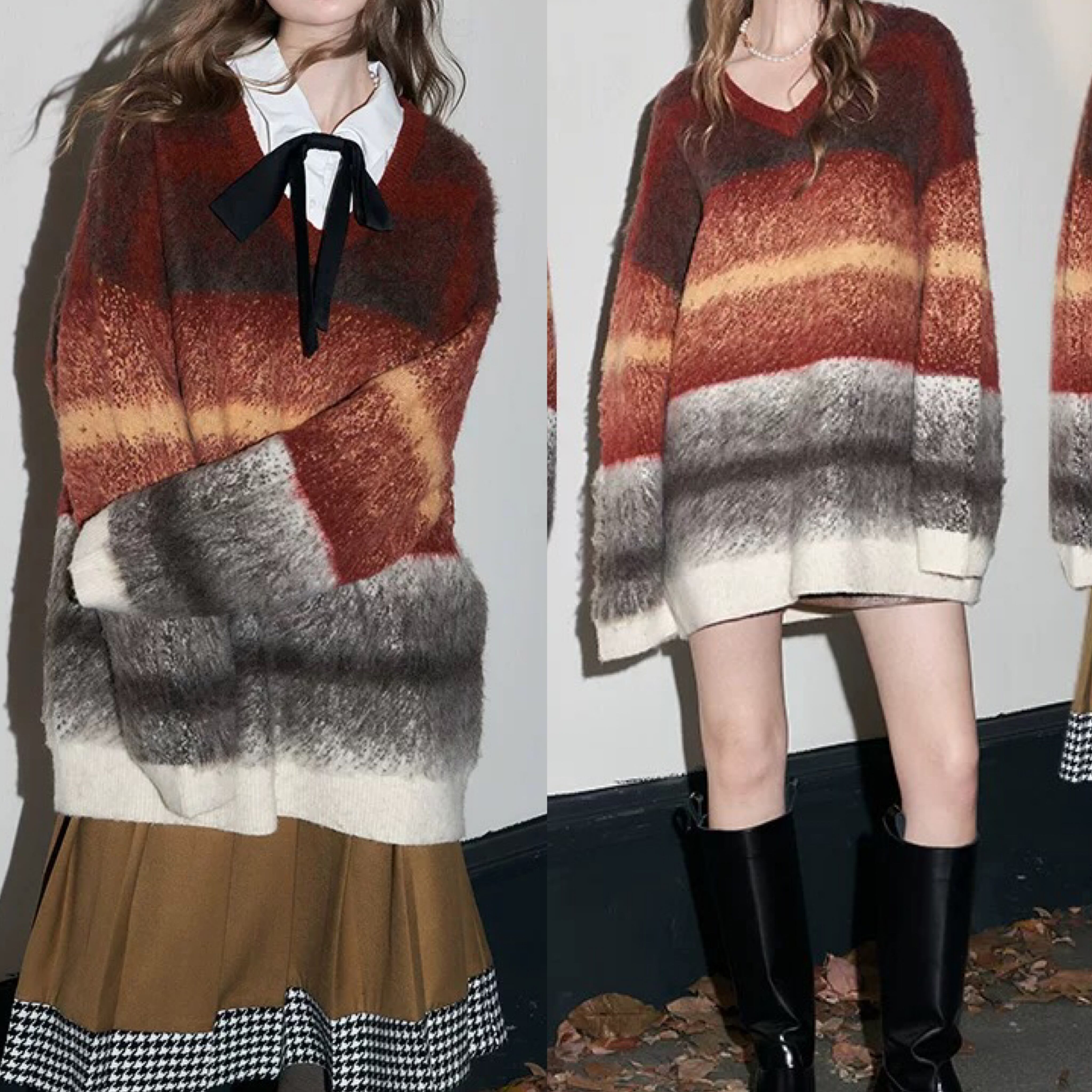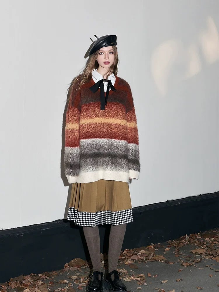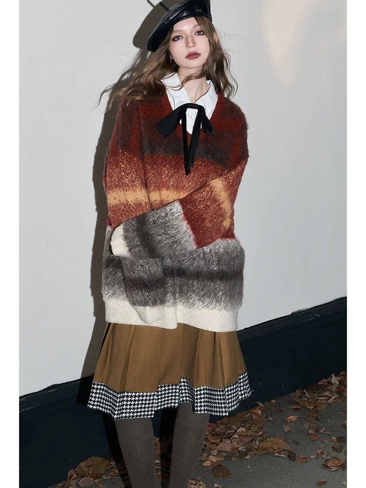 グラデーション 茶色 ボーダー チェック ニット カーディガン 黄色 ワンピース