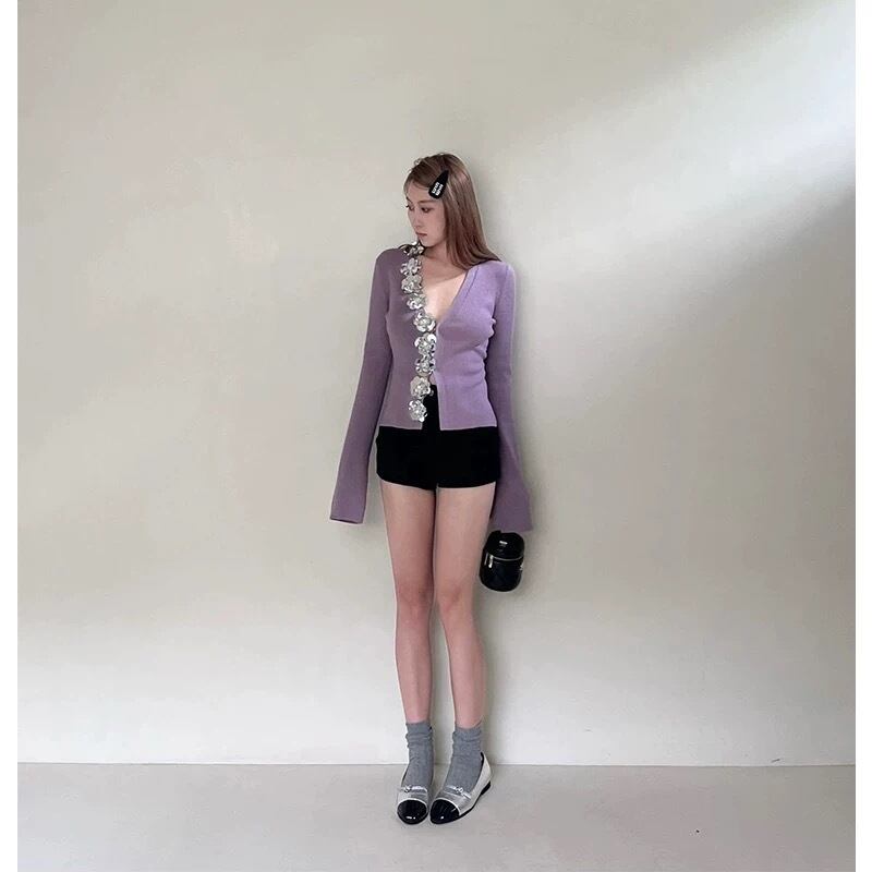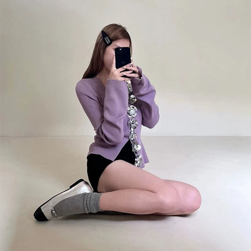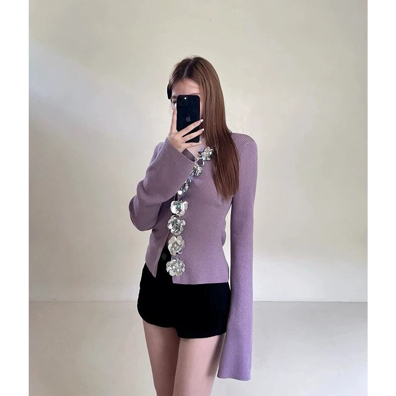 カーディガン シルバー カメリア 薔薇 フラワー 紫 パープル トップス