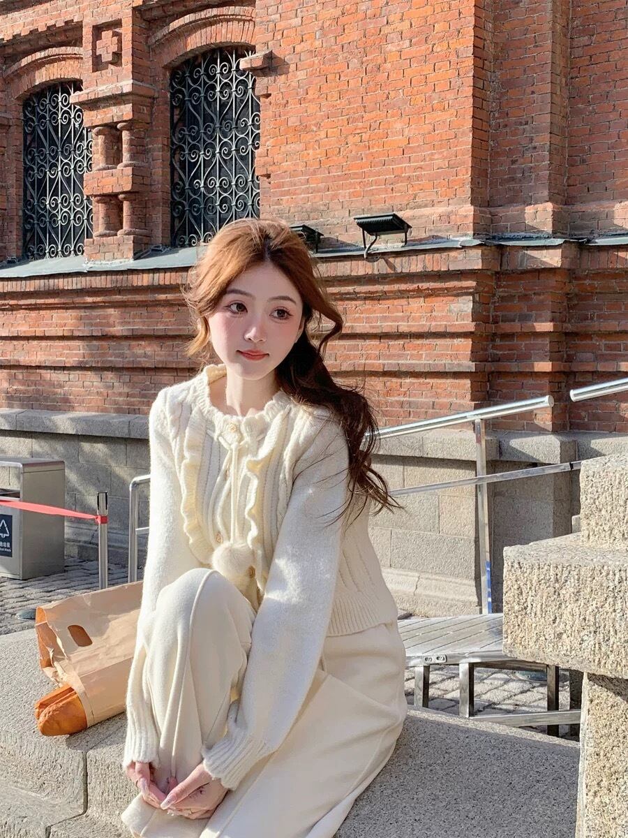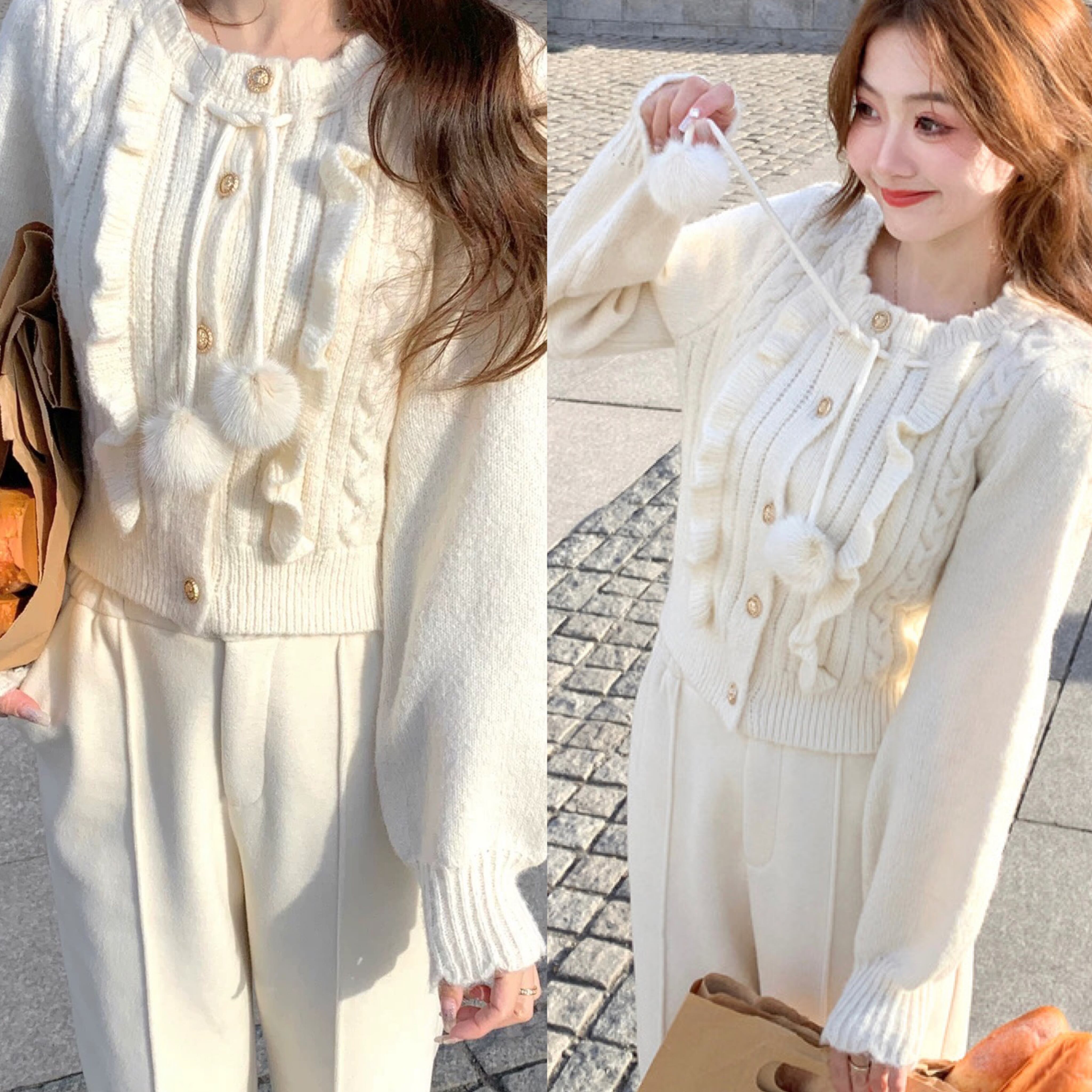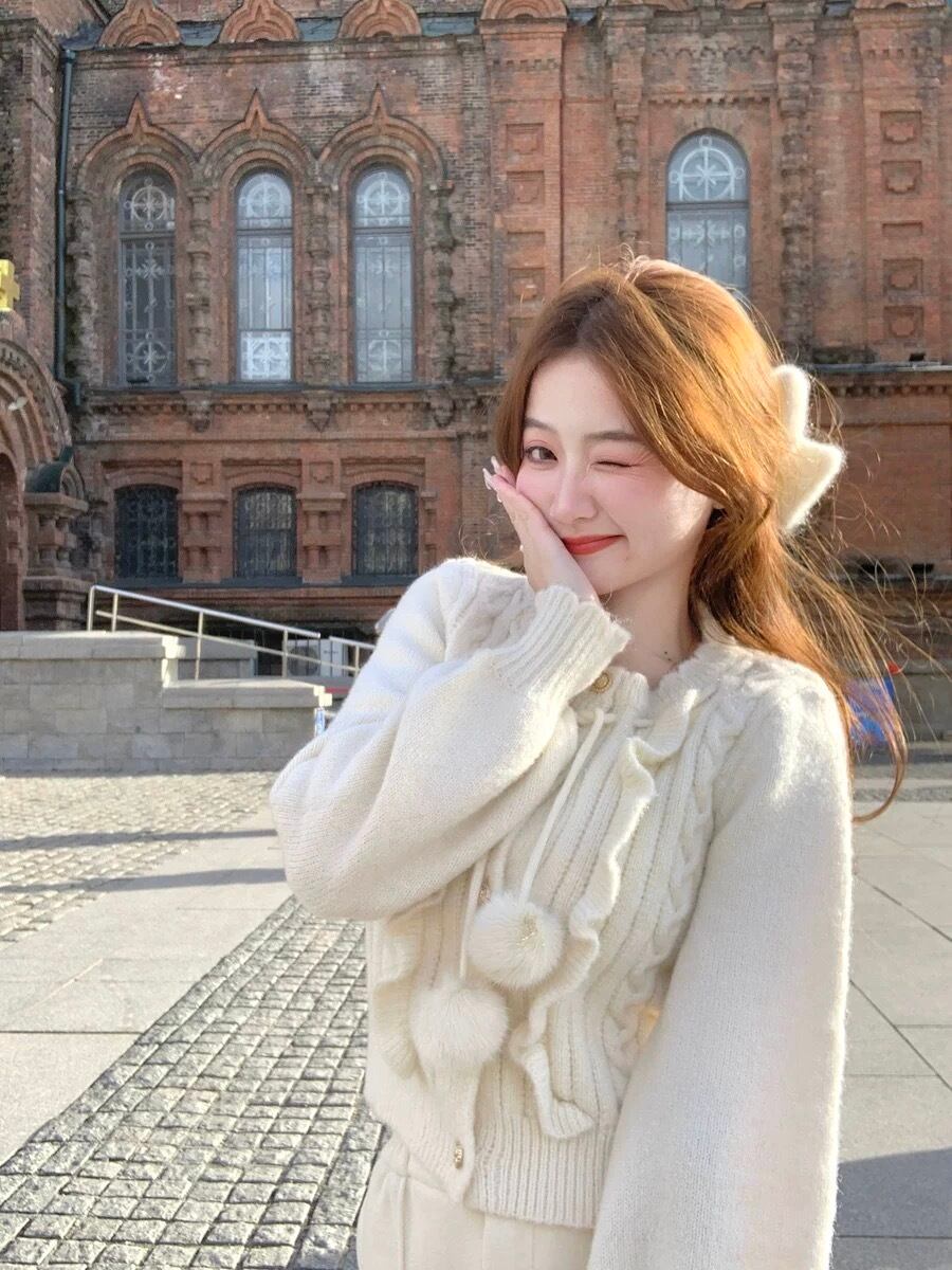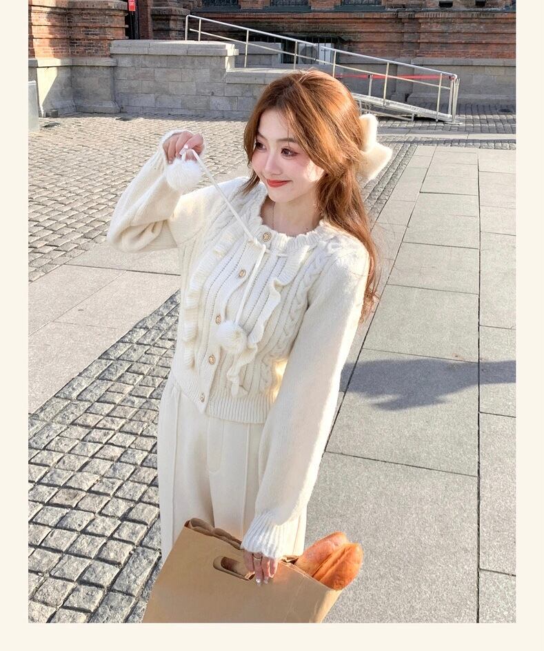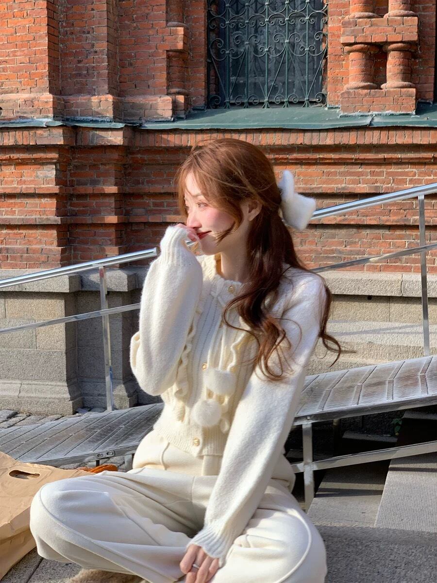 カーディガン 白 ホワイト セーター リボン ぽんぽん