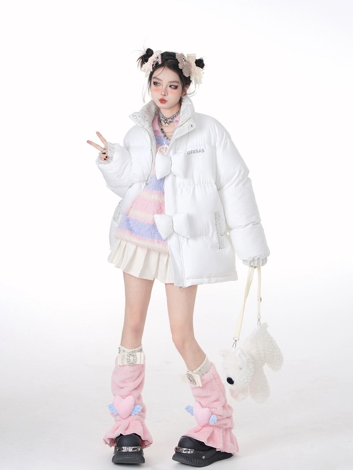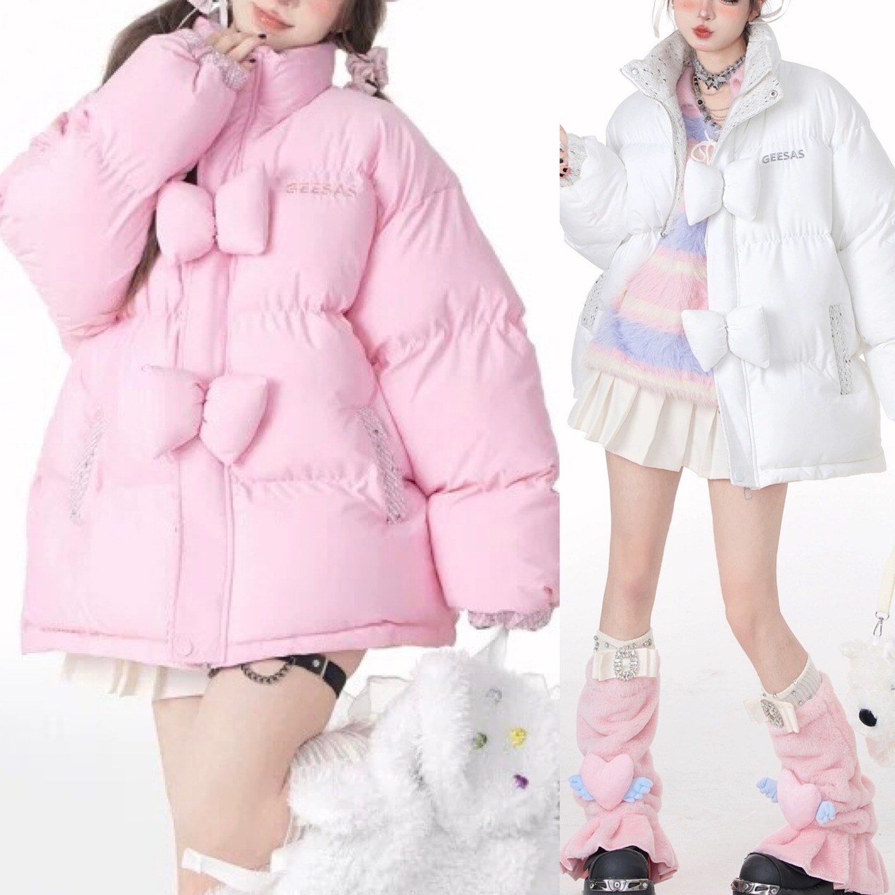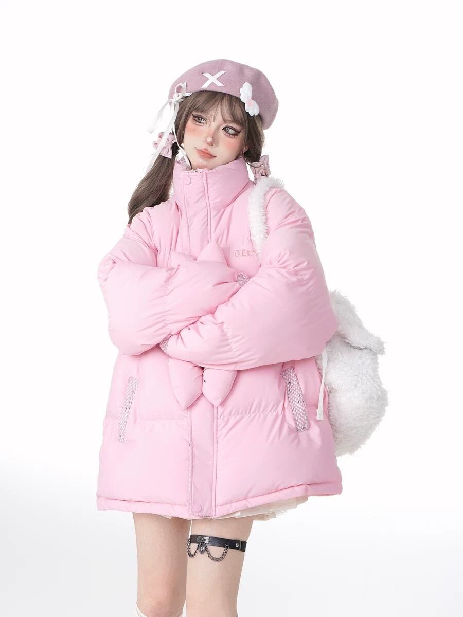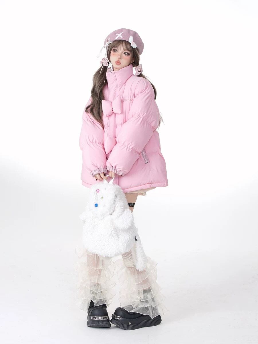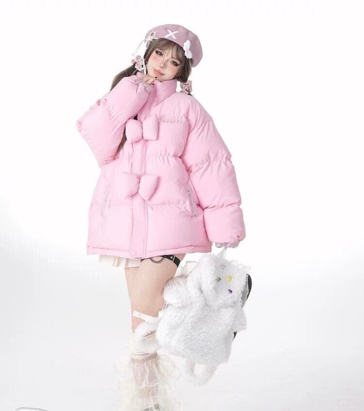 ダウンコート アウター リボン XL 白 ピンク ジャケット カーディガン