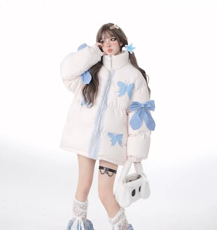 【水色】ダウンコート アウター XL パーカー リボン ガーリー 白 ジャケット ジャンパー カーディガン