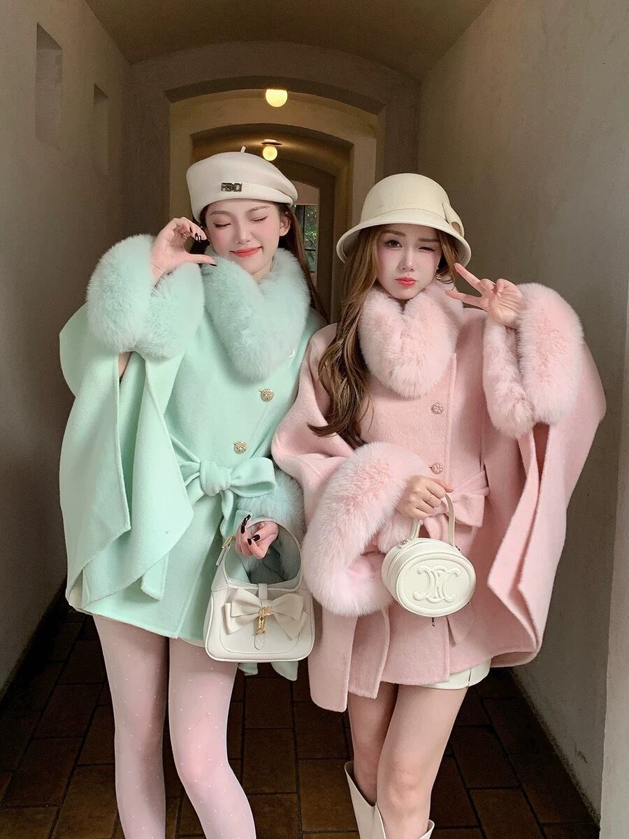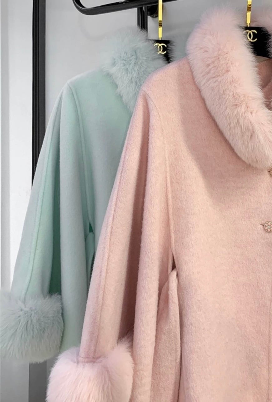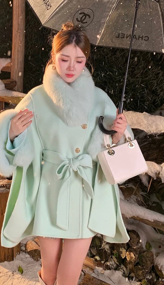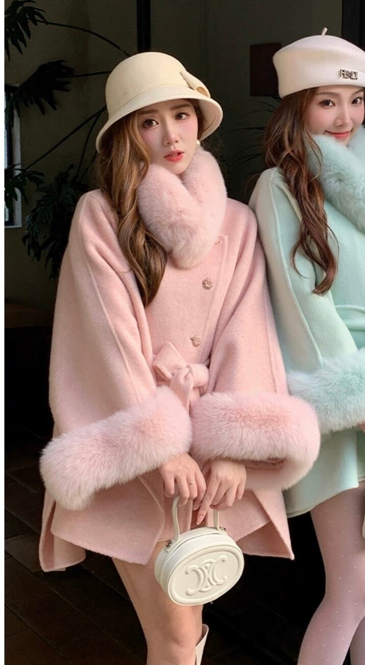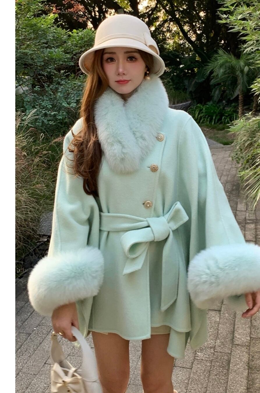 マント コート 水色 緑 ファー リボン 可愛い ジャケット アウター カーディガン コート ガーリー ポンチョ