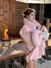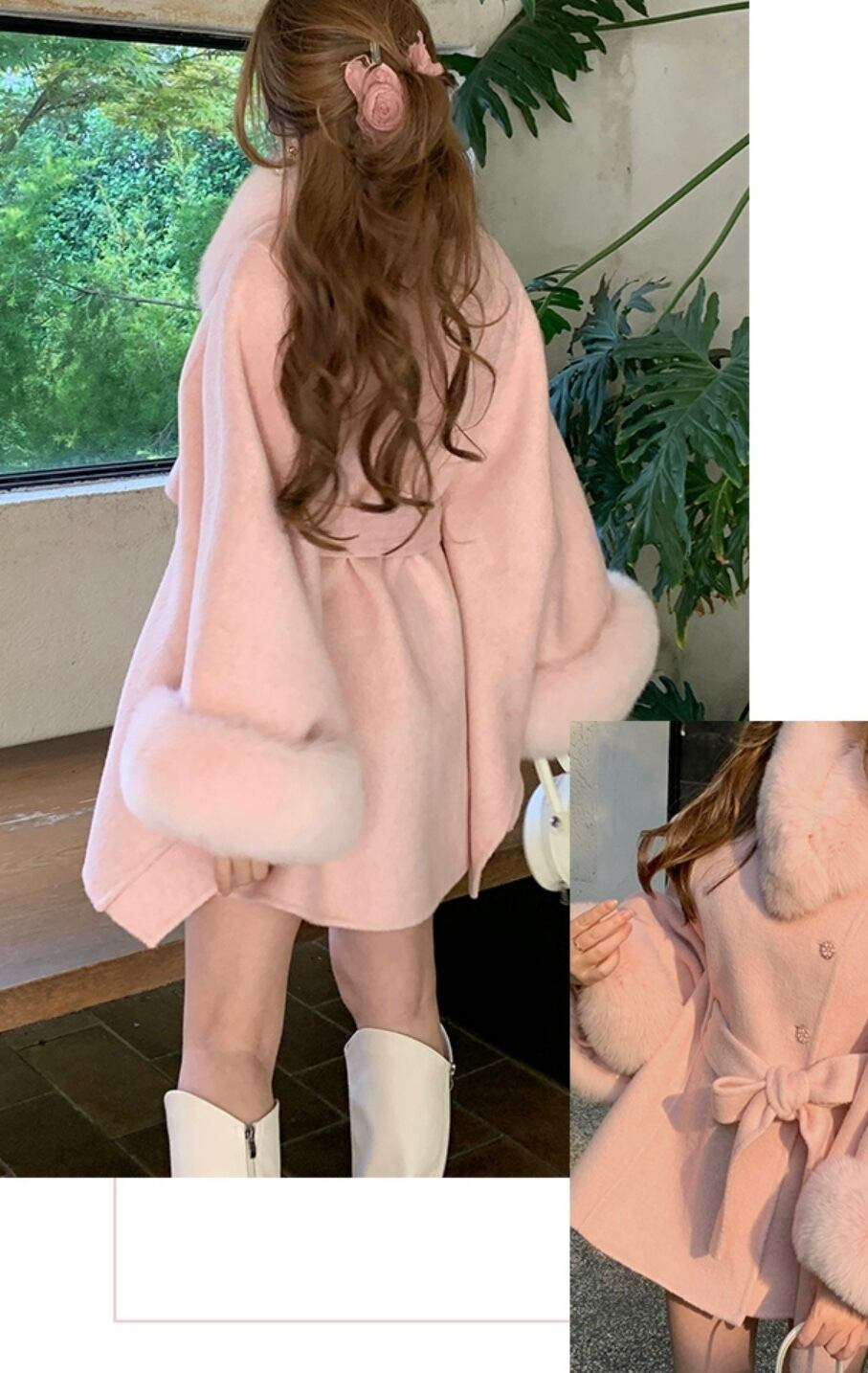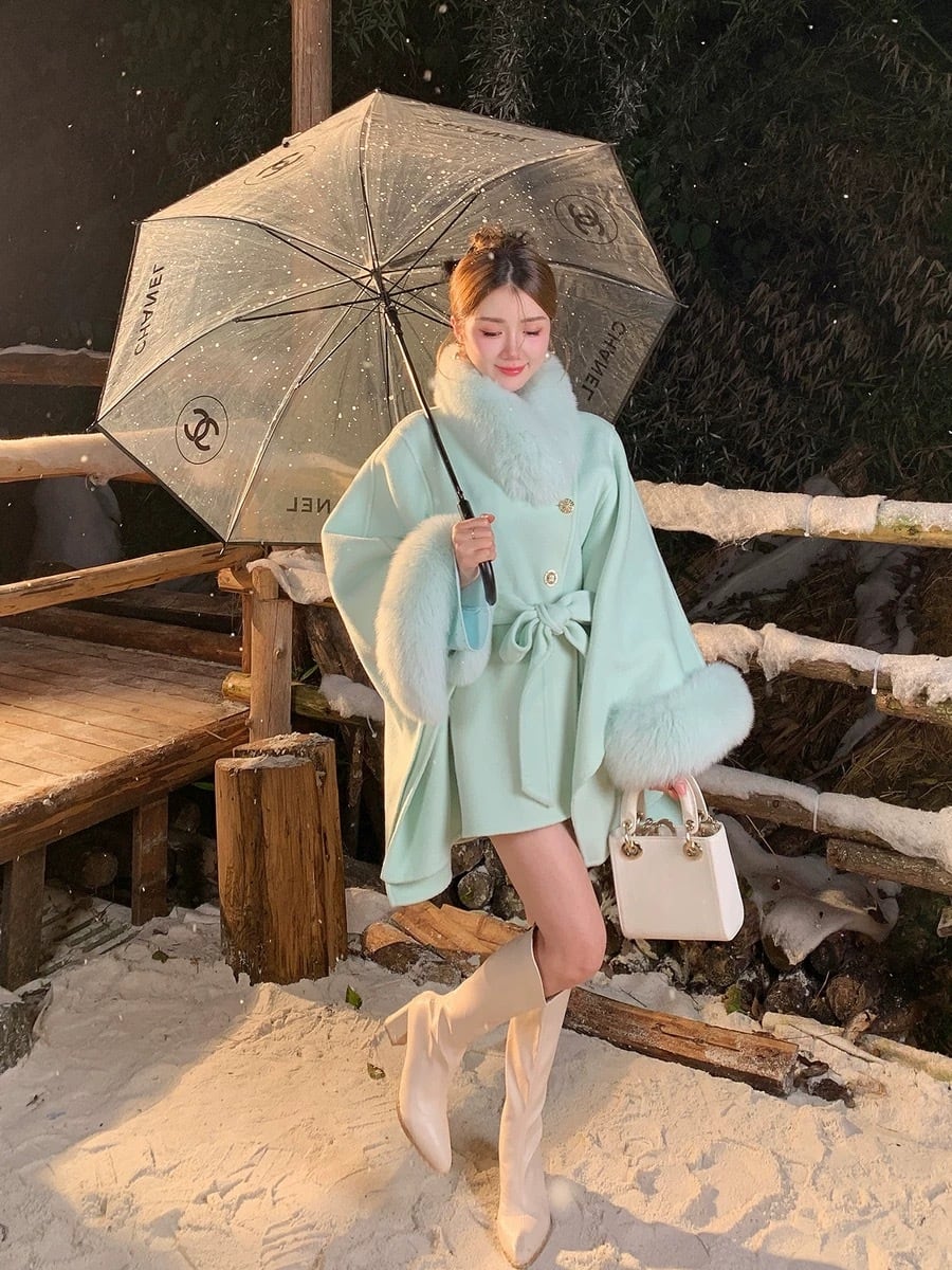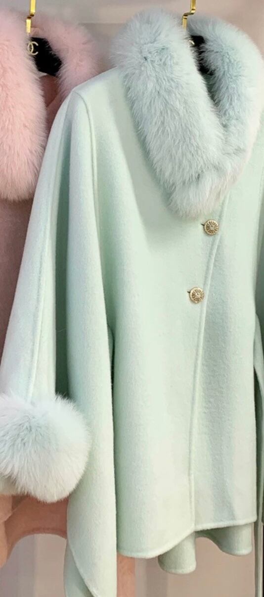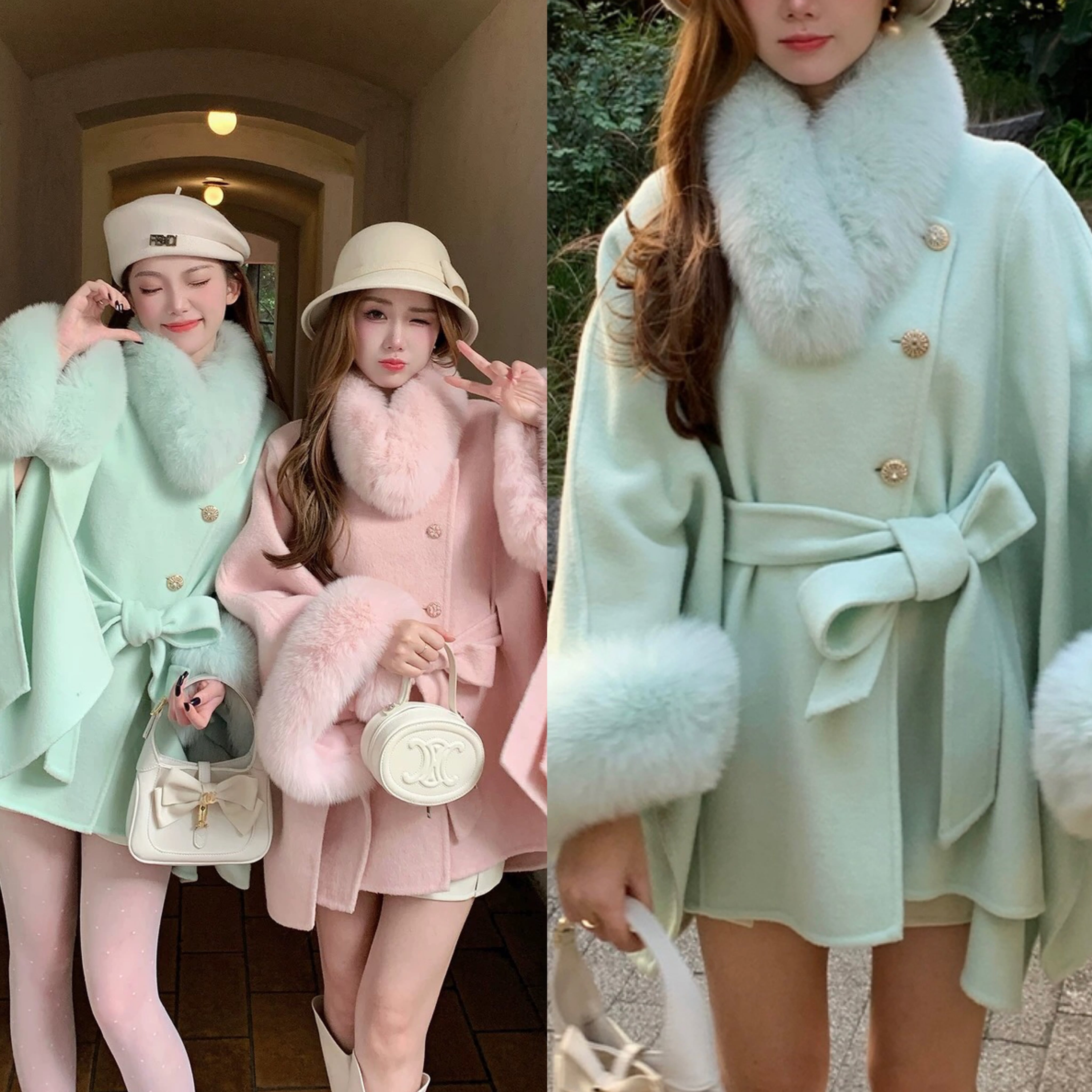 マント コート 水色 緑 ファー リボン 可愛い ジャケット アウター カーディガン コート ガーリー ポンチョ