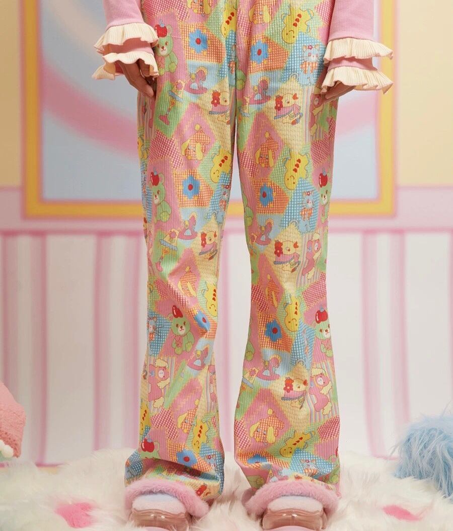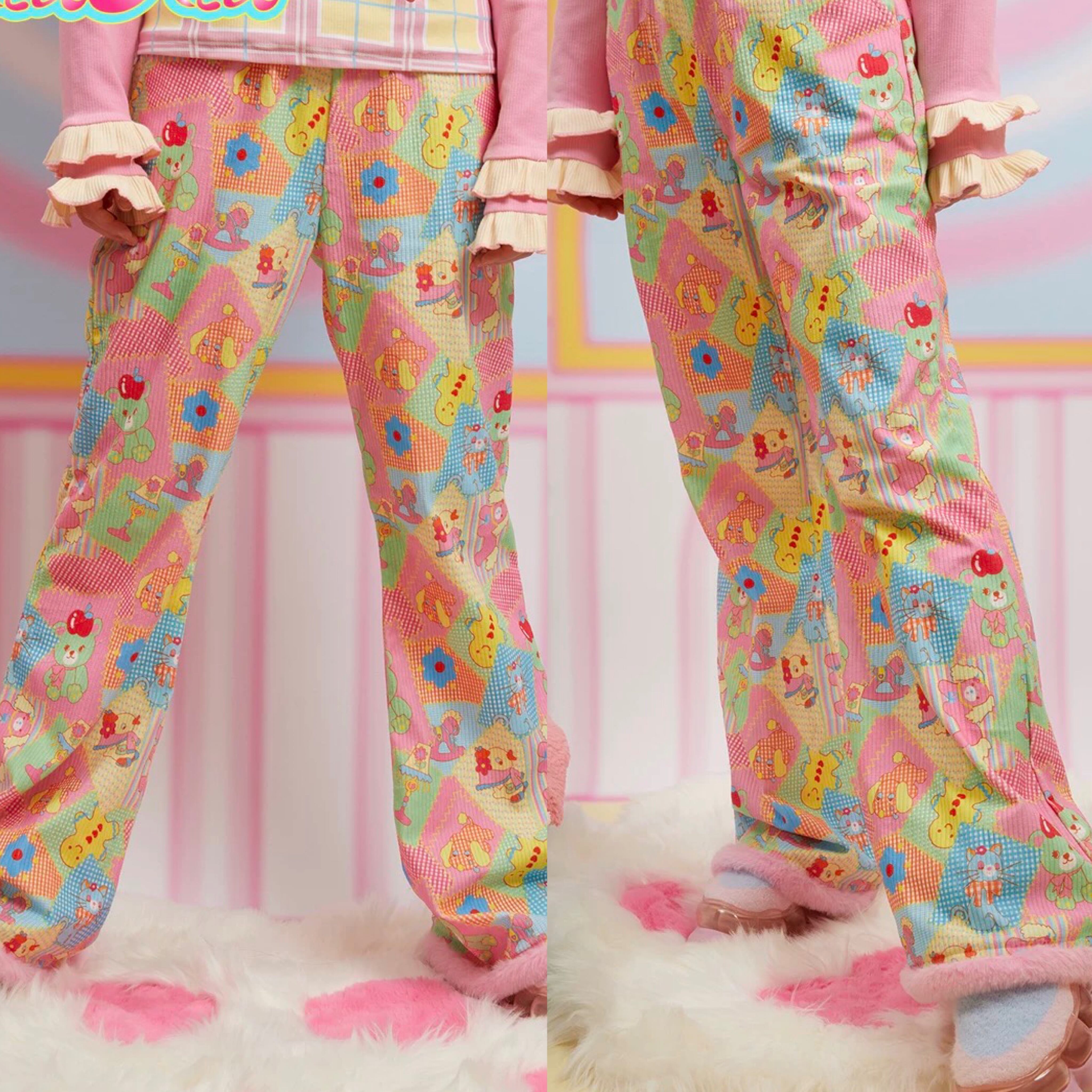 パンツ ピンク 赤 パッチワーク レインボー カラフル 緑 黄色 ガーリー パンツ ボトムス