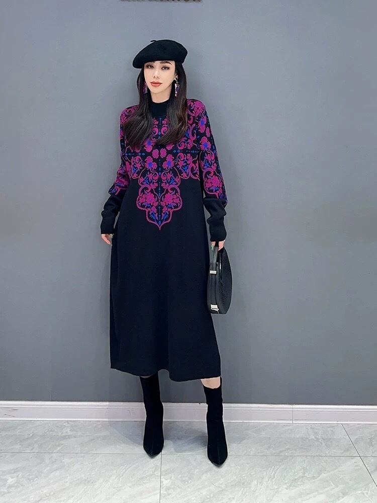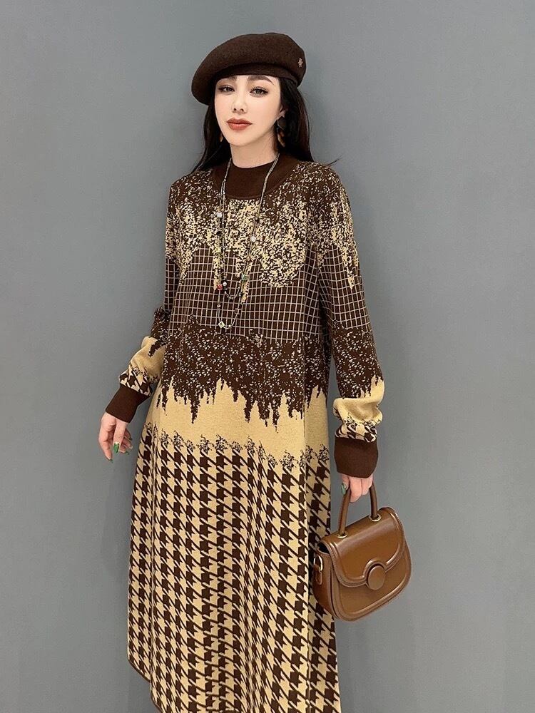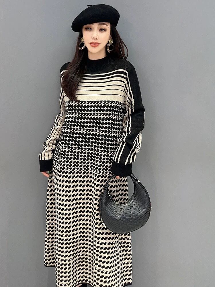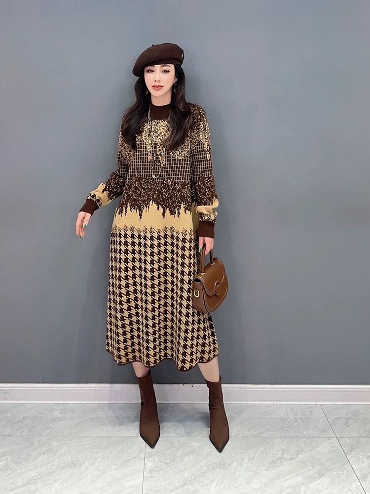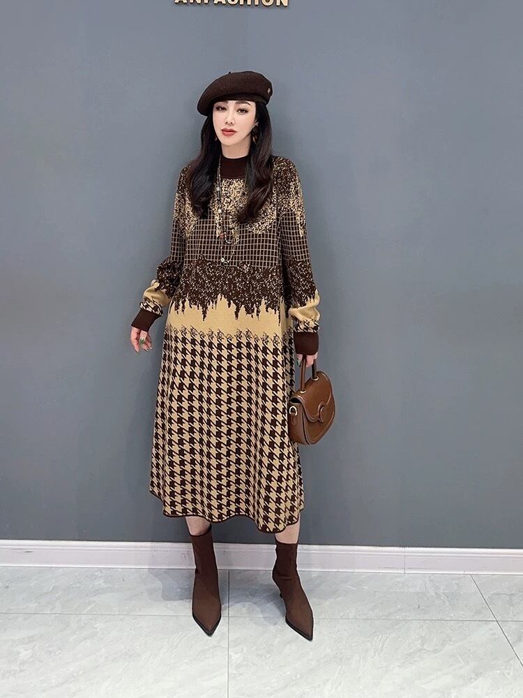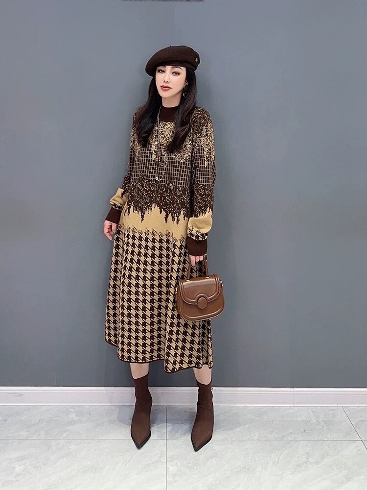 ハイネック セーター ワンピース ベージュ 紫 白 チェック ニット 紫 チェック