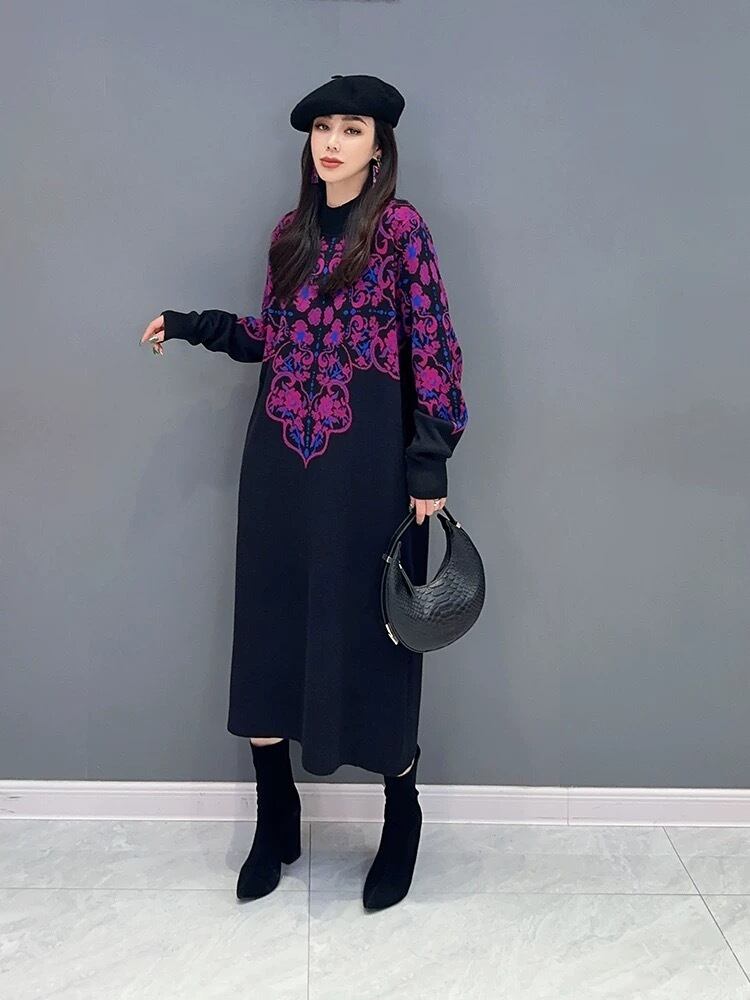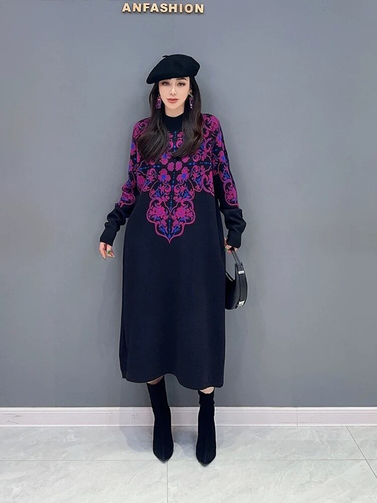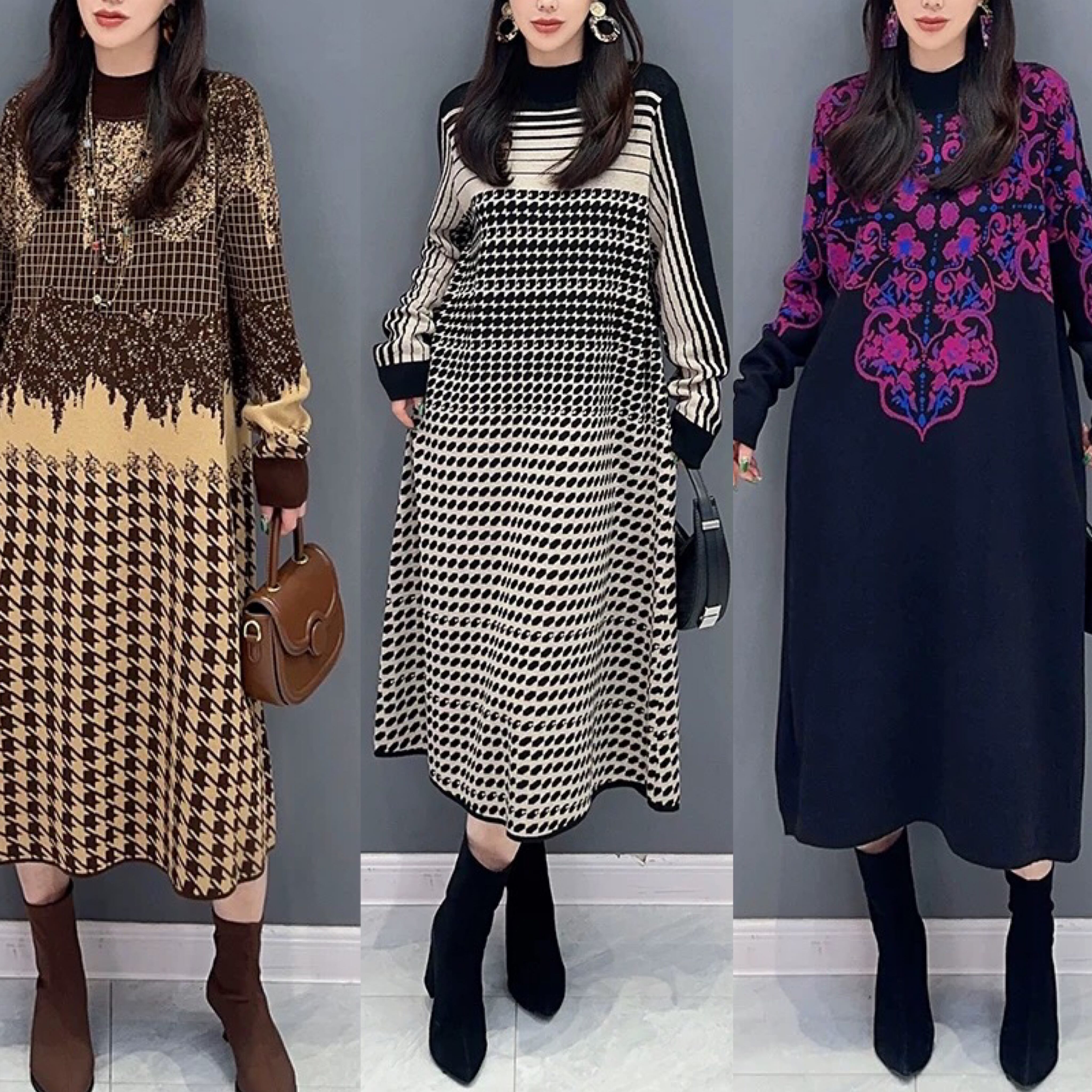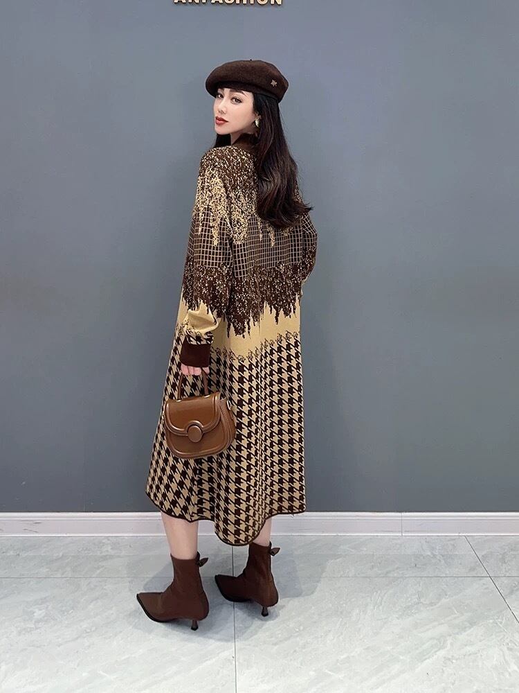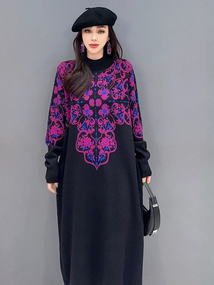 ハイネック セーター ワンピース ベージュ 紫 白 チェック ニット 紫 チェック