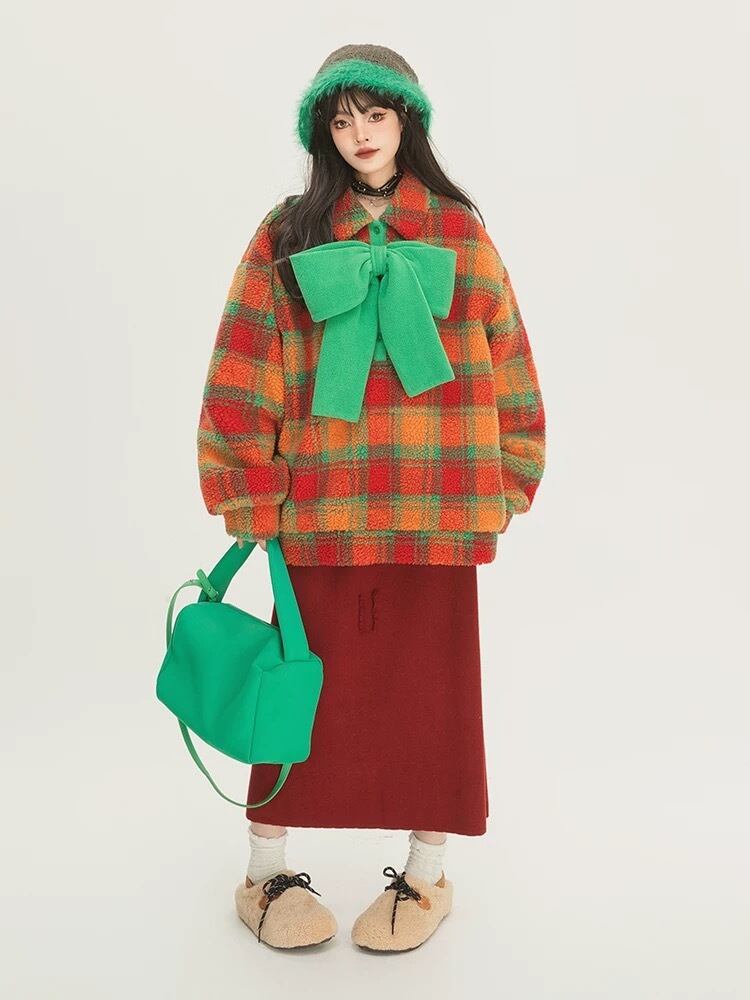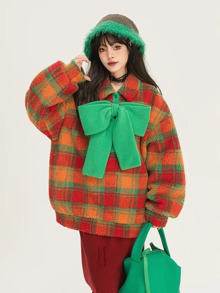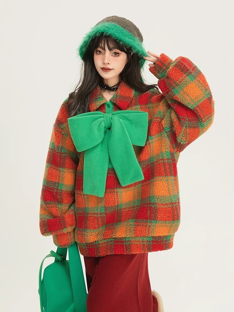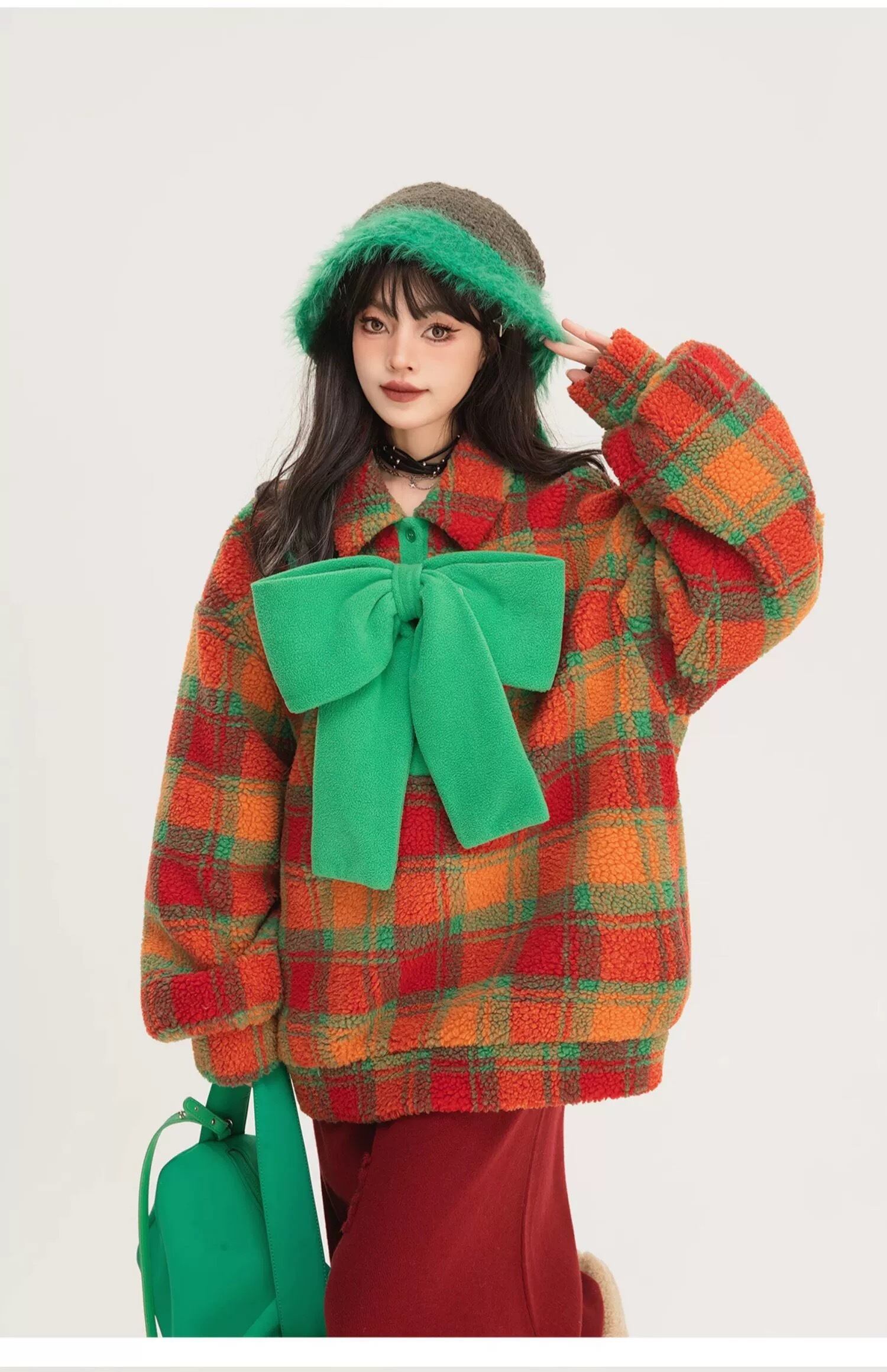 アウター リボン 緑 オレンジ チェック コート ジャケット フリース