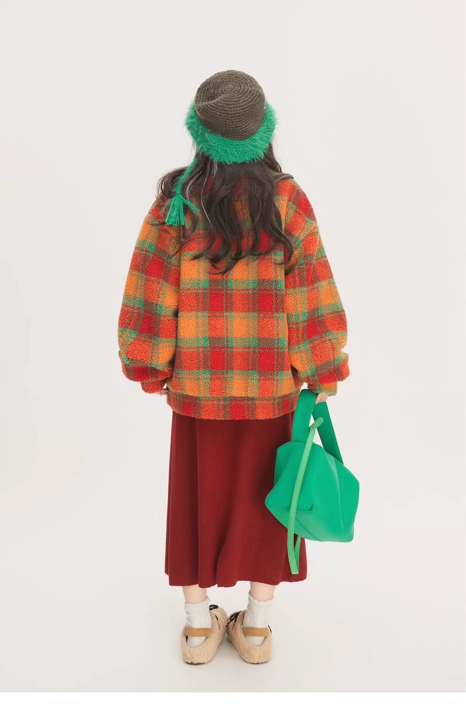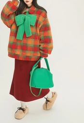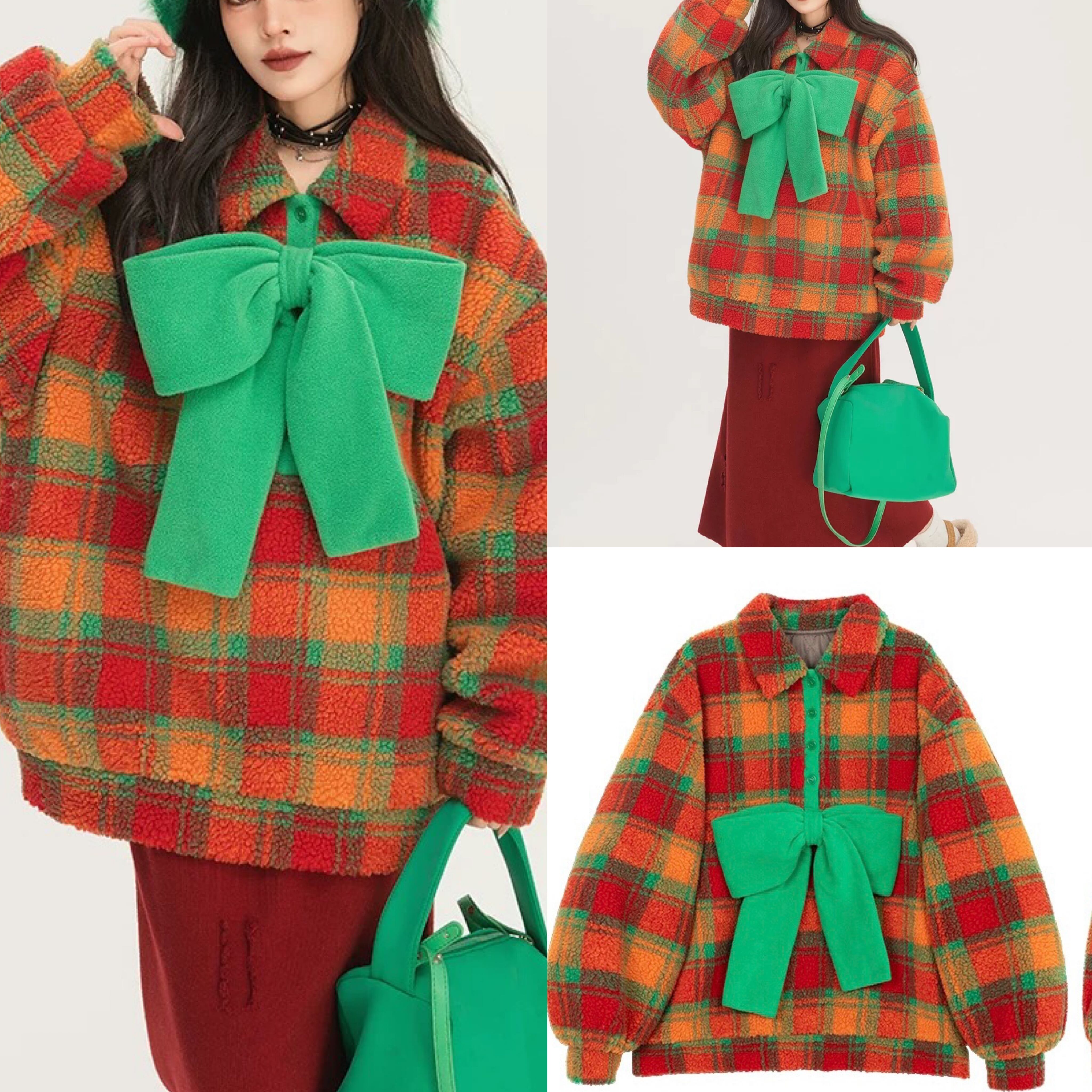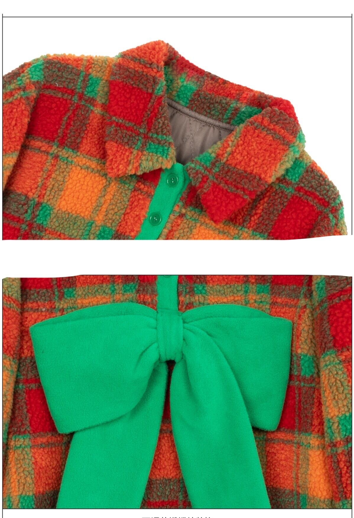 アウター リボン 緑 オレンジ チェック コート ジャケット フリース