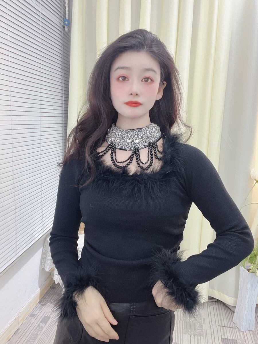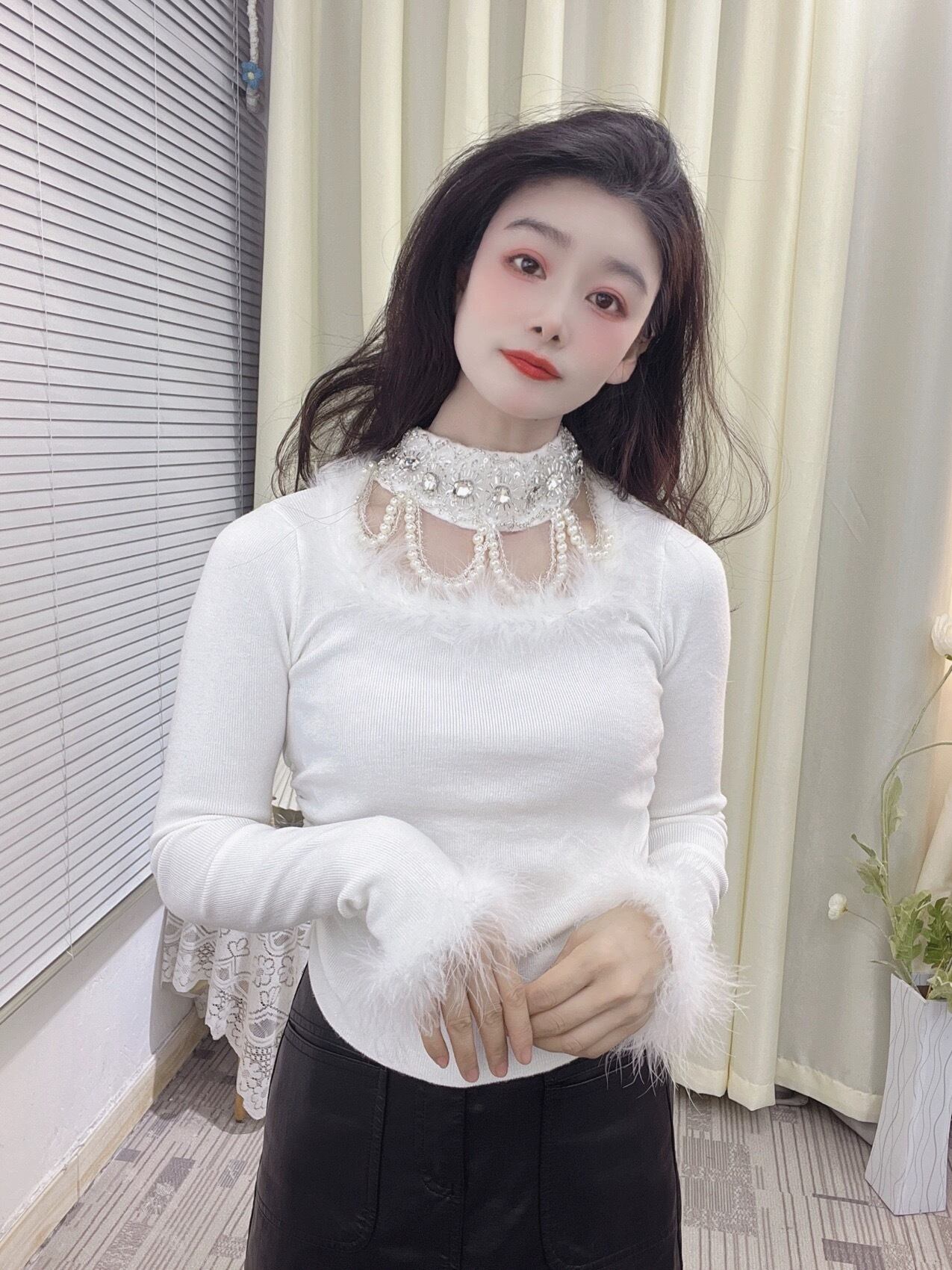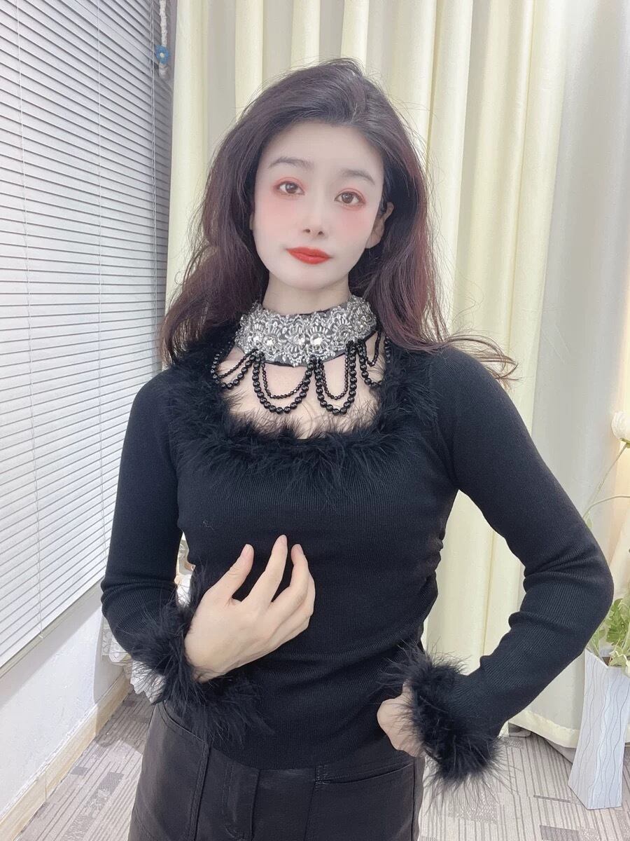 トップス 黒 白 ブラウス ニット カーディガン ファー ハイネック ネックレス ラインストーン