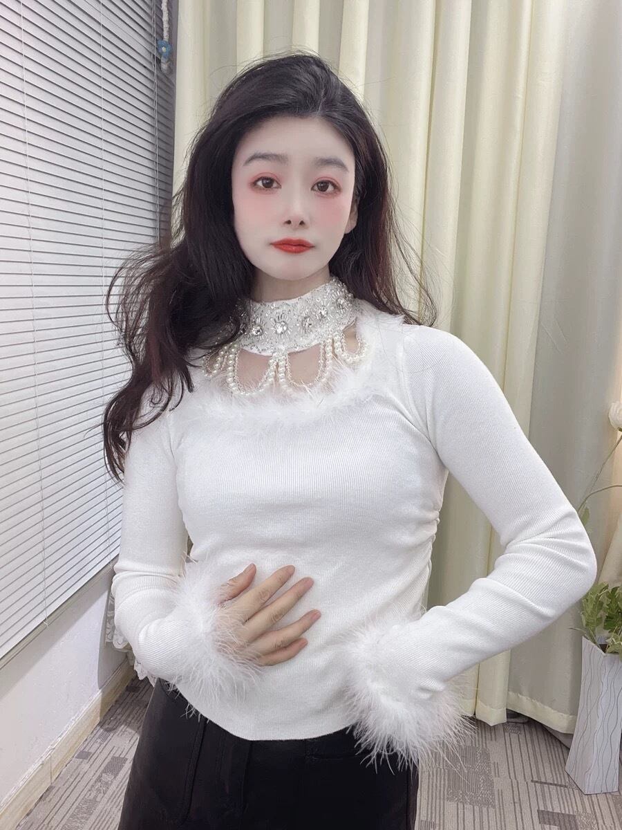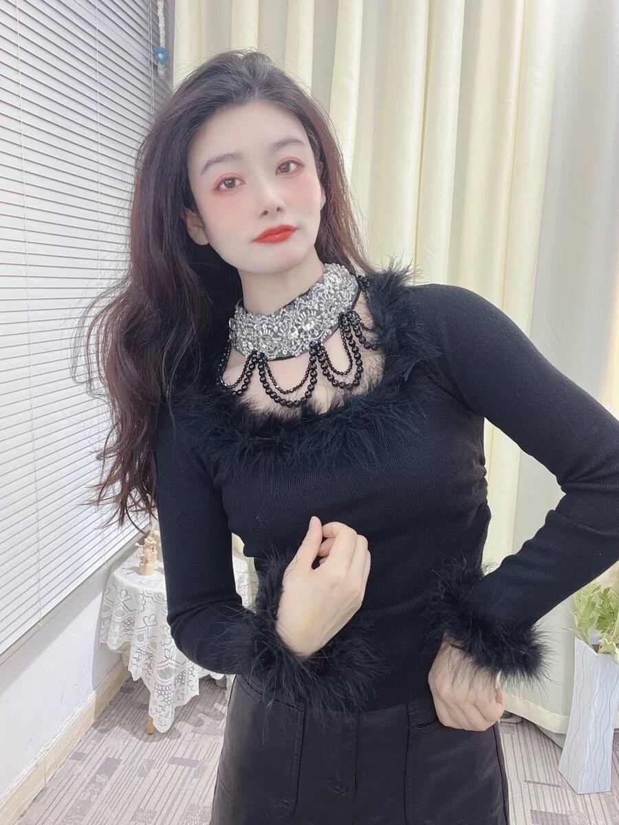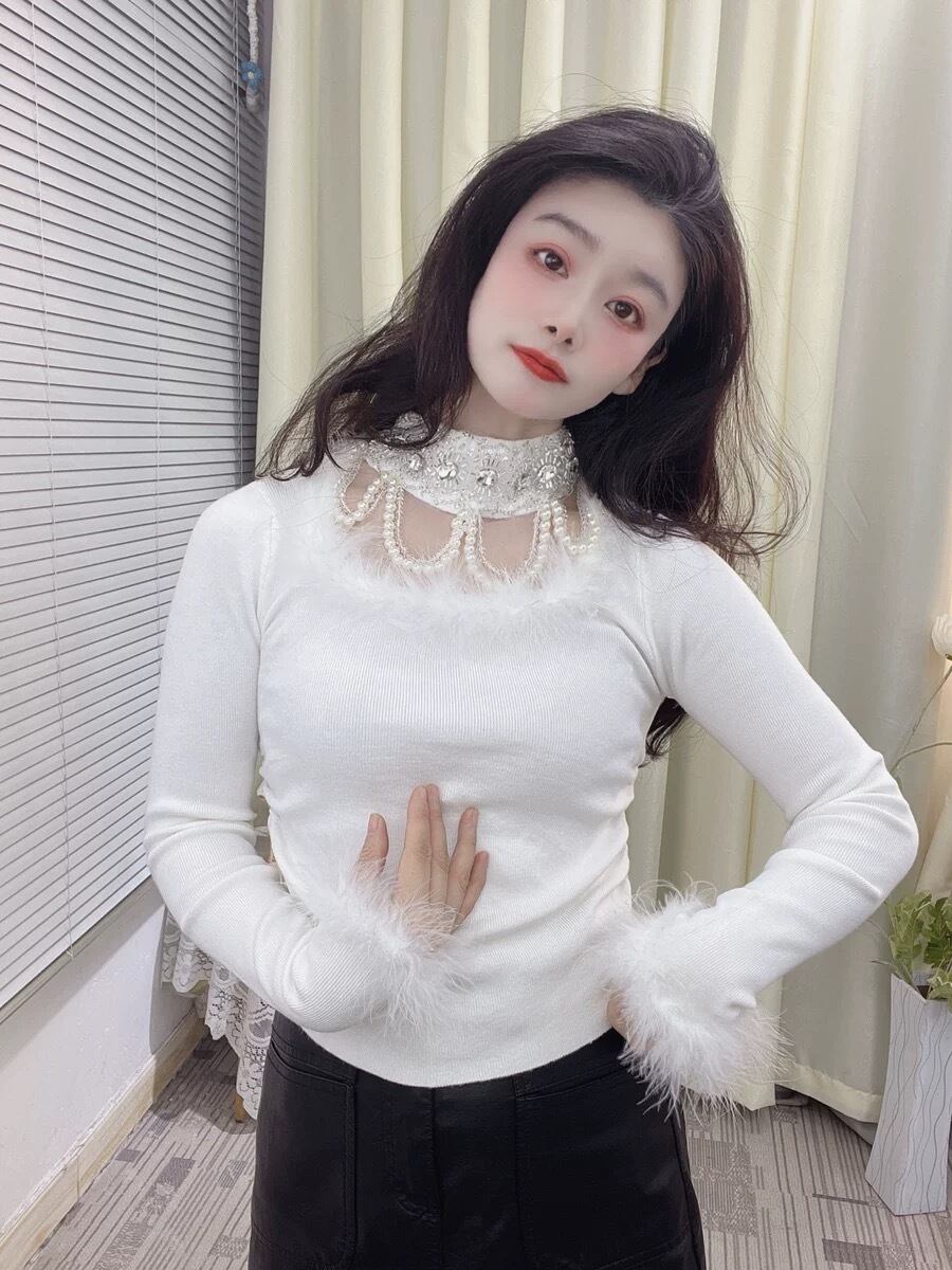 トップス 黒 白 ブラウス ニット カーディガン ファー ハイネック ネックレス ラインストーン