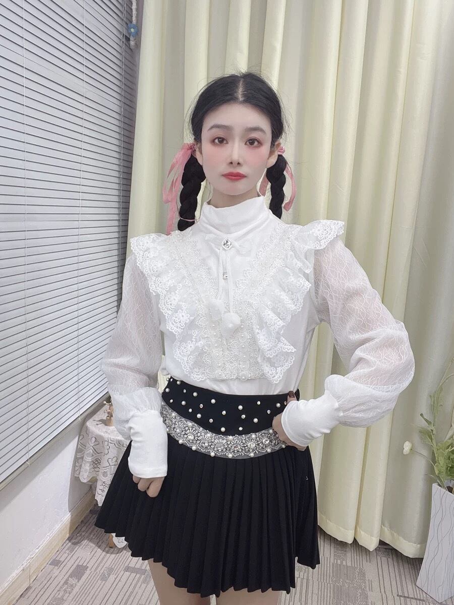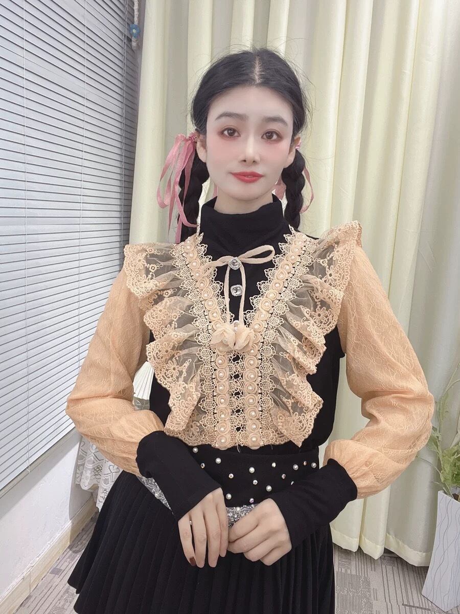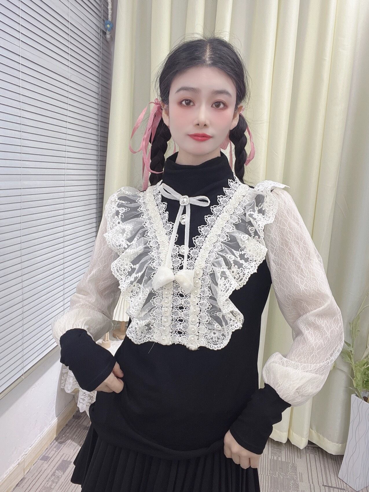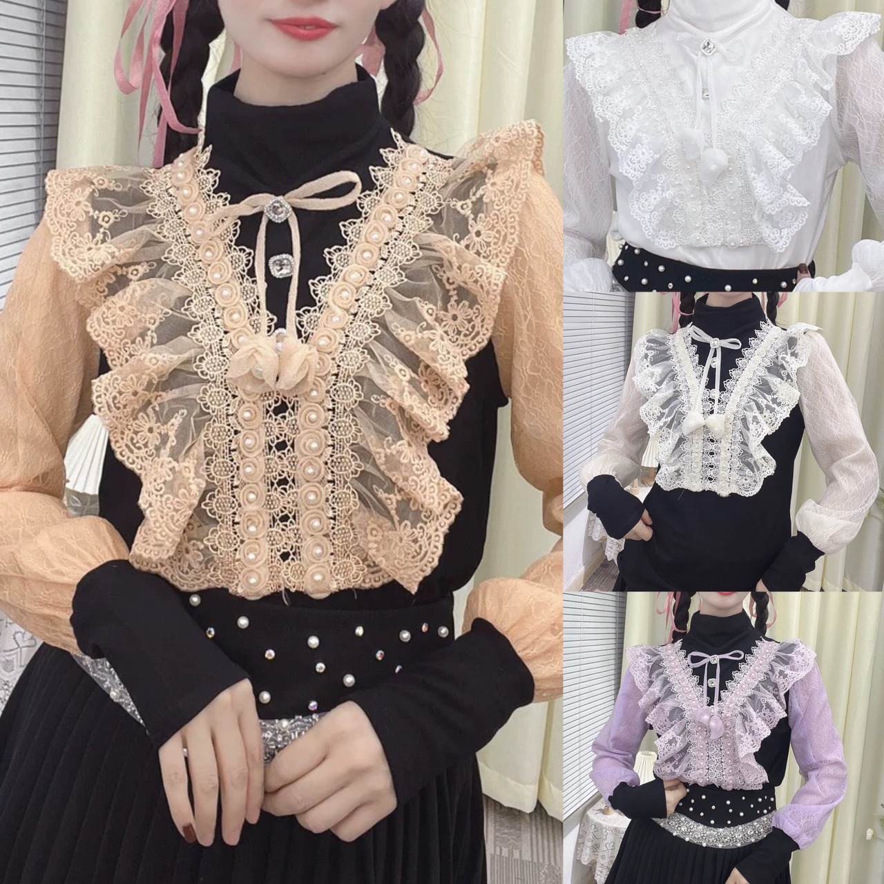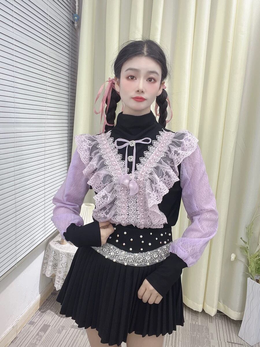 トップス ハイネック 黒 ベージュ ブラウス ガーリー リボン ベージュ 紫 フリル
