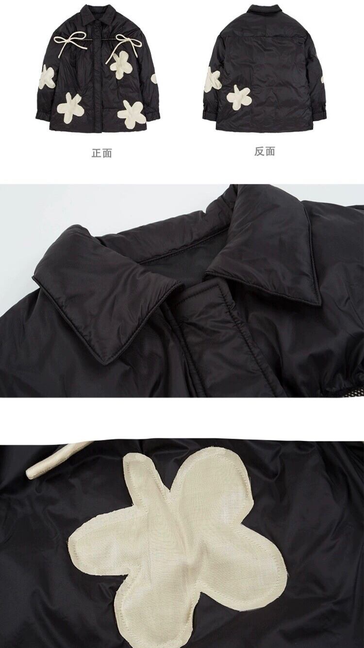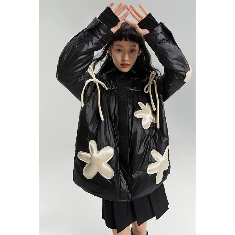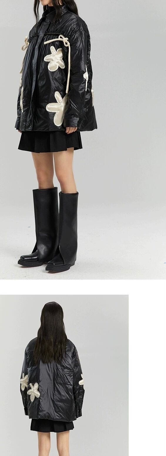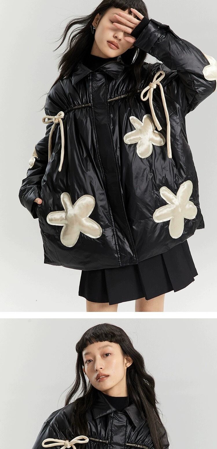 アウター ジャケット ダウン 黒 白 フラワー ダウンコート アウター ジャケット リボン