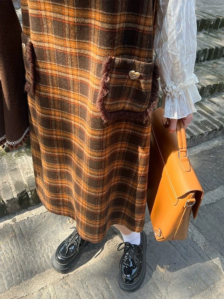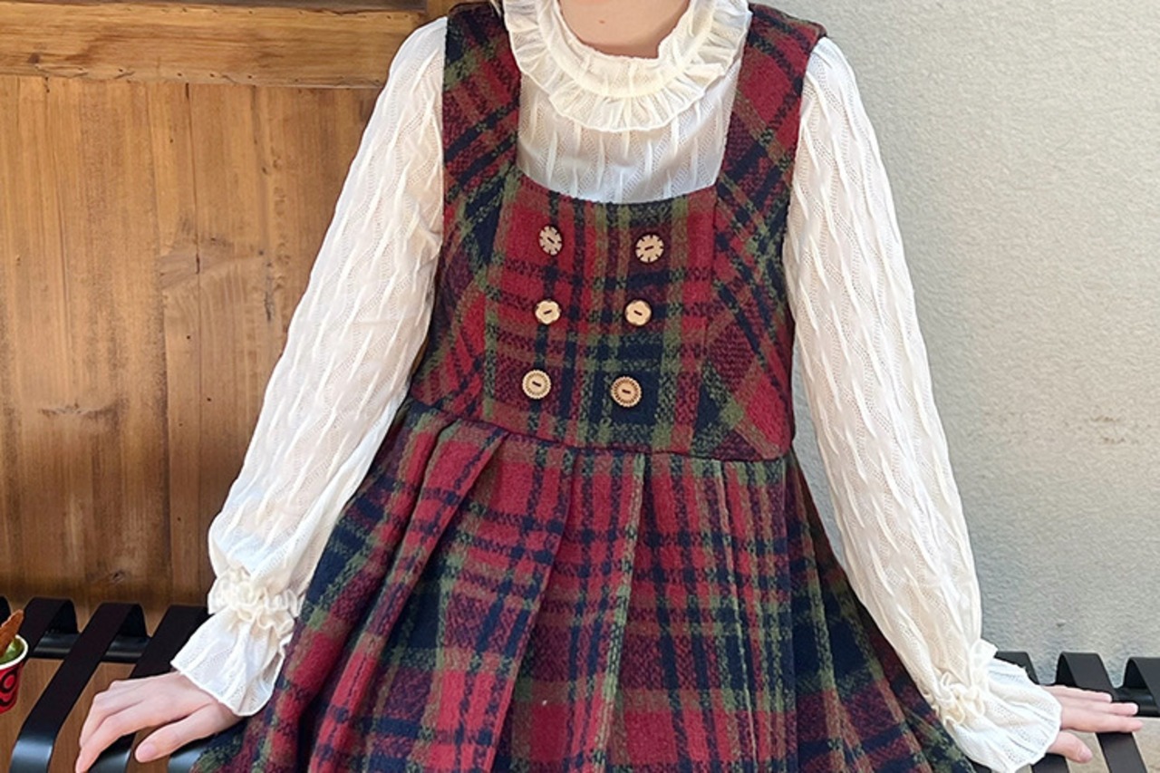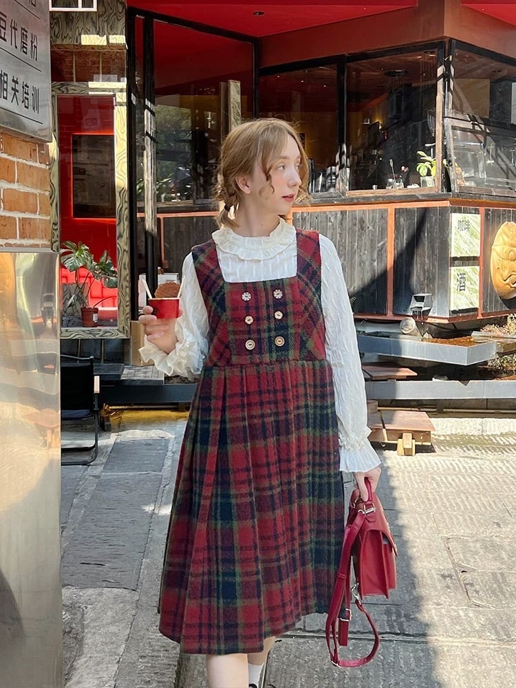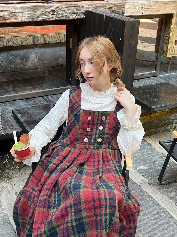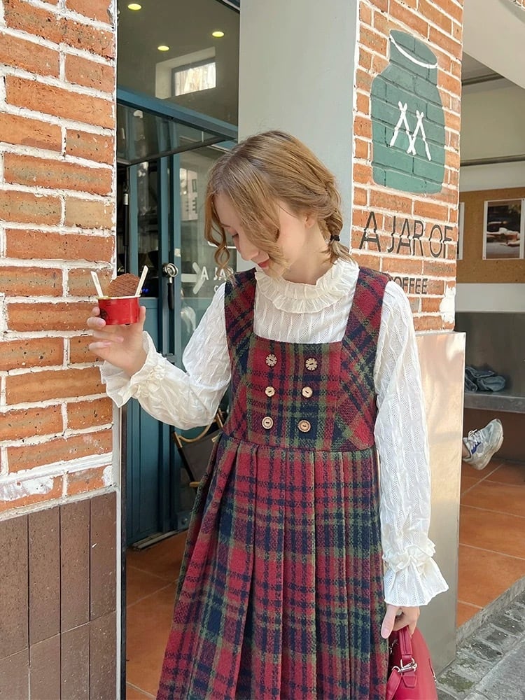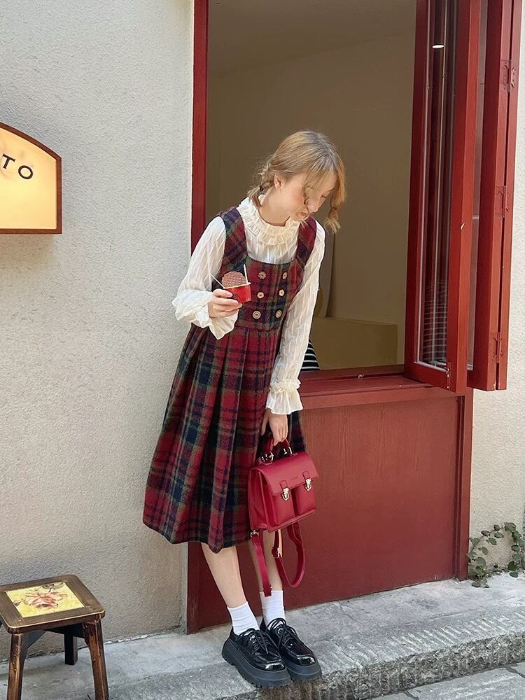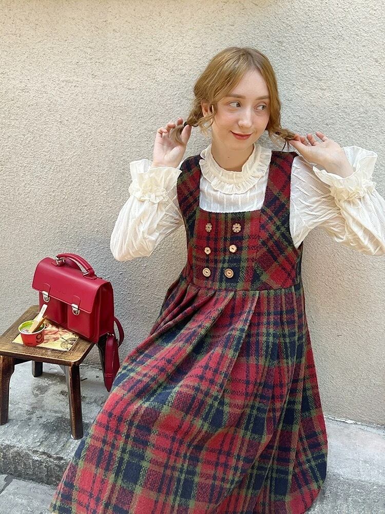 ワンピース チェック 秋冬 茶色 赤 ガーリー マキシ スクール