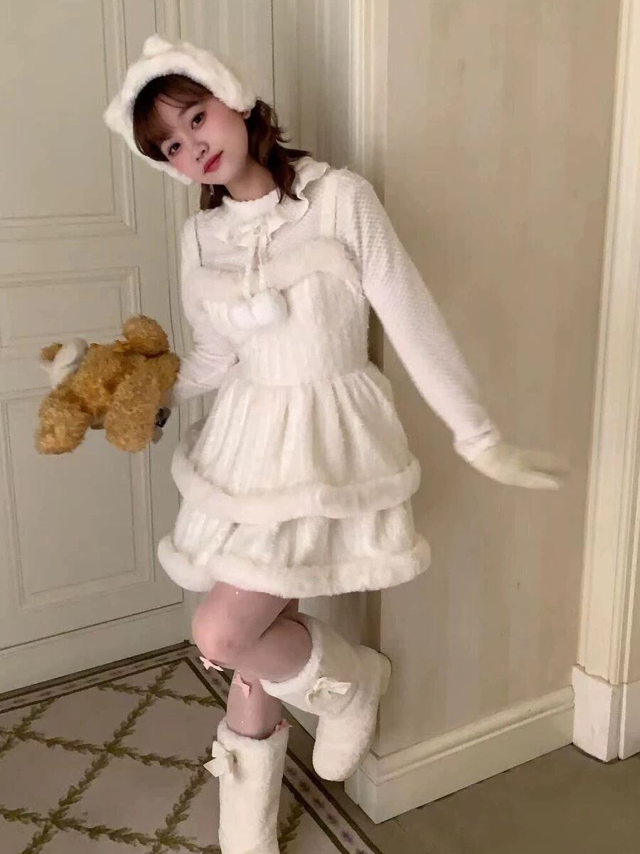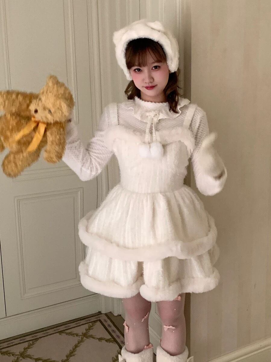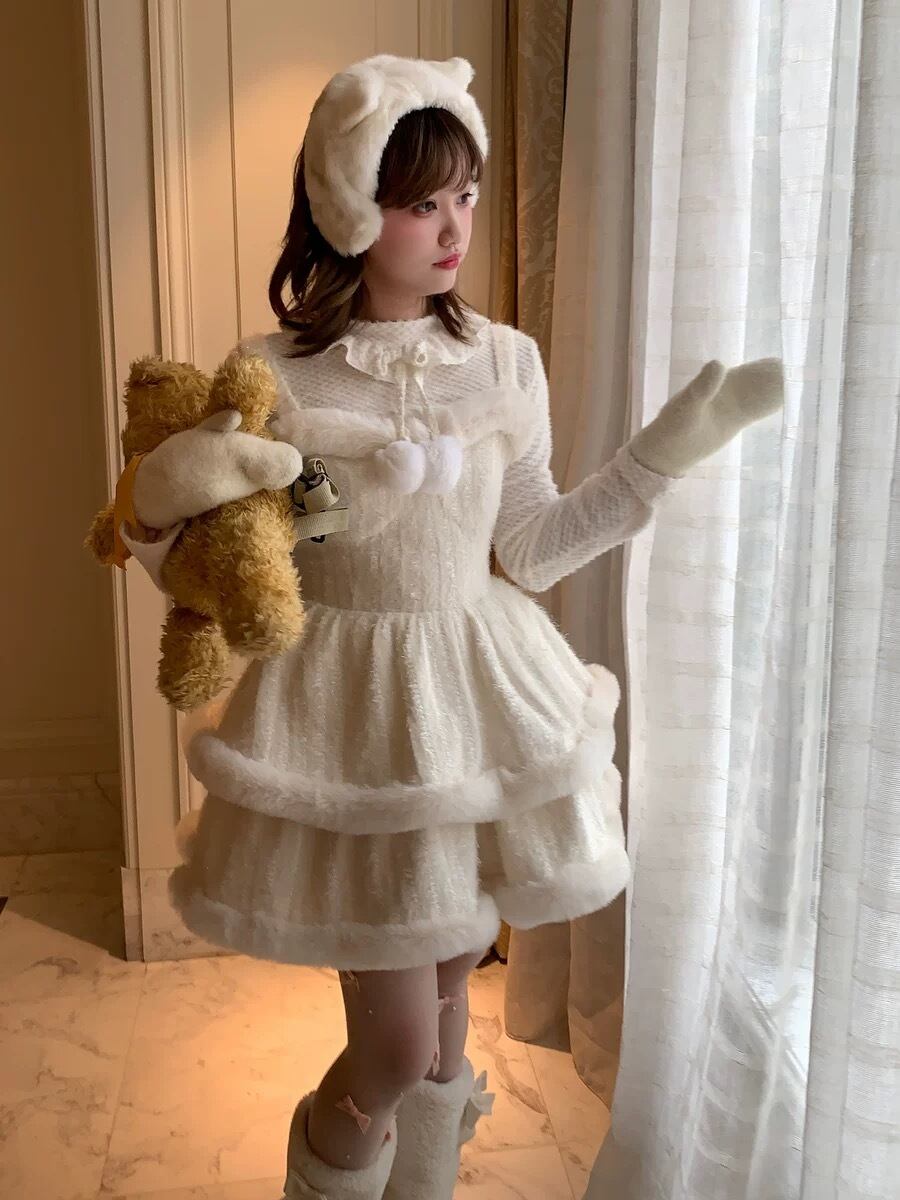 水色 リボン ワンピース ファー 白 キャミソール ブラウス ガーリー 姫 スカート ホワイト