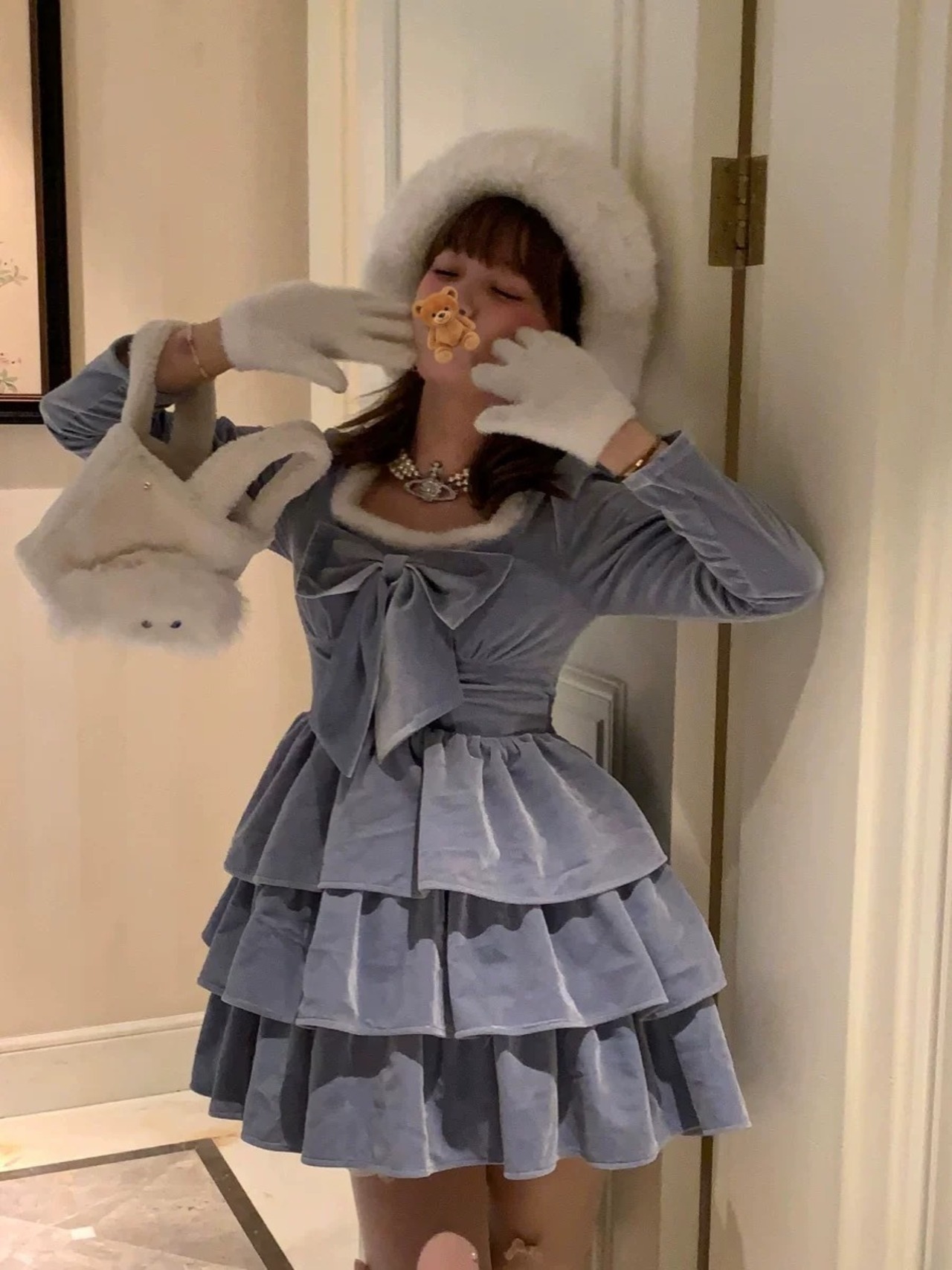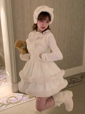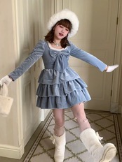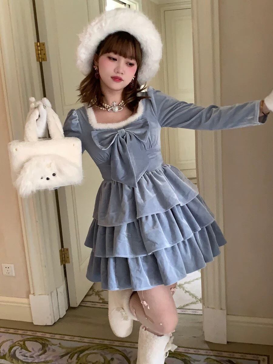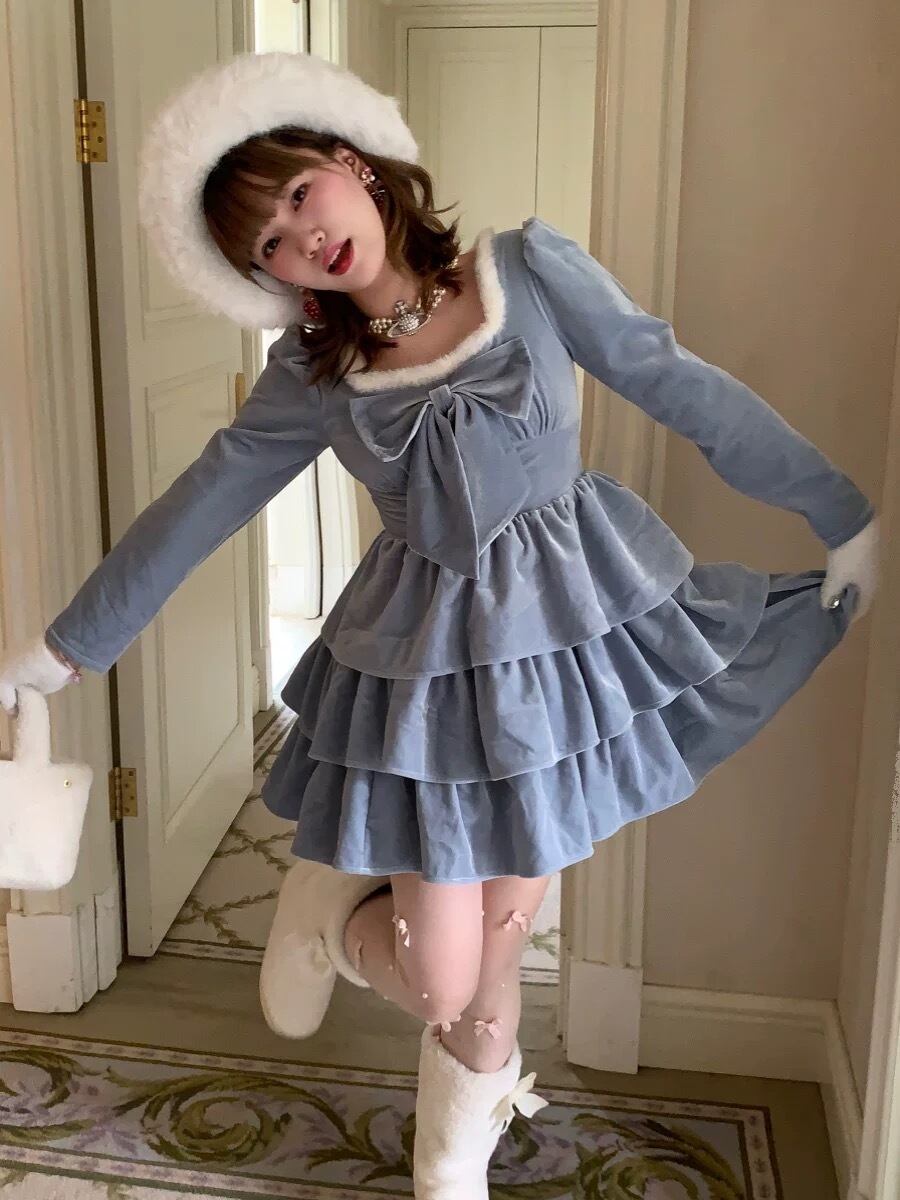 水色 リボン ワンピース ファー 白 キャミソール ブラウス ガーリー 姫 スカート ホワイト