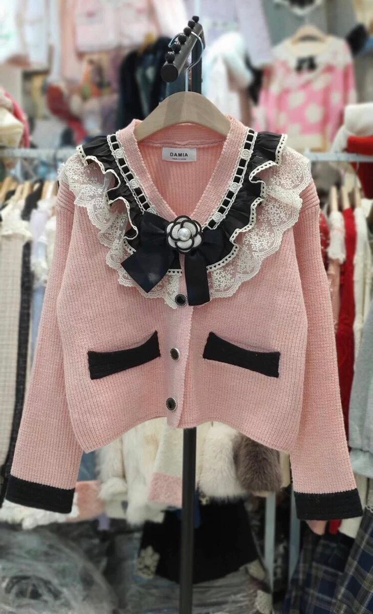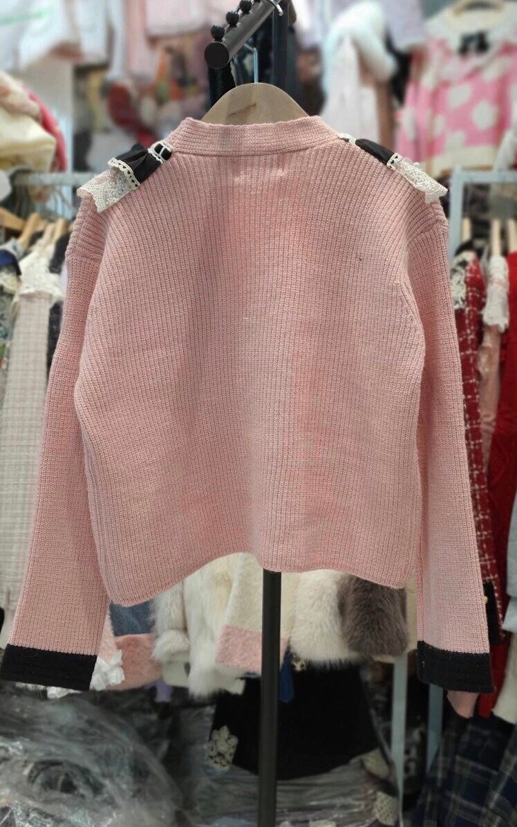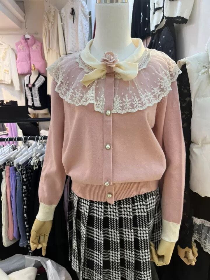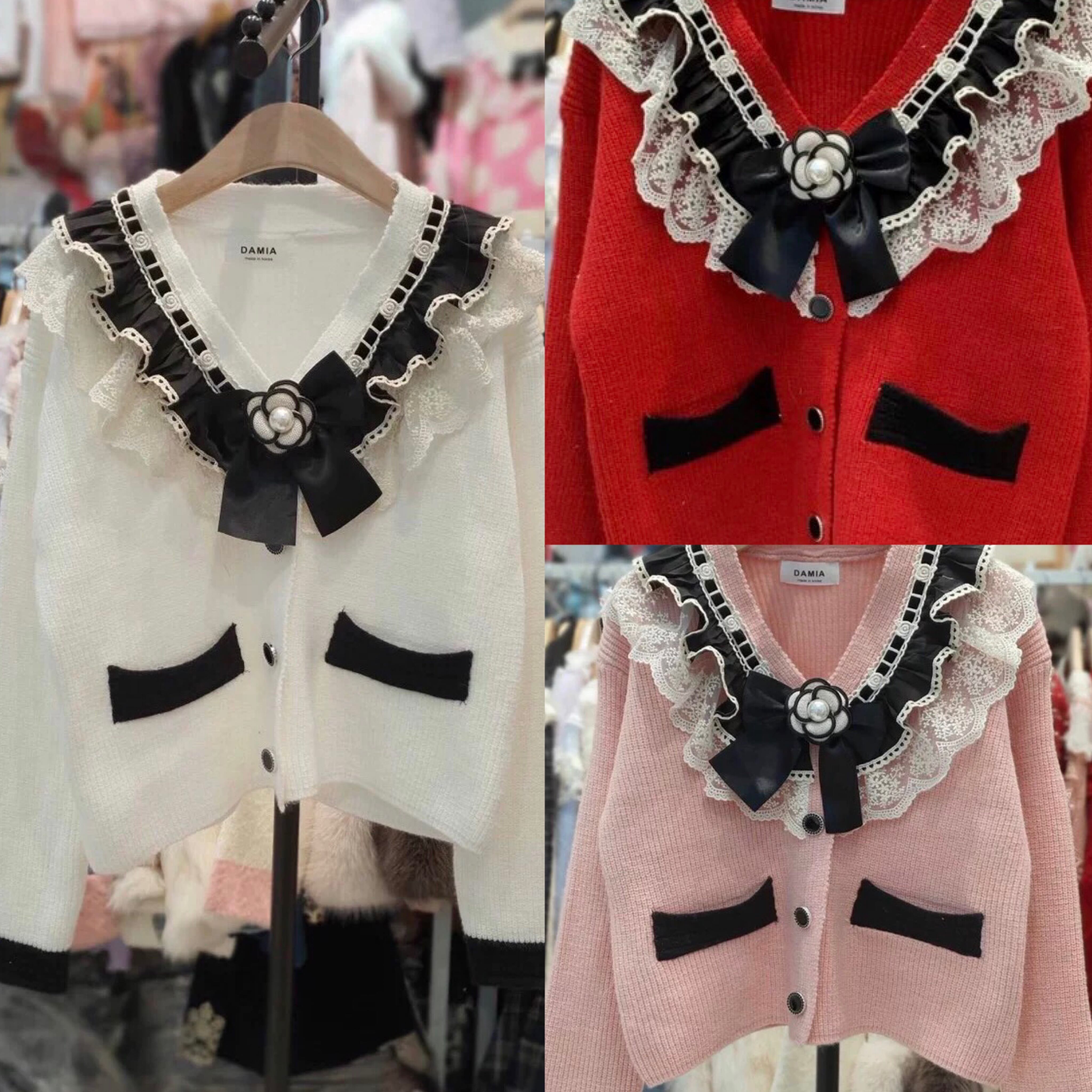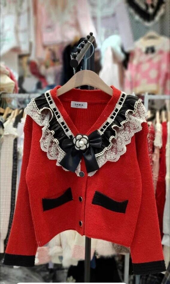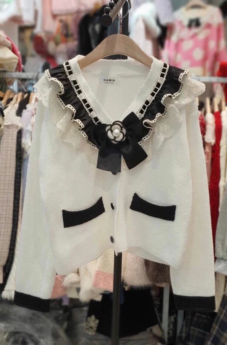 カーディガン お嬢様 カメリア リボン ガーリー ピンク 黒 赤 白 セーター アウター トップス