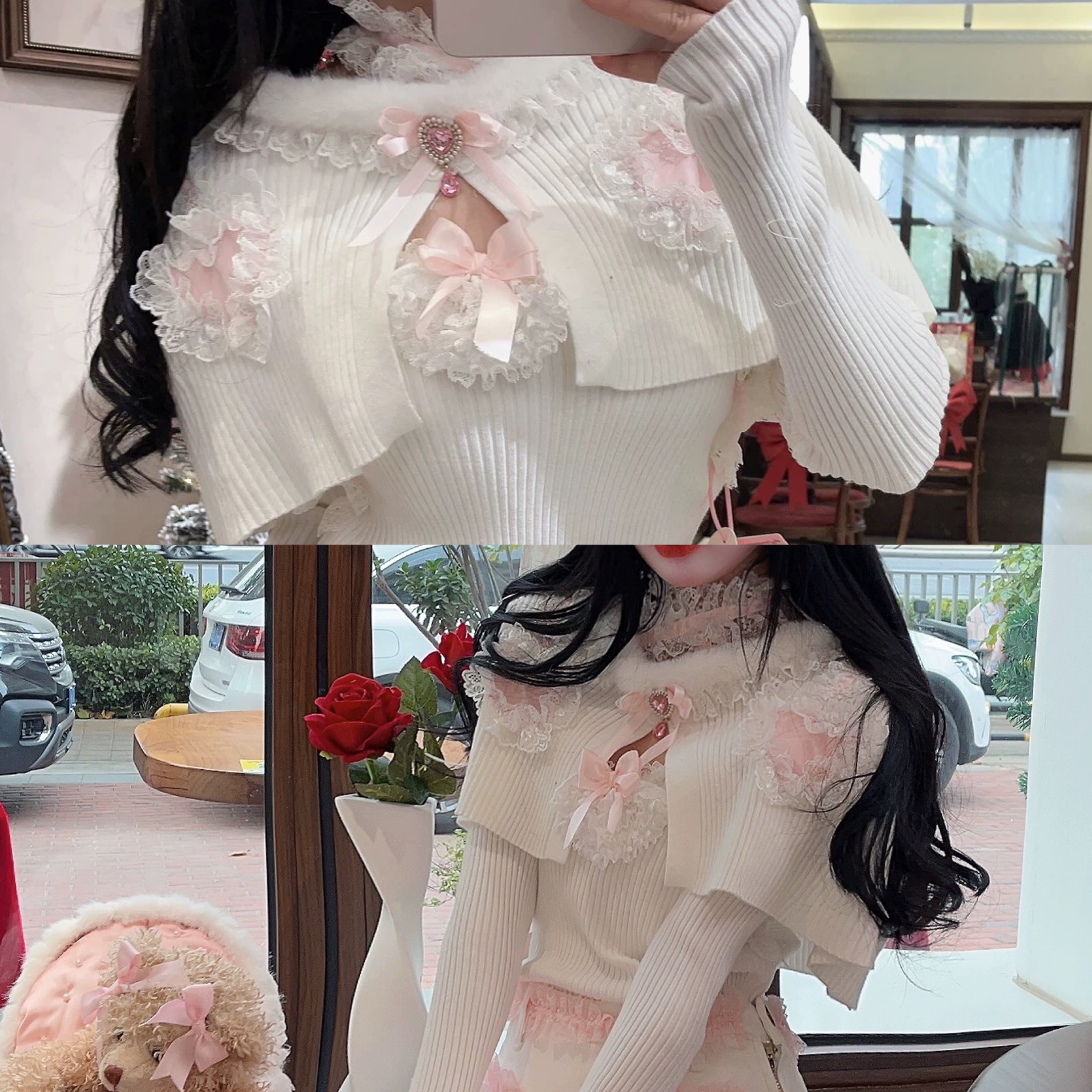【カーディガン】ショート ピンク 白 セーター ガーリー 姫 リボン ピンク 可愛い