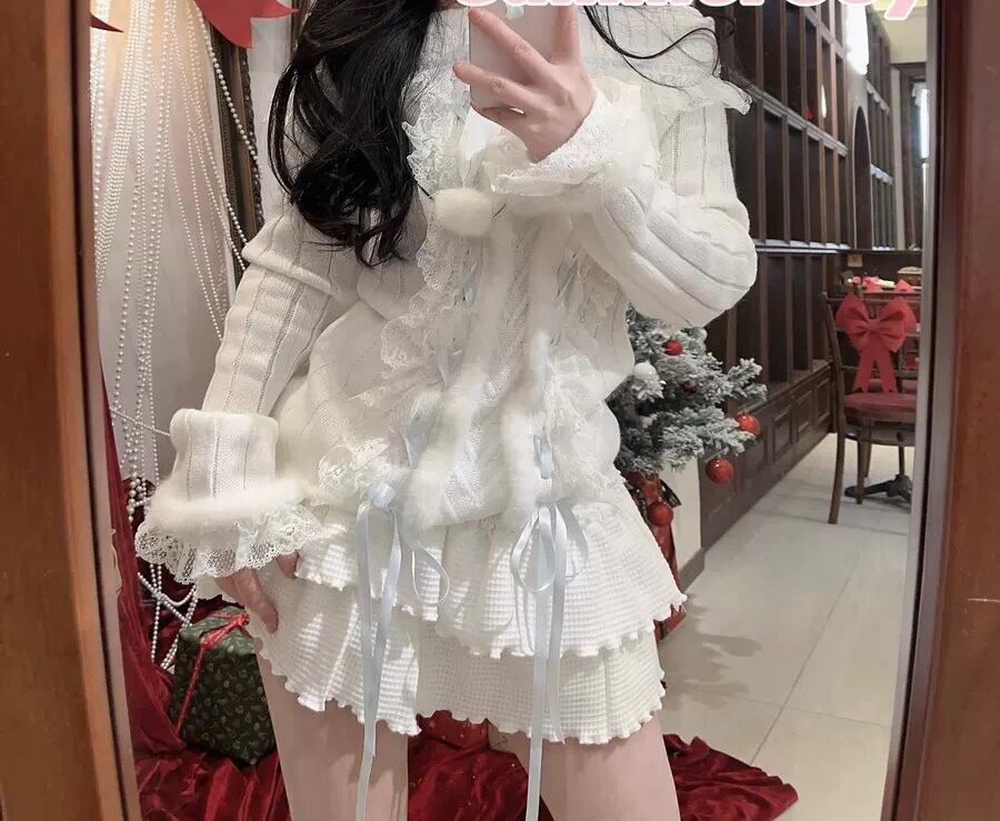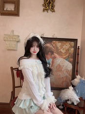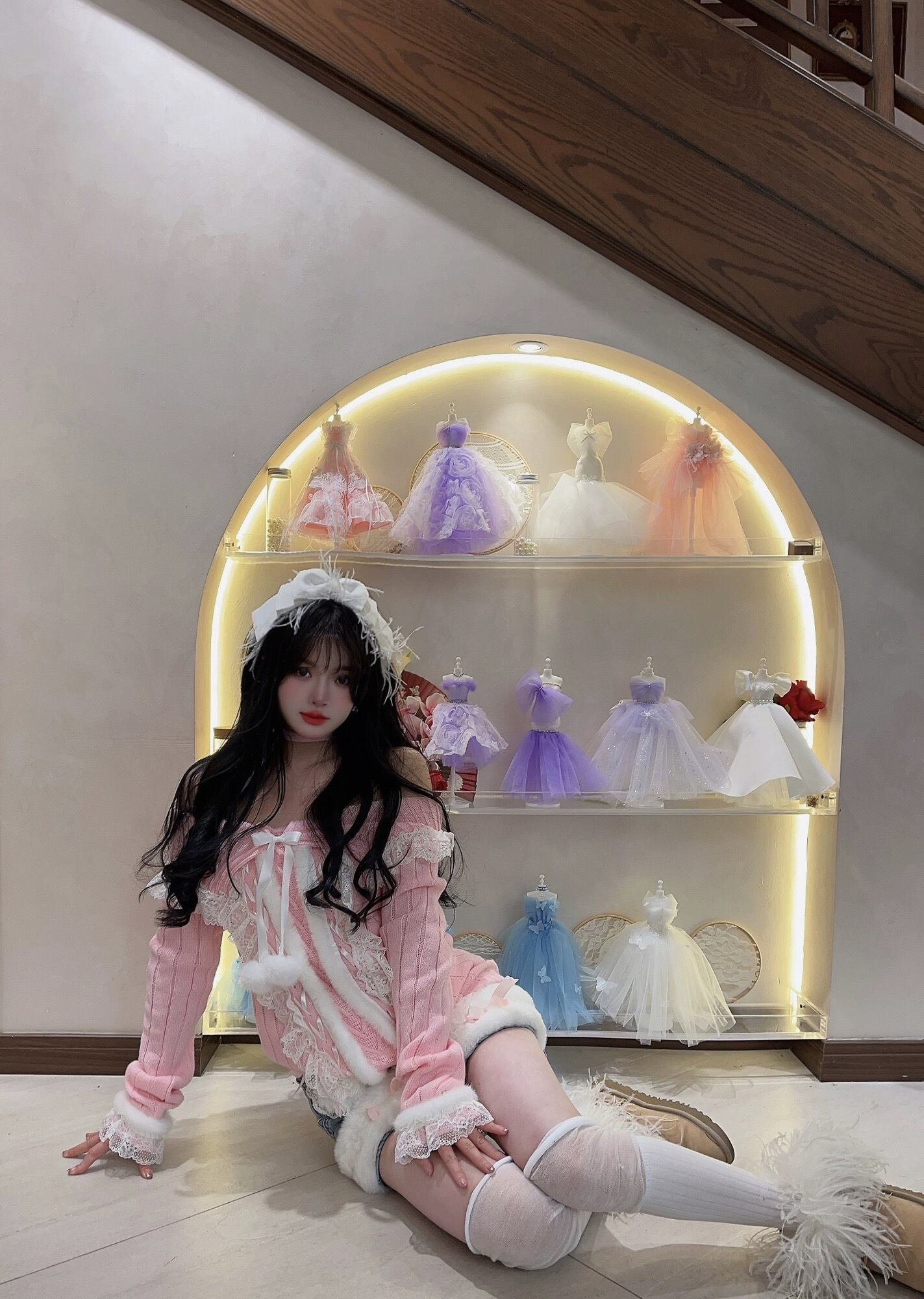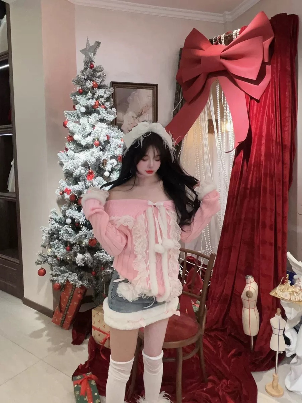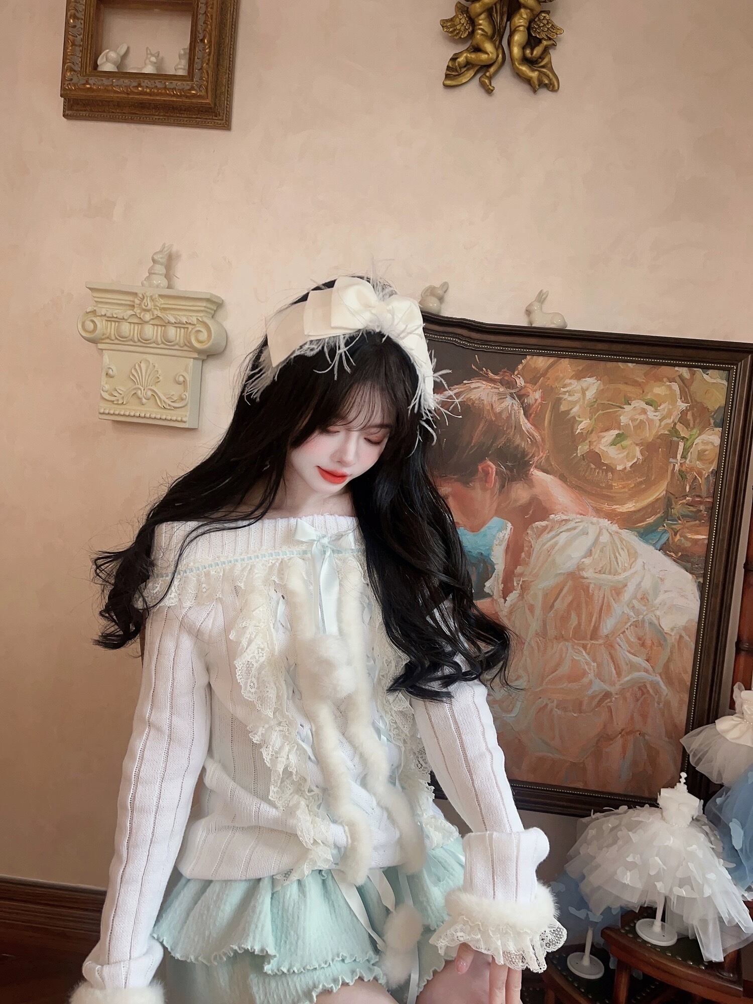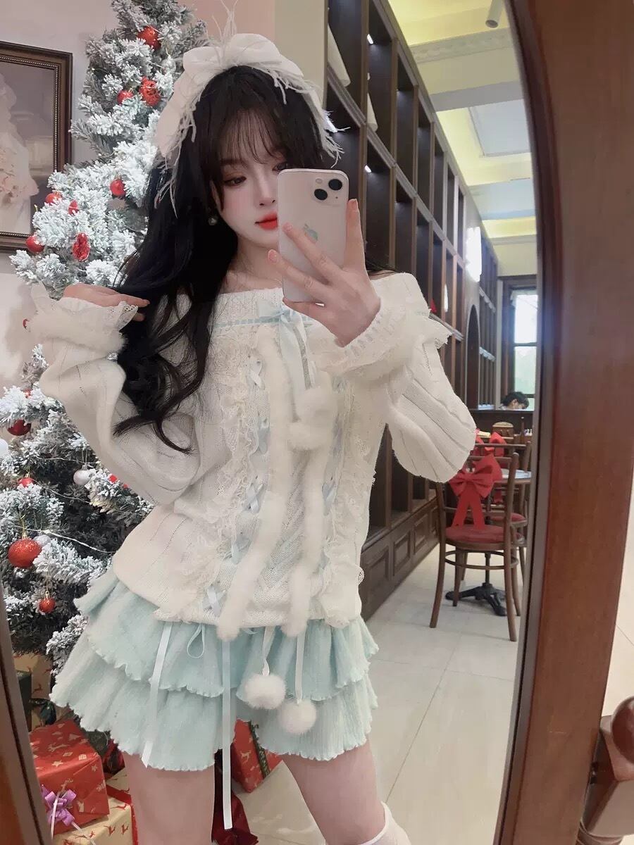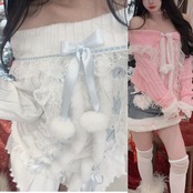 オフショルダー ピンク セーター ニット 白 水色 リボン ガーリー ピンク カーディガン ブラウス 水色 リボン ぽんぽん