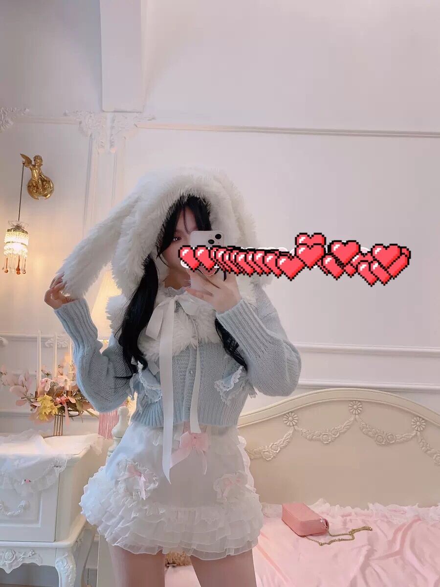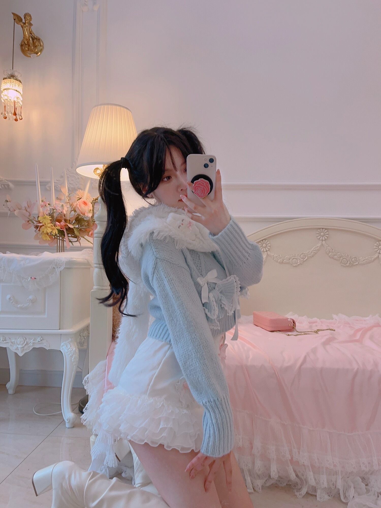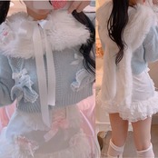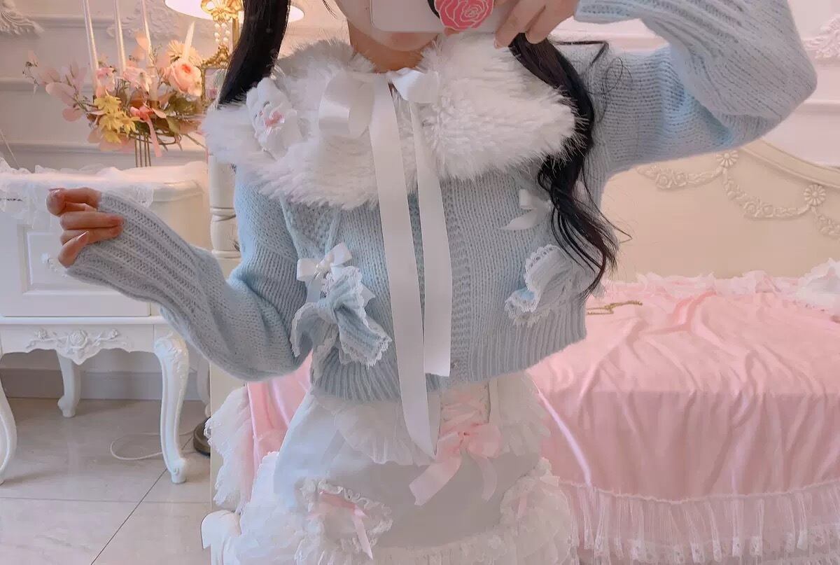 水色 ガーリー うさぎ 丸襟 リボン カーディガン トップス セーター ニット リボン