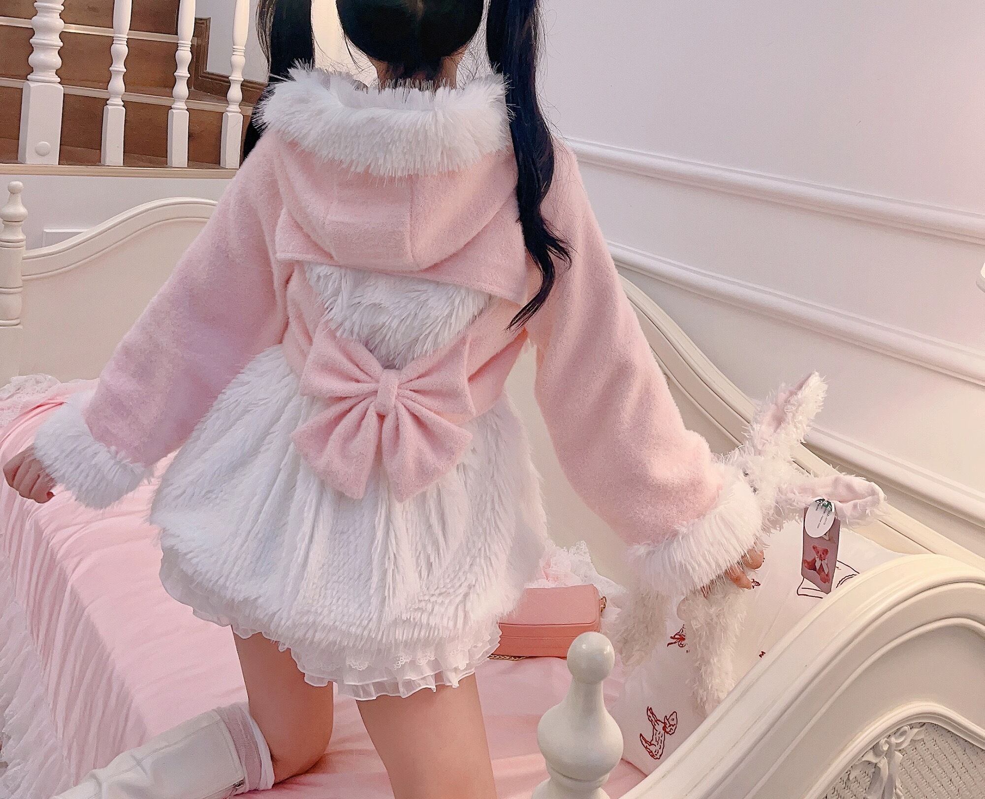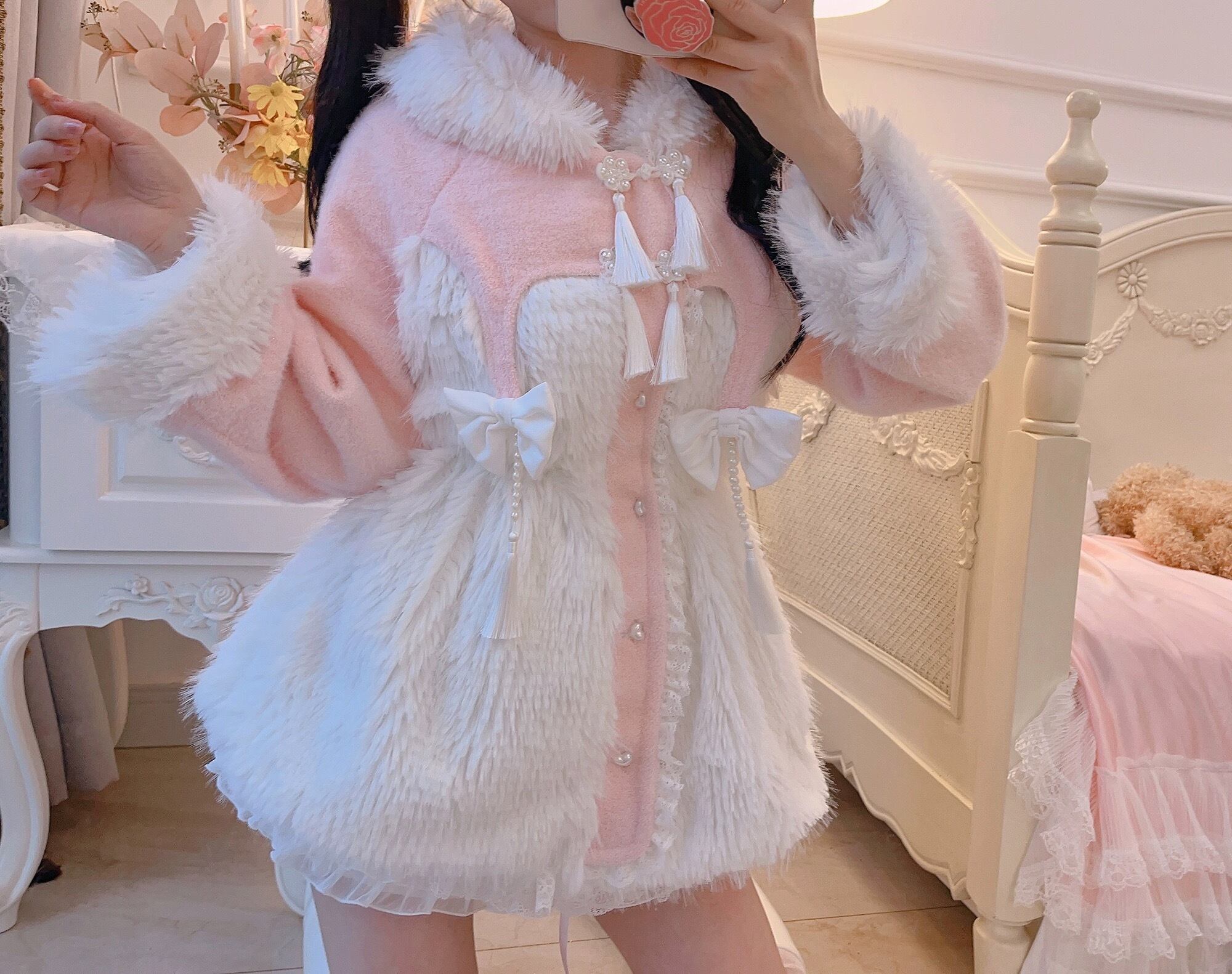 コート ガーリー カーディガン アウター リボン ファー 白 ピンク ワンピース 姫