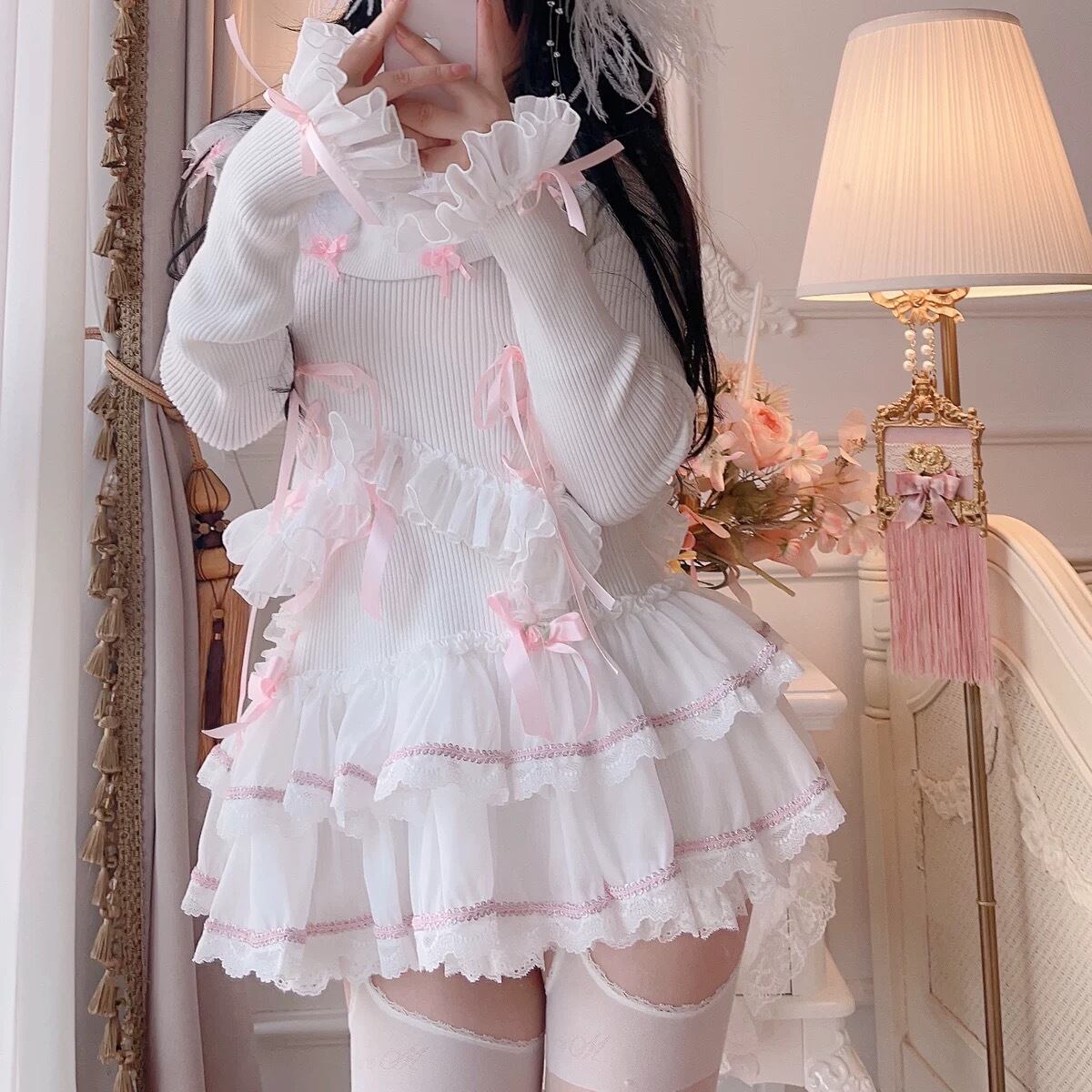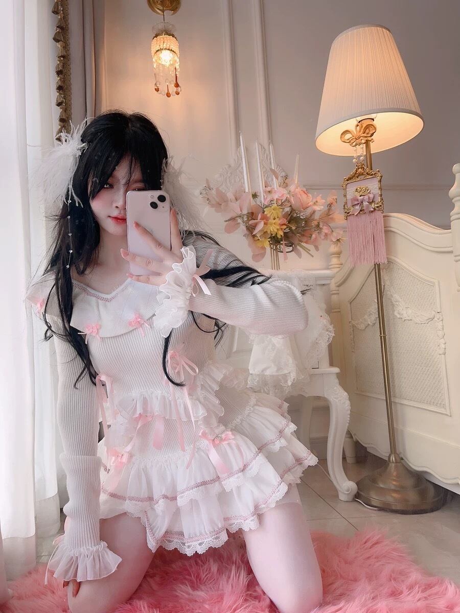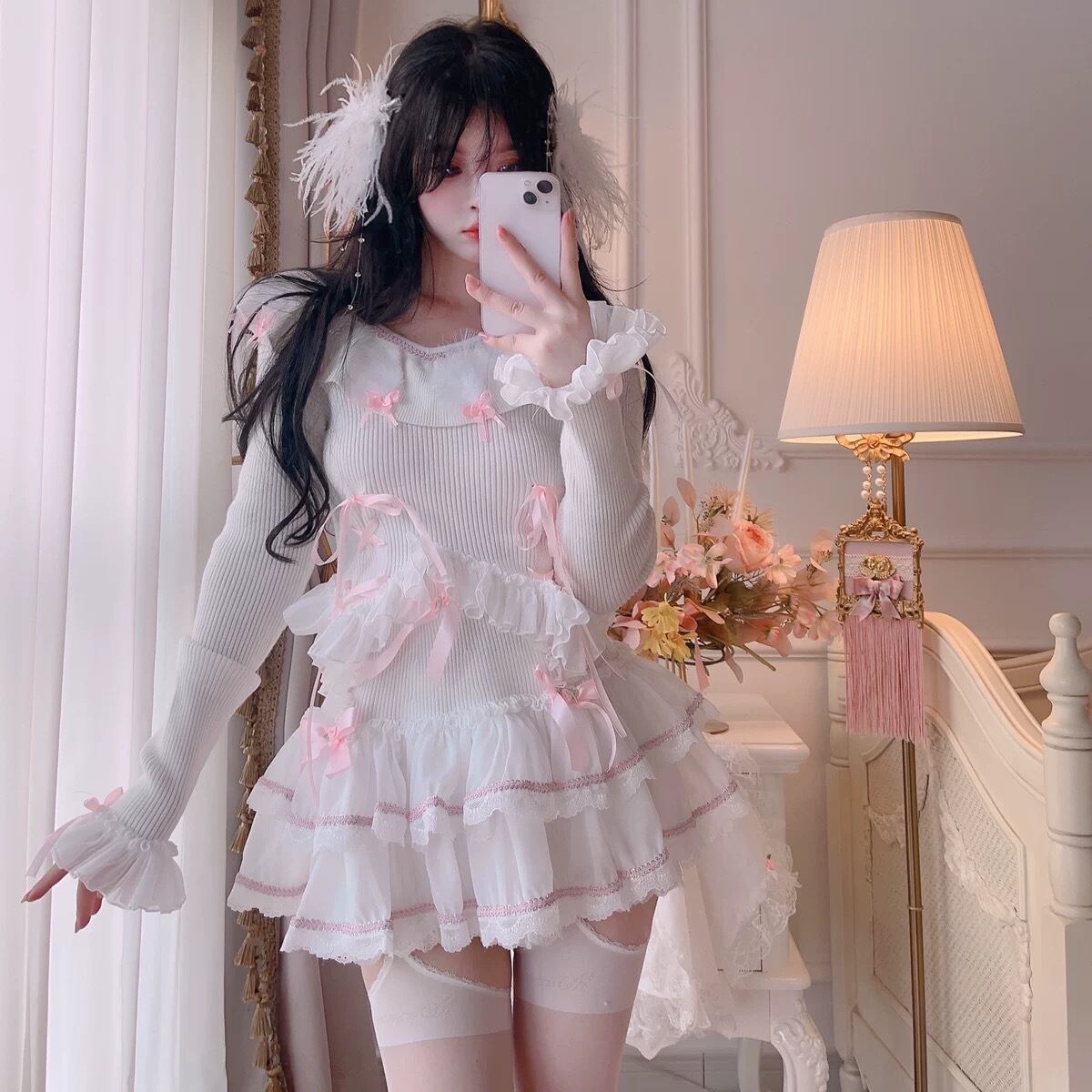 ブラウス ニット スカート 白 ピンク リボン ガーリー カーディガン ニット ブラウス ミニスカート 姫 ロリータ