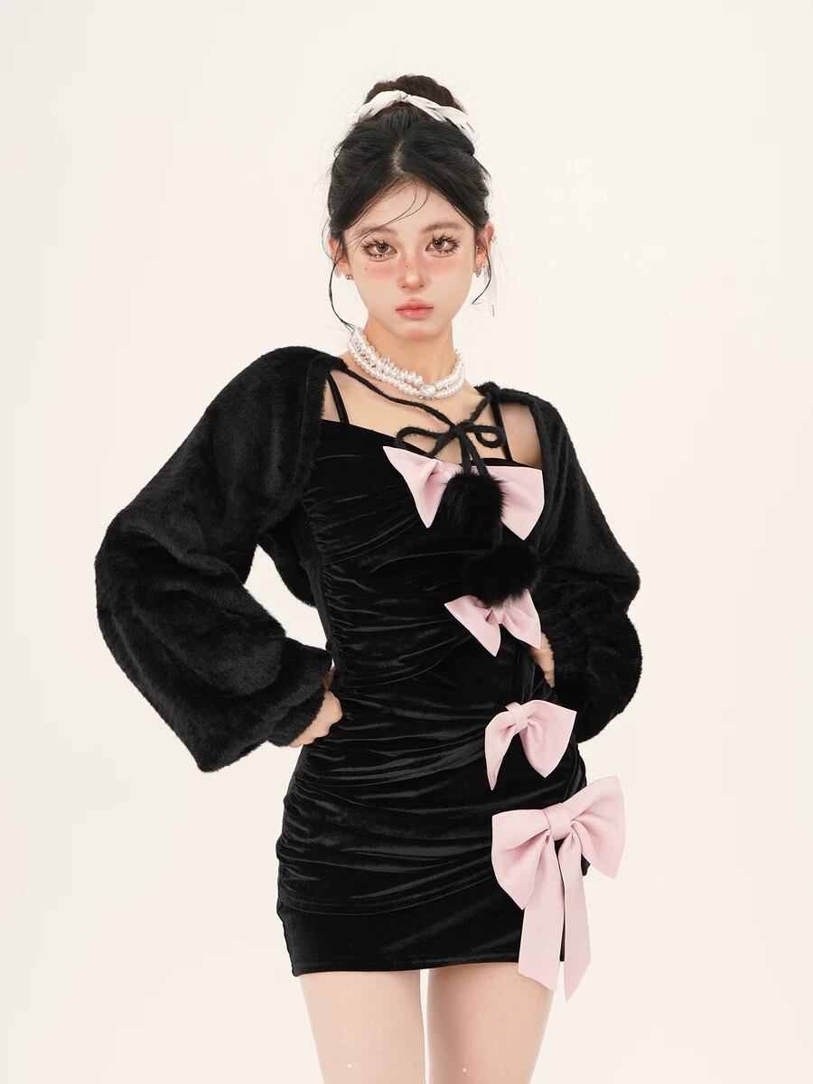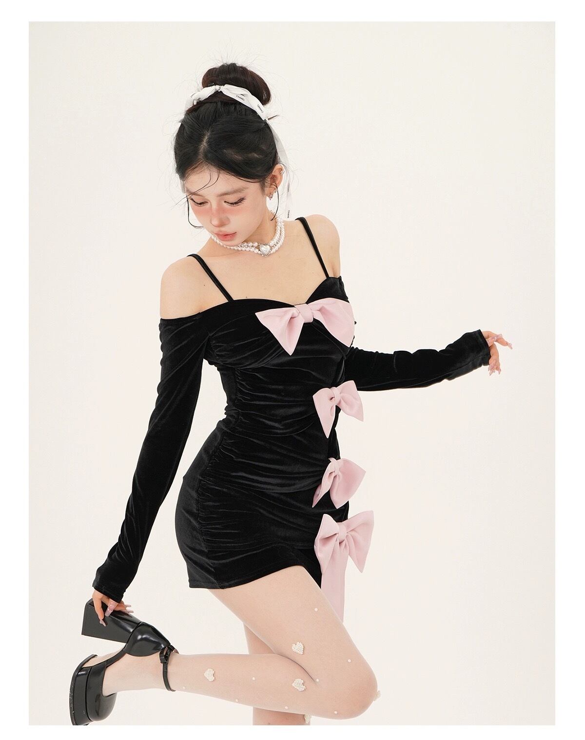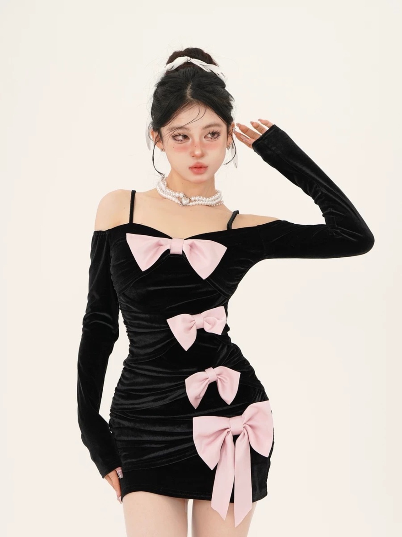 黒 オフショルダー ピンク リボン ワンピース ガーリー ドレス エレガント お嬢様 ベロア