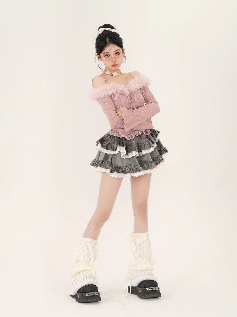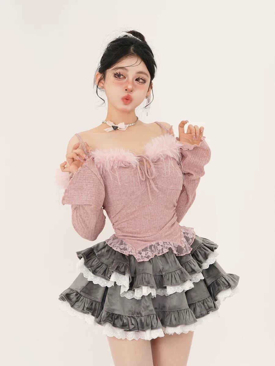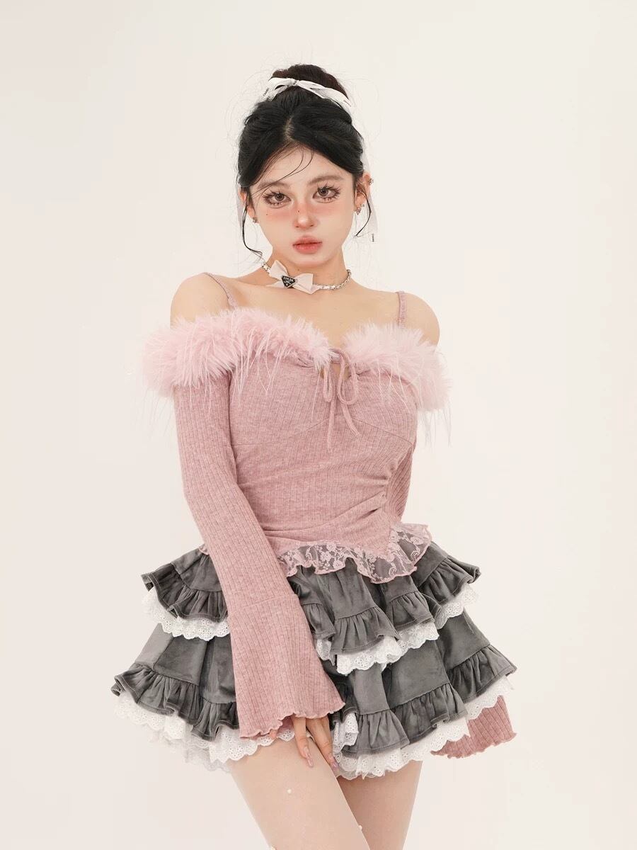 オフショルダー ピンク セーター ブラウス ガーリー カーディガン ファー リボン トップス