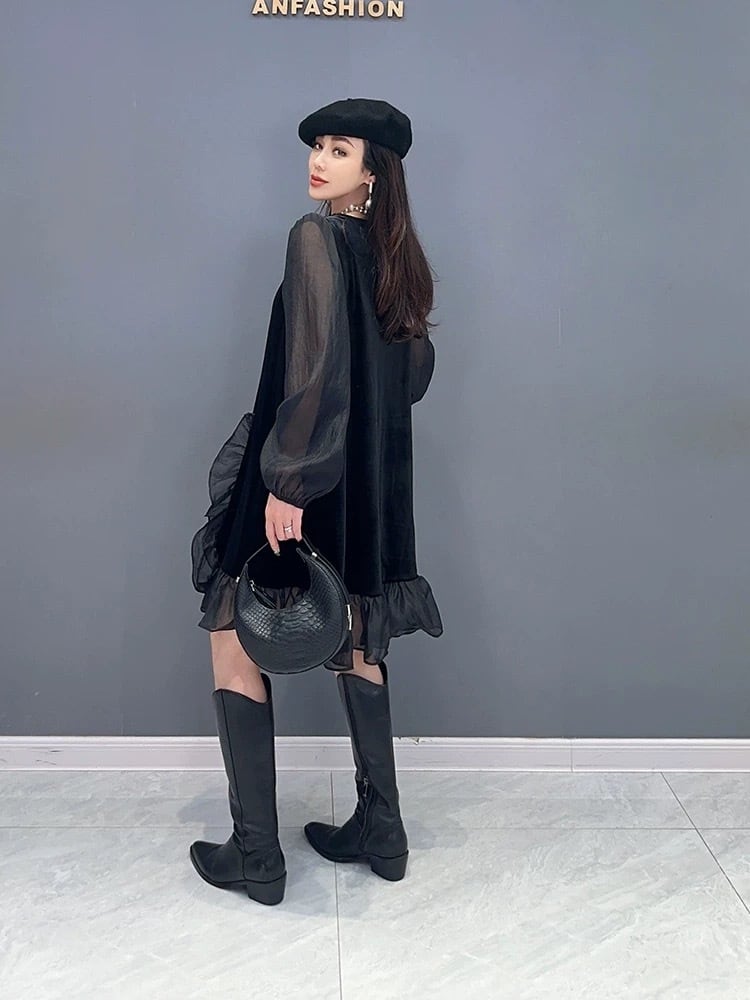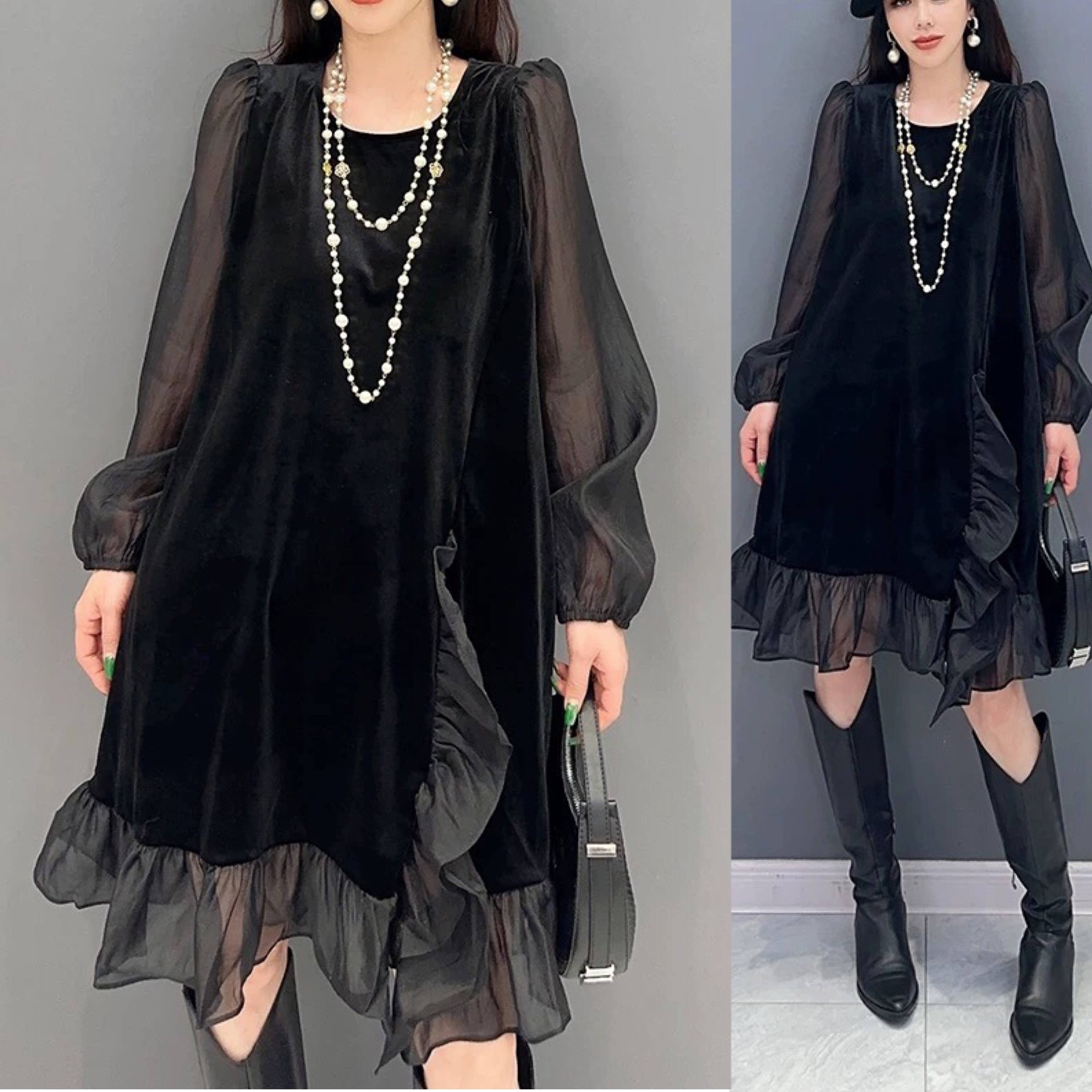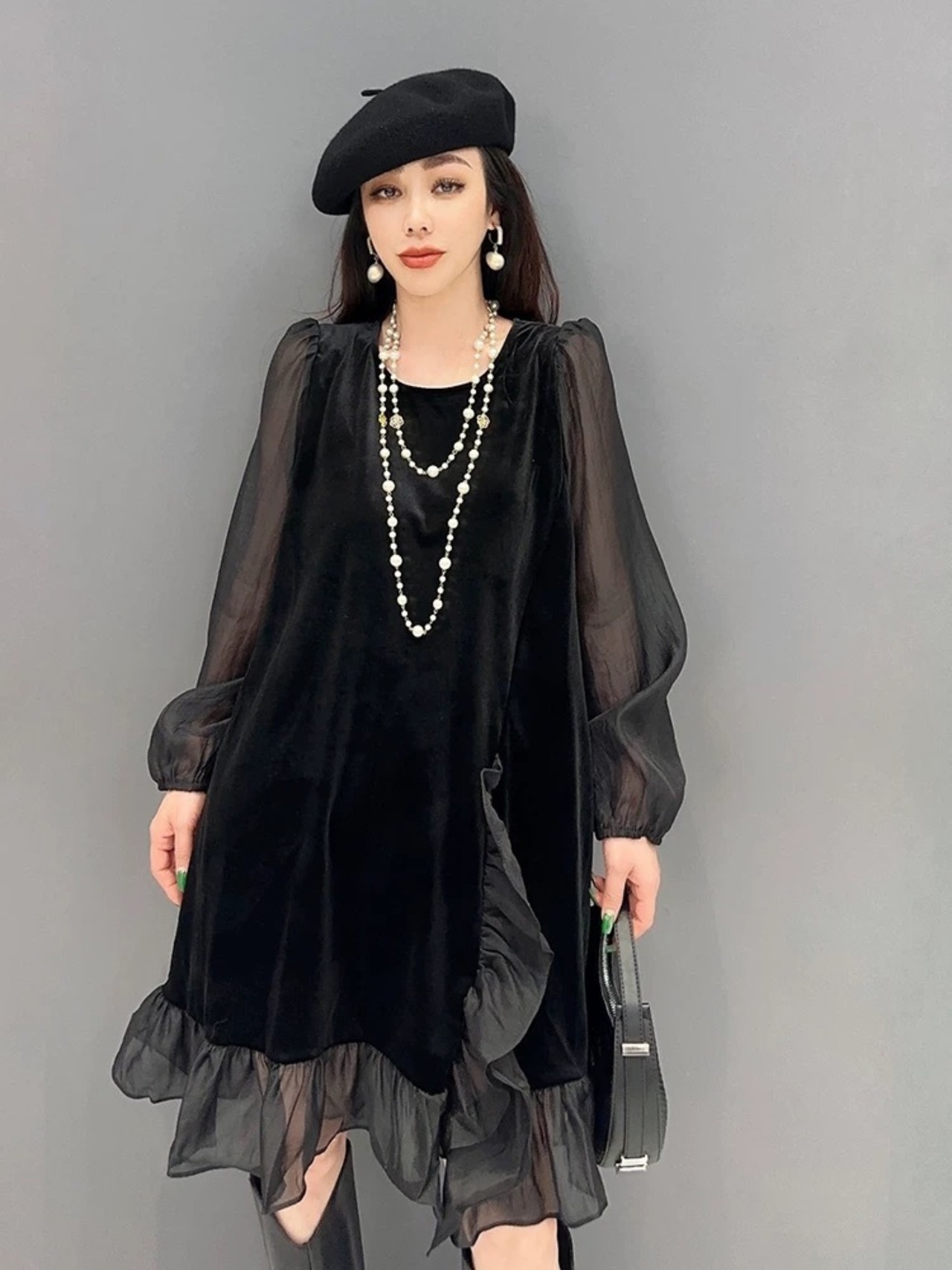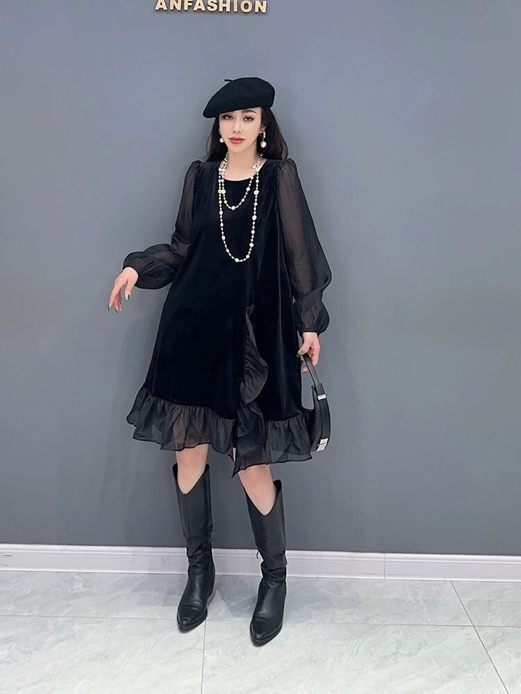 黒 ゆったり ベルベット ブラウス 膝丈 ブラック XL ワンピース