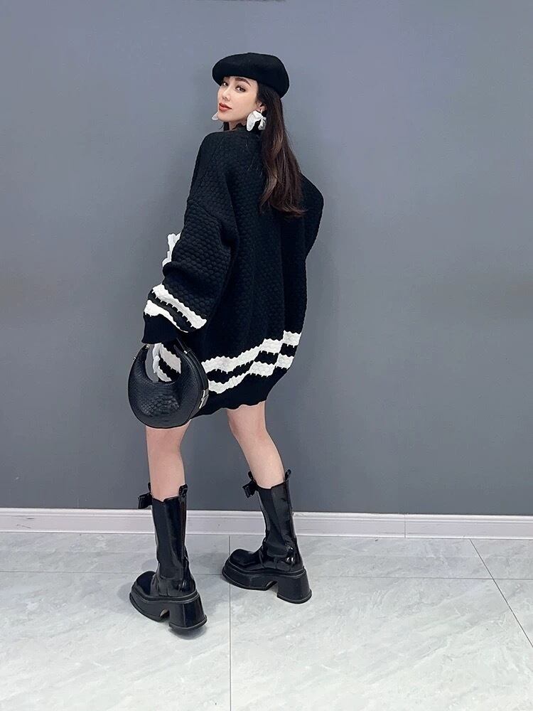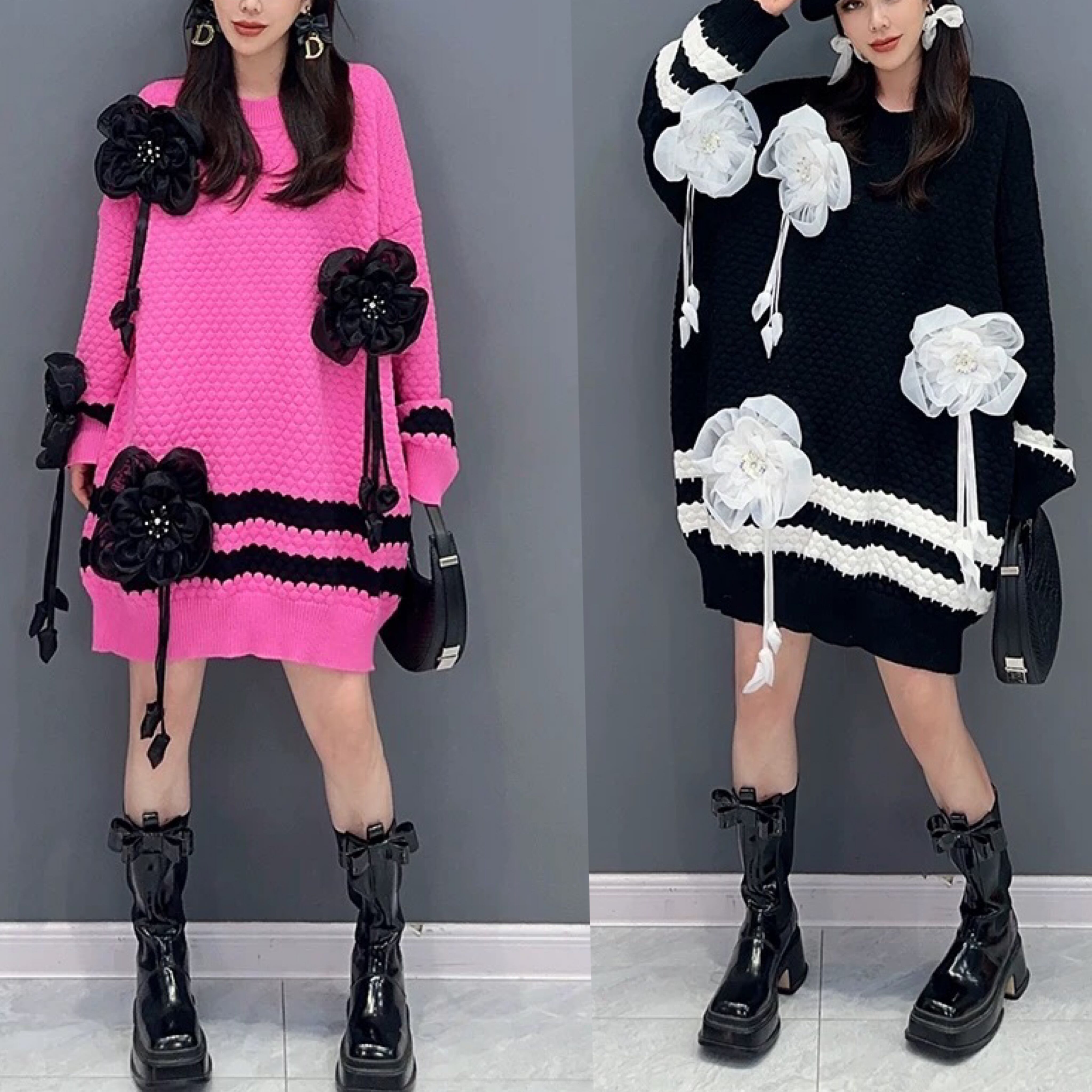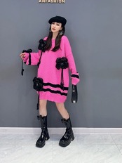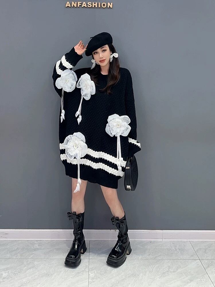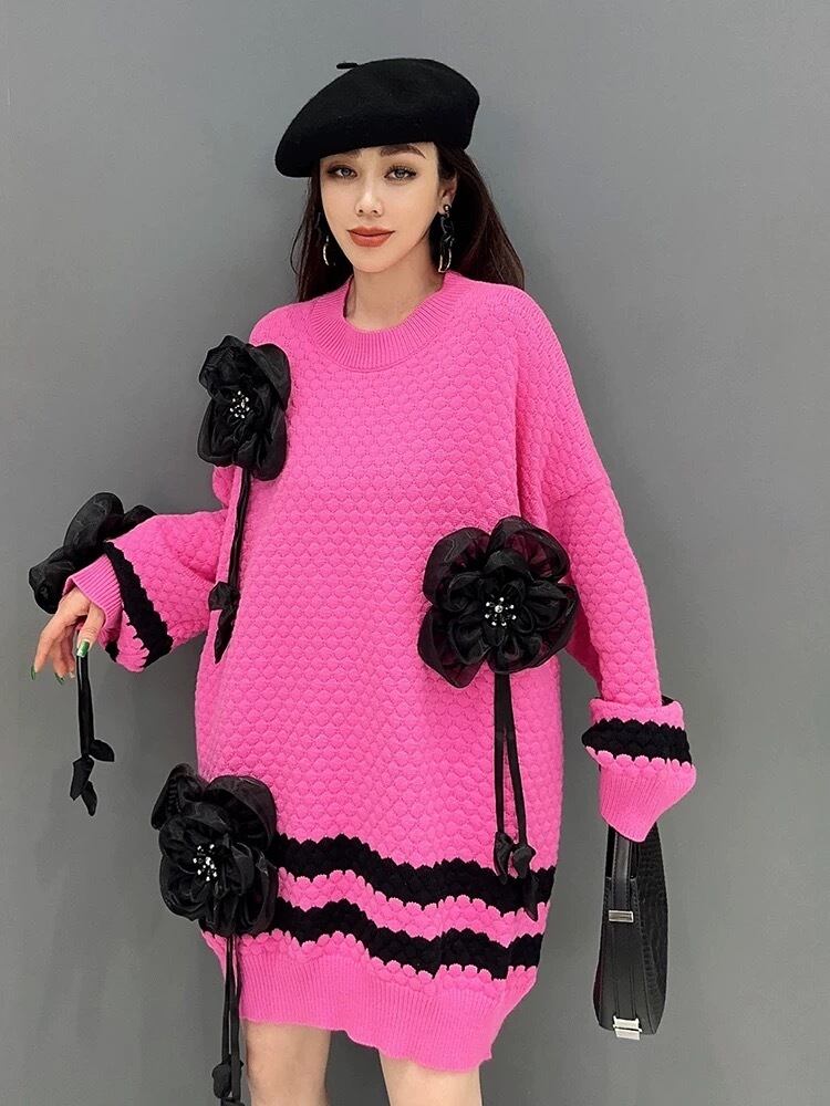 ワンピース 花柄 ピンク 白 ニット セーター フラワー デコレーション ワンピース
