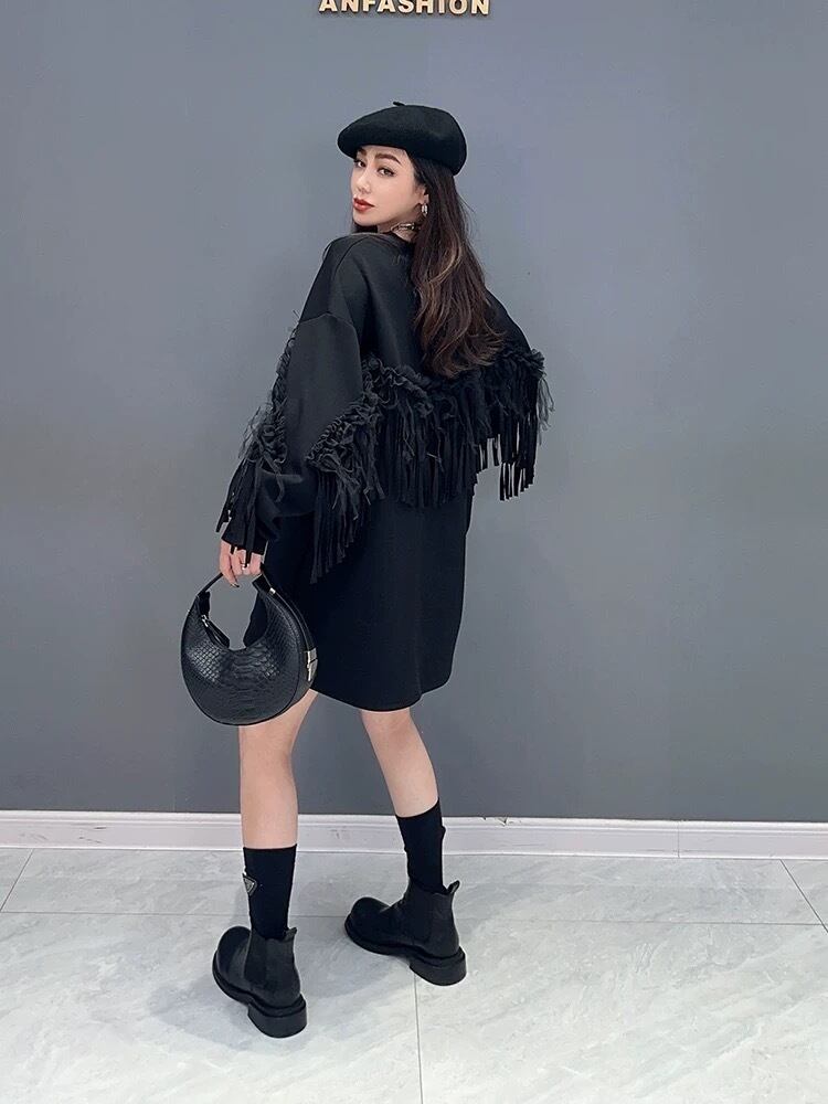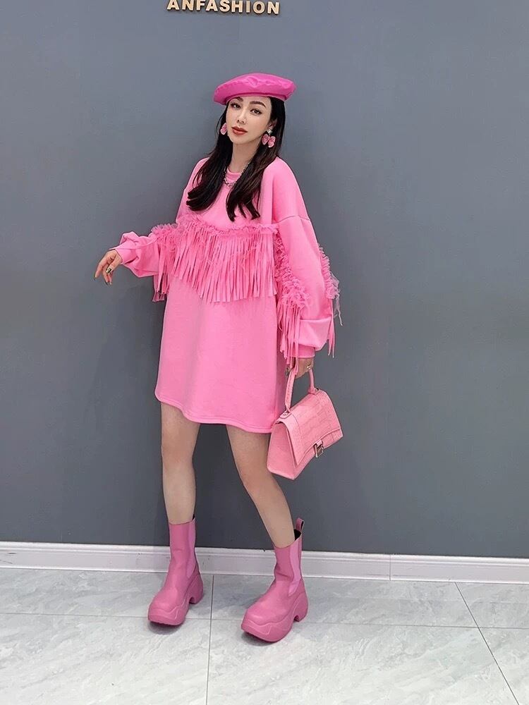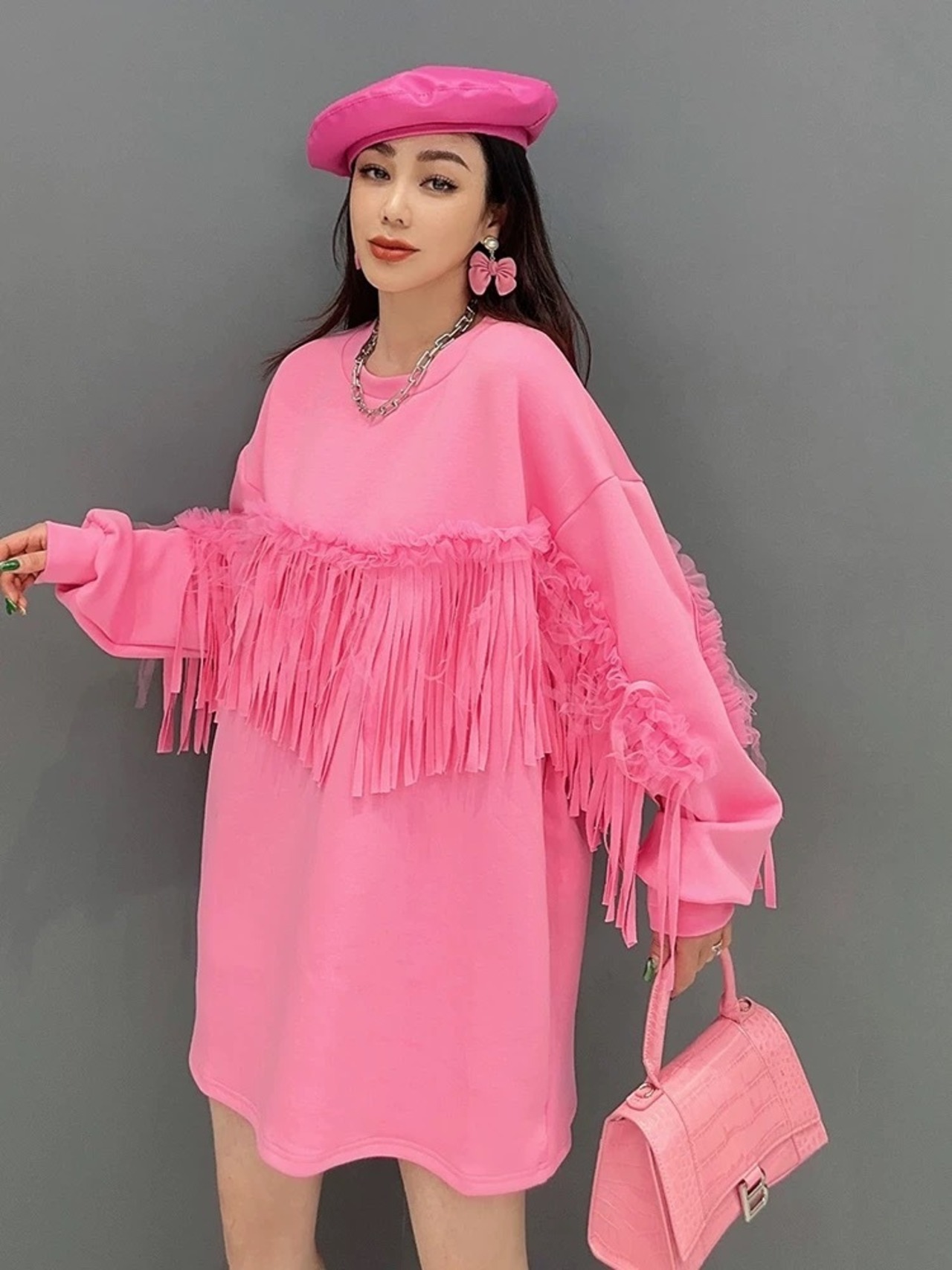 カジュアル セーター スウェット トレーナー ピンク フリンジ 黒 トップス ワンピース XL