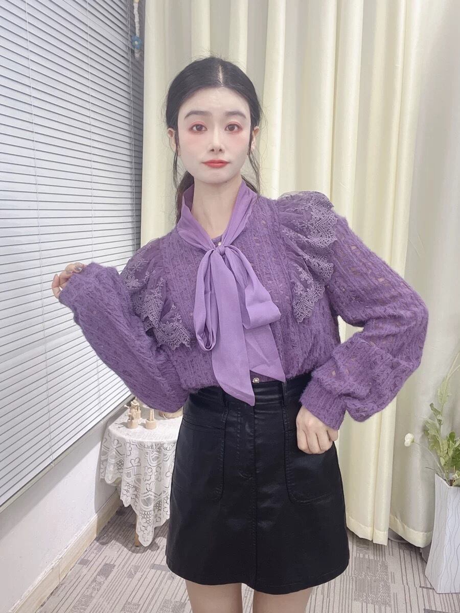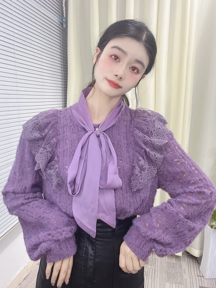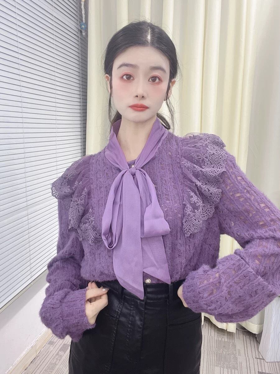 ブラウス ベージュ 緑 紫 リボン カジュアル レース トップス ガーリー エレガント シャツ