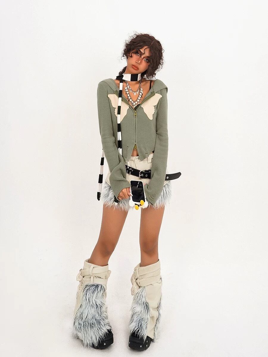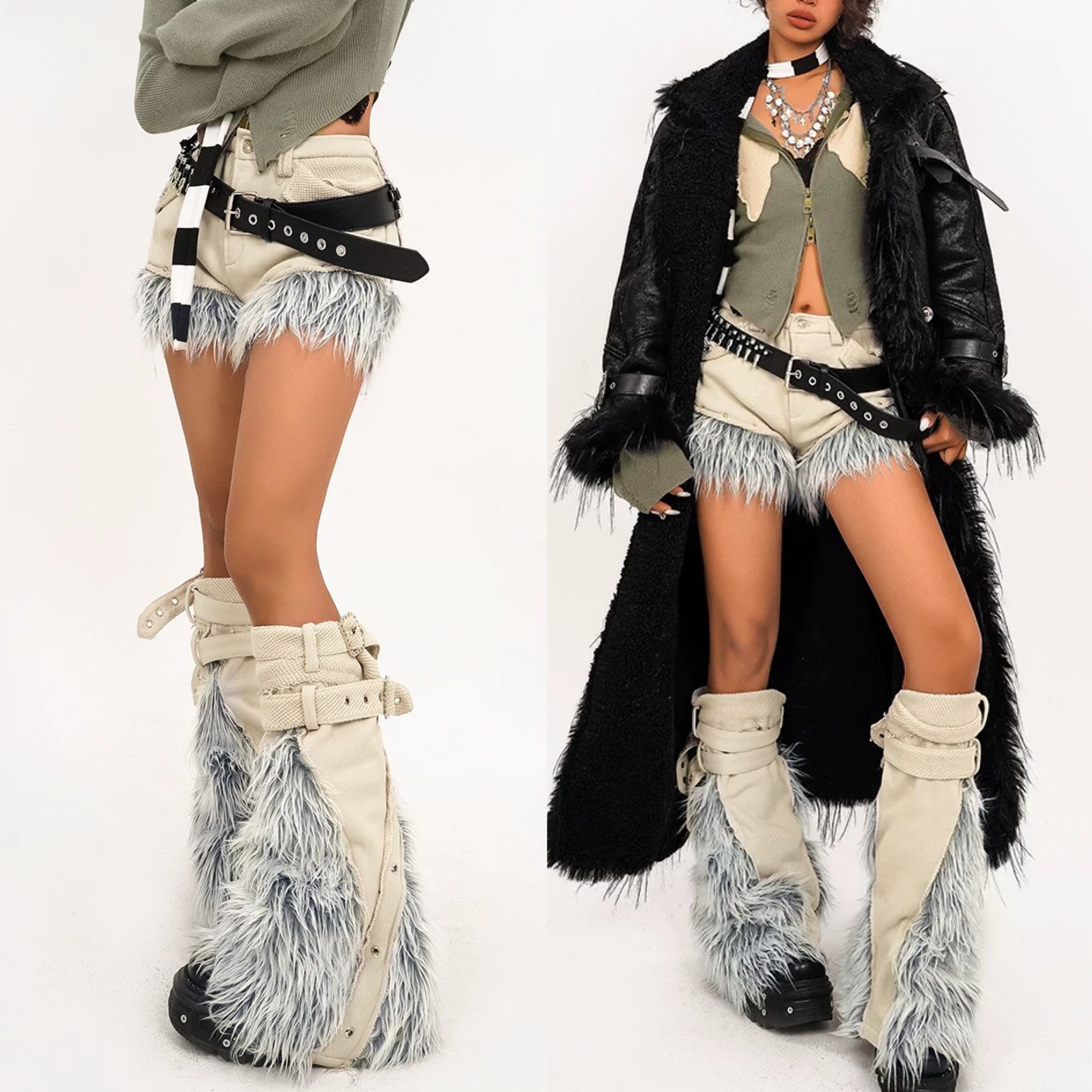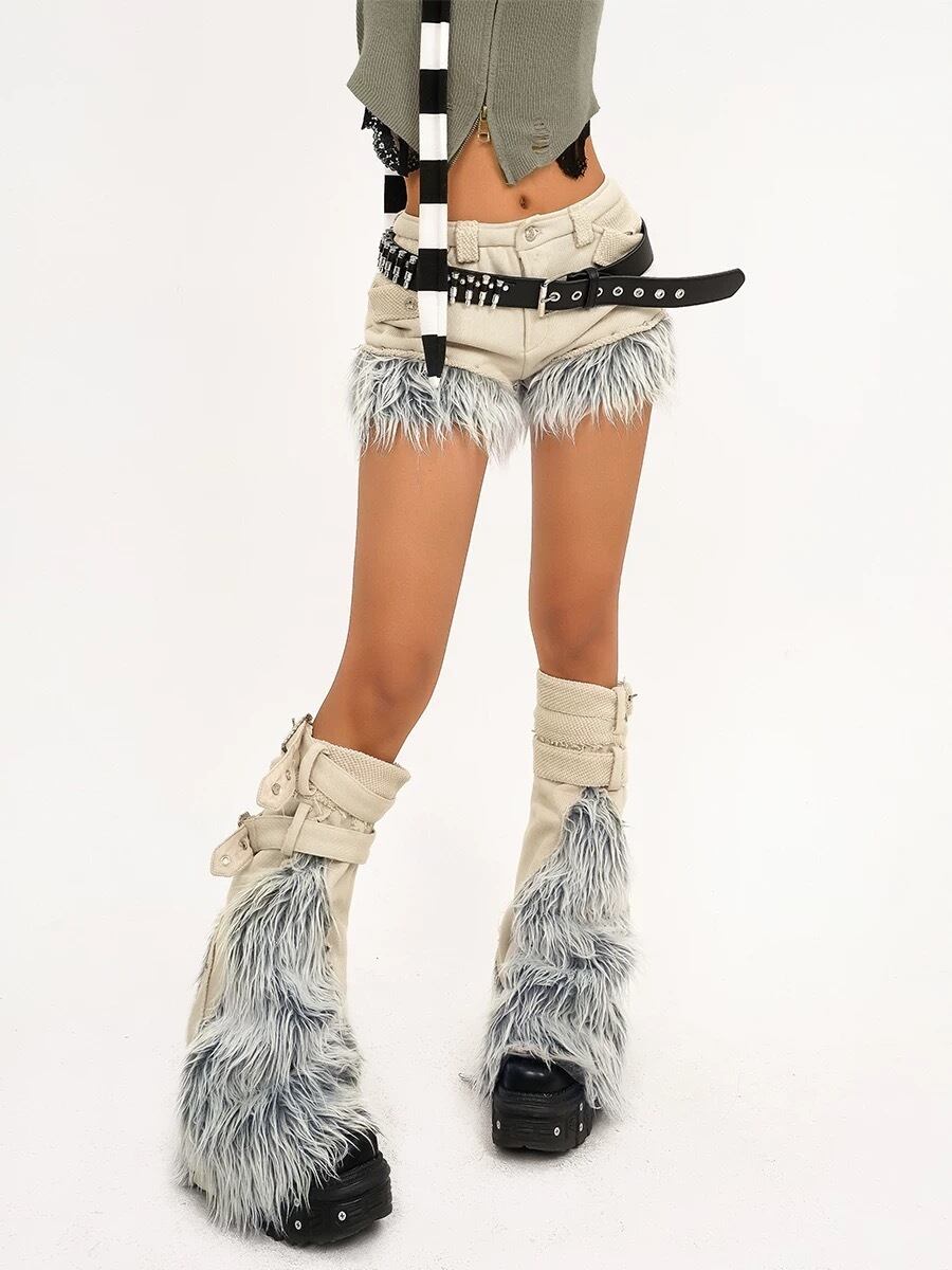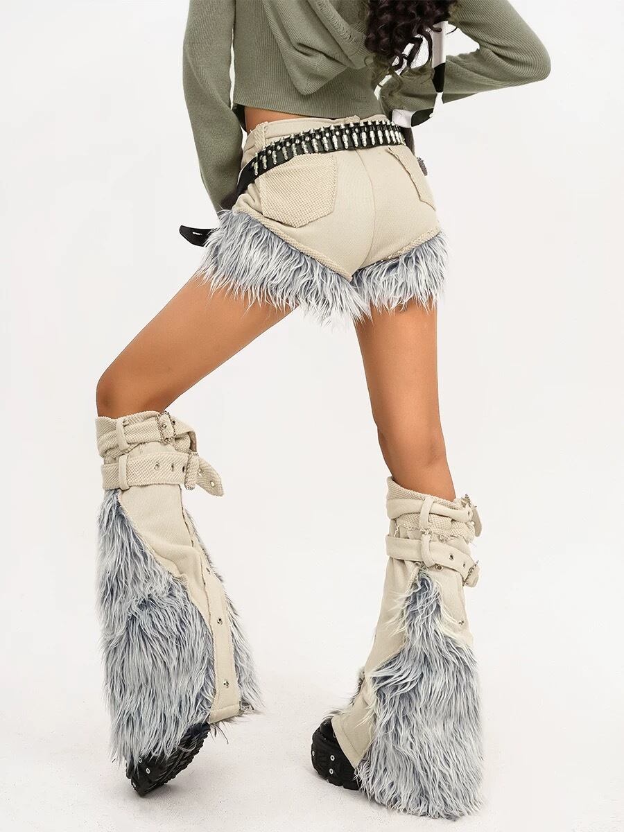 【レッグウォーマーセット】デニム ファー 水色 ベージュ ストリート ボトムス 短パン ホットパンツ ミニスカート ストリート ダンス