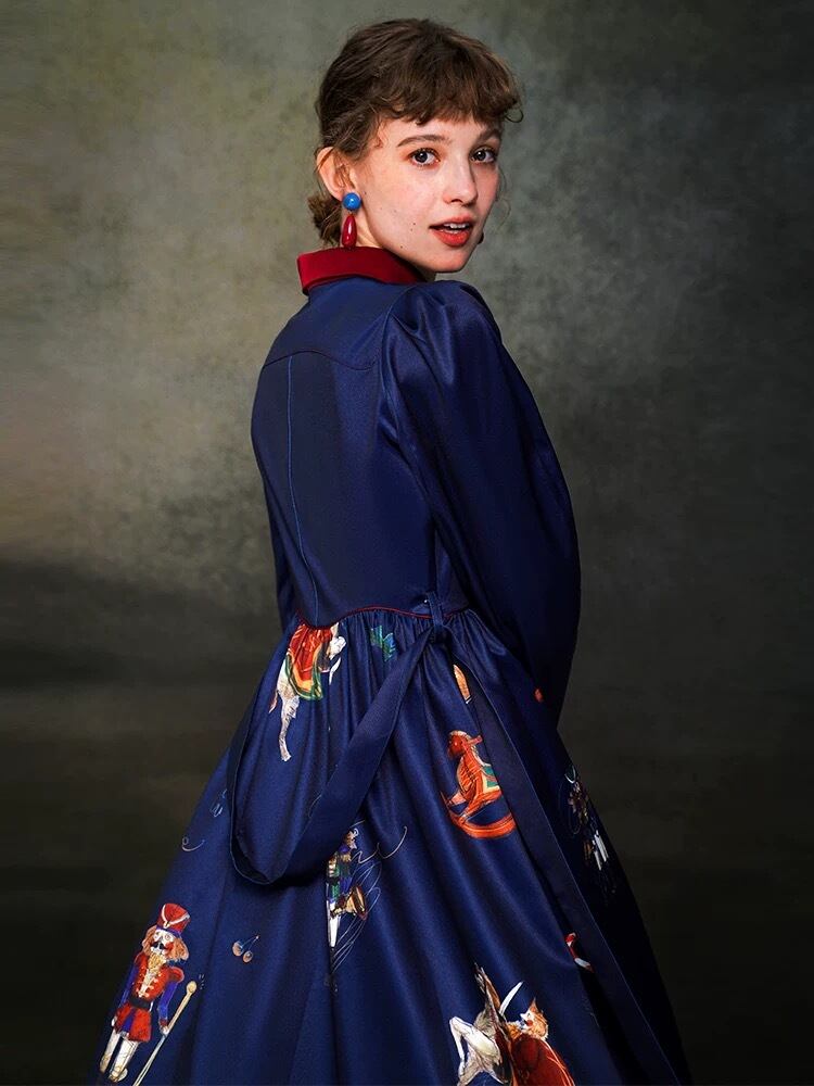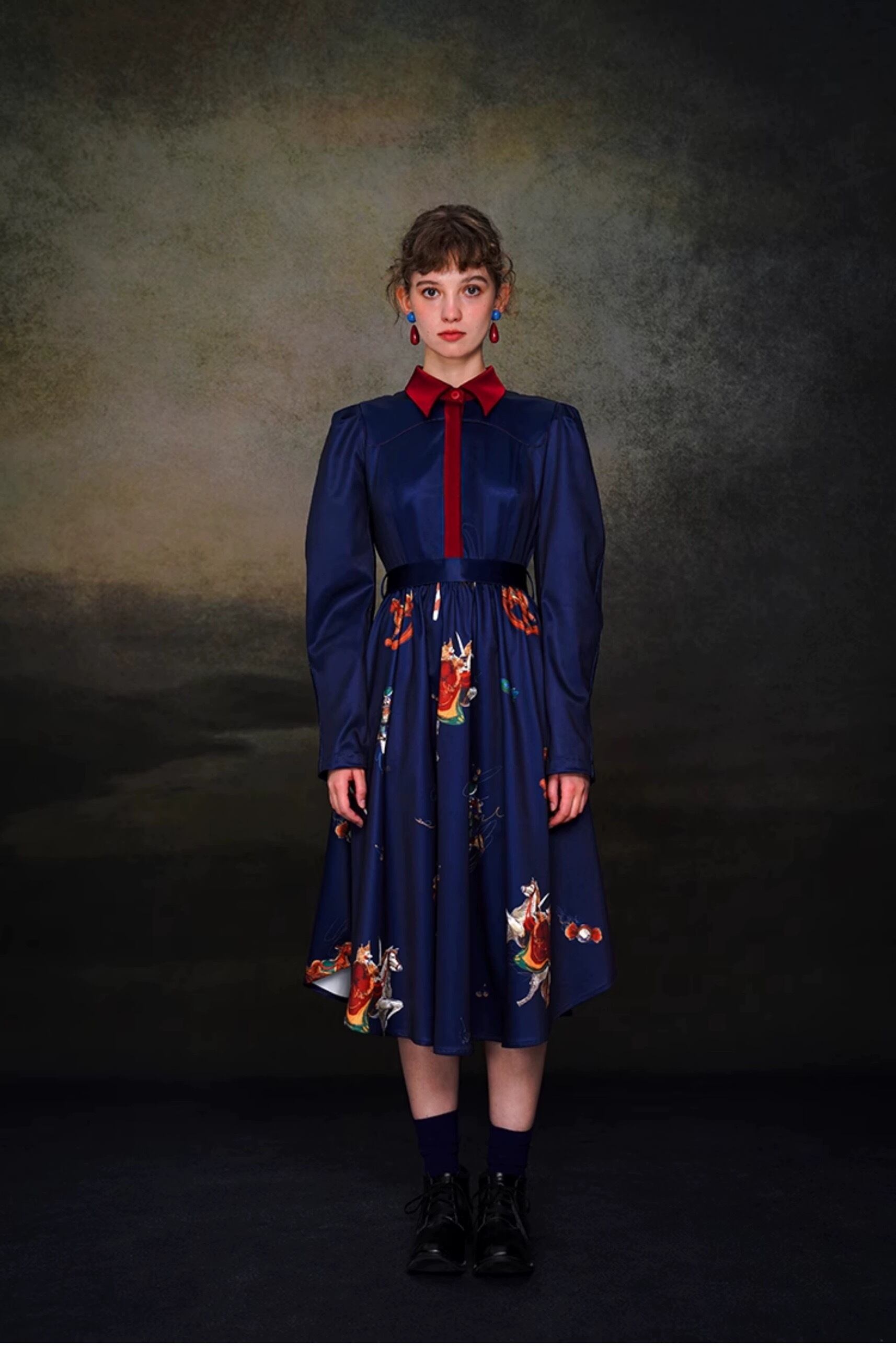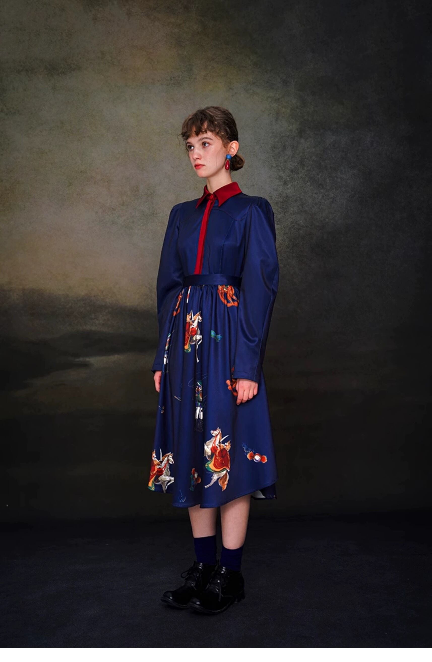 ネイビー 紺色 ブルー ブラウス 刺繍 花柄 フラワー 赤 ガーリー お嬢様