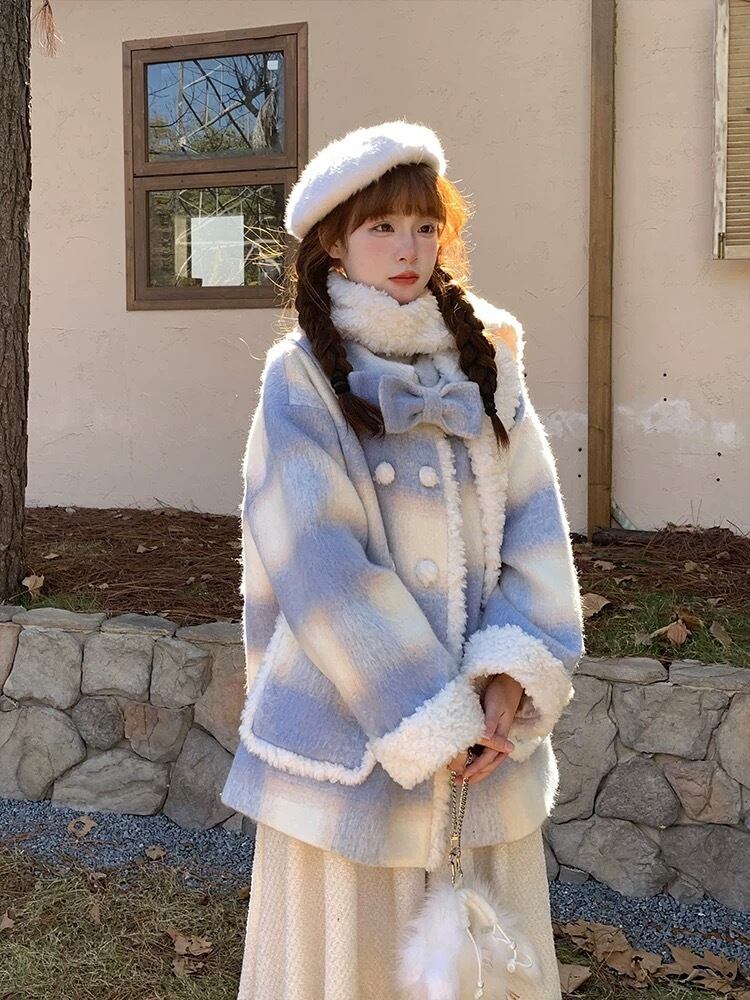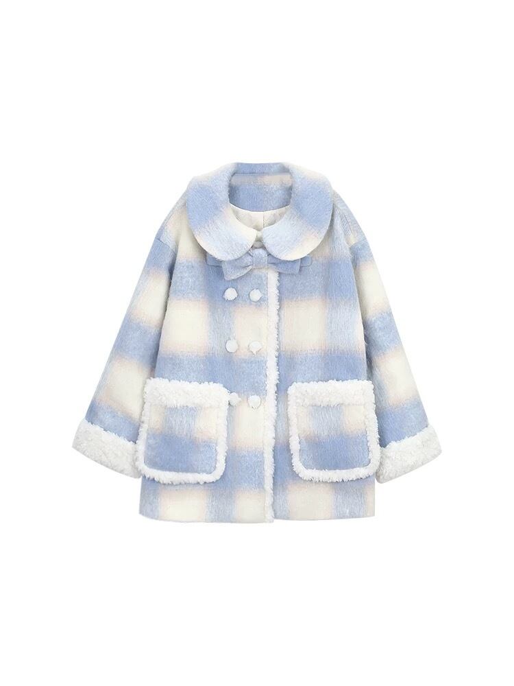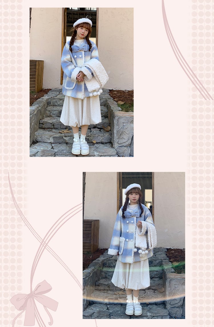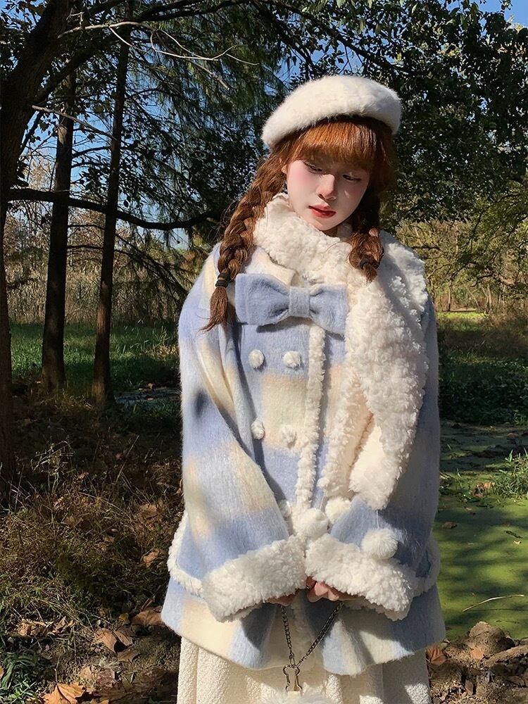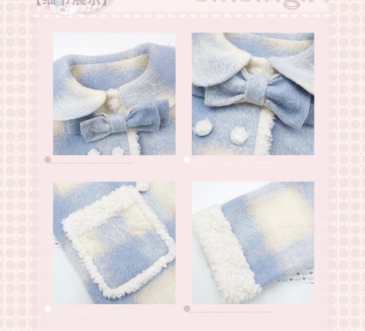 水色 チェック アウター ガーリー コート カーディガン ジャケット ワンピース リボン ファー 可愛い