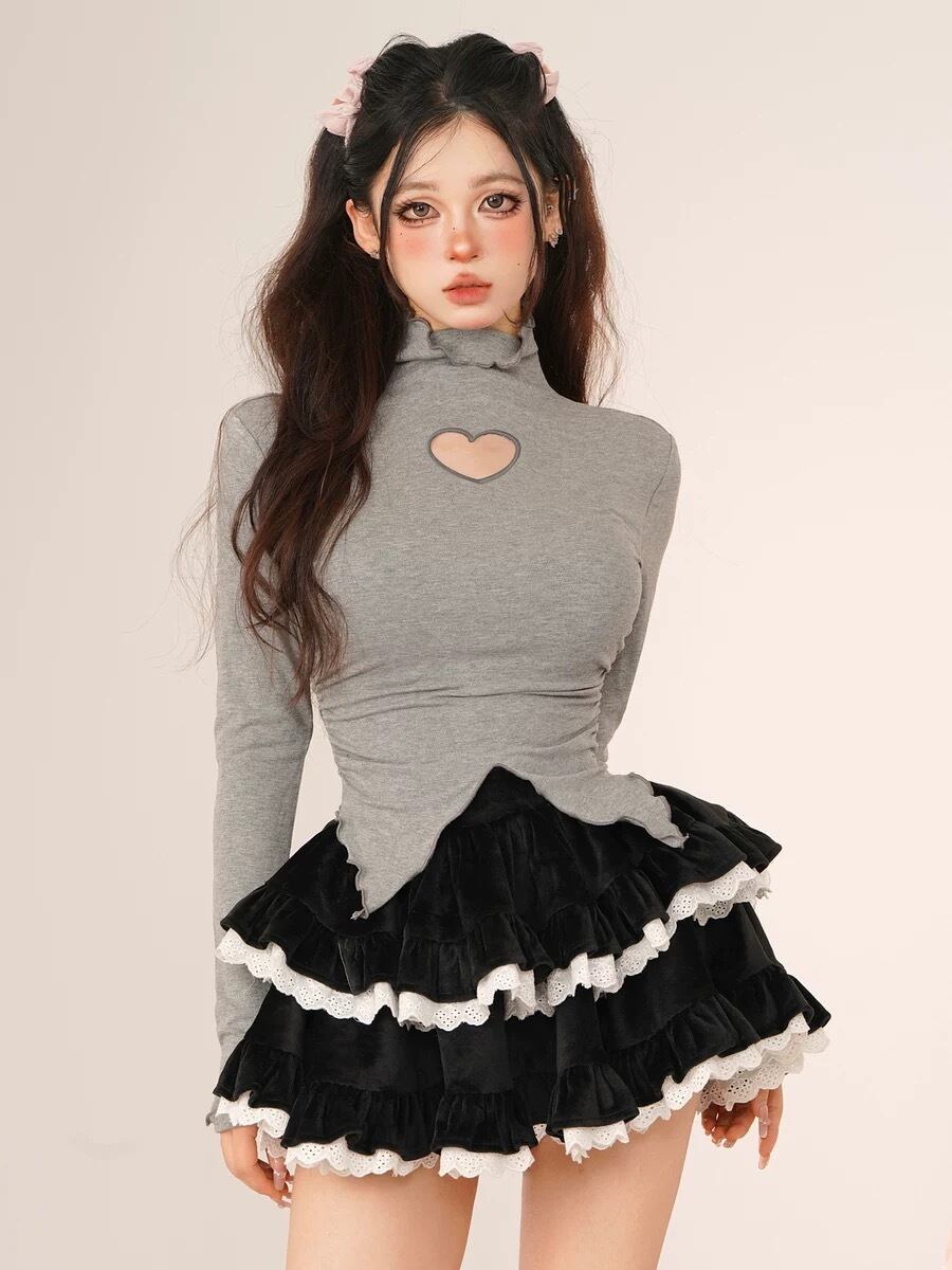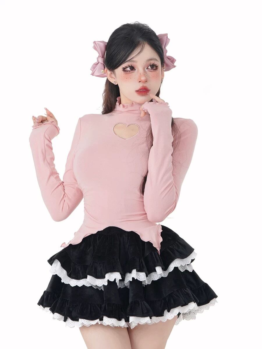 ハート 可愛い ガーリー ブラウス トップス シャツ エレガント カジュアル Tシャツ 茶色 ピンク 白 黒 グレー